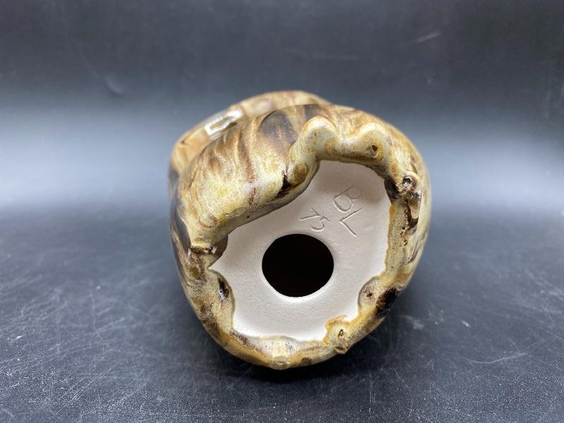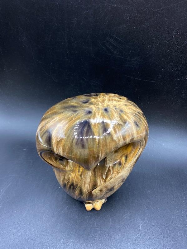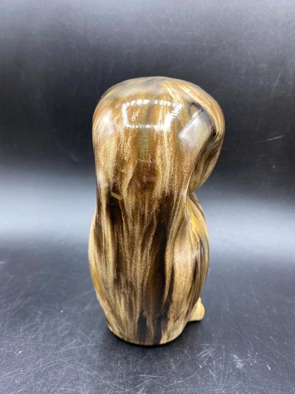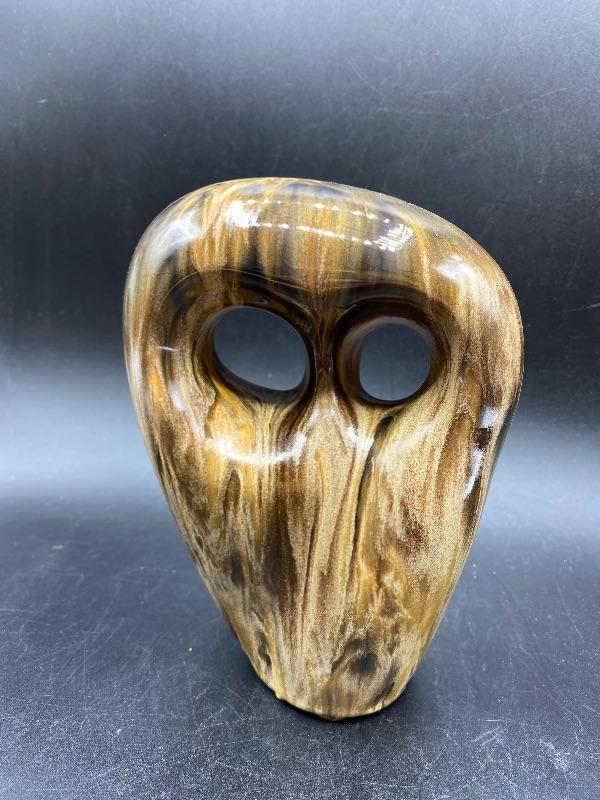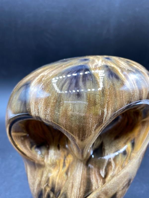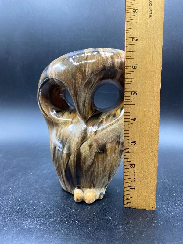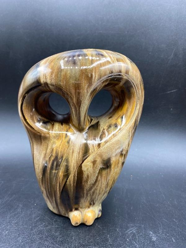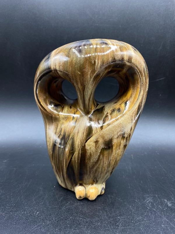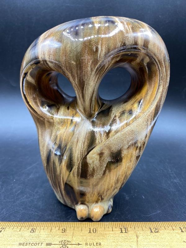 Vintage 1975 owl figurine. Has a wonderful mixed brown dripware streaked finish. There is some crazing in the glaze. Hollow eyes let light thru. Beautiful piece of pottery. Stands about 7" tall. Signed on the bottom with the initials and date "BL 75". No chips or damage only crazing.