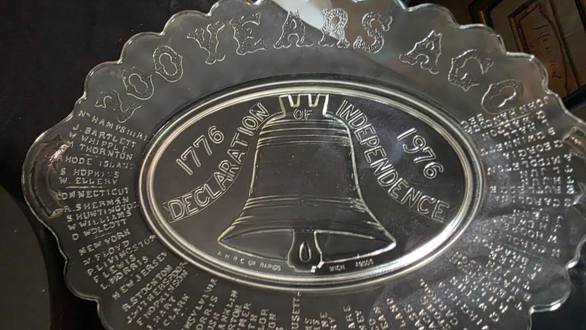 The glass itself is weighty and substantial with a scalloped edge, miniature handles, and a shape that reads as both serving ware and display art. Collectors often use these trays as wall décor, bar cart accents, patriotic display pieces, or table centerpieces for Independence Day celebrations. The platter’s clarity and sculpting allow light to pass across its surface, creating reflections that highlight each engraved name and line of text. It is history rendered in glass—made not to fade, but to be kept, displayed, and passed along.
