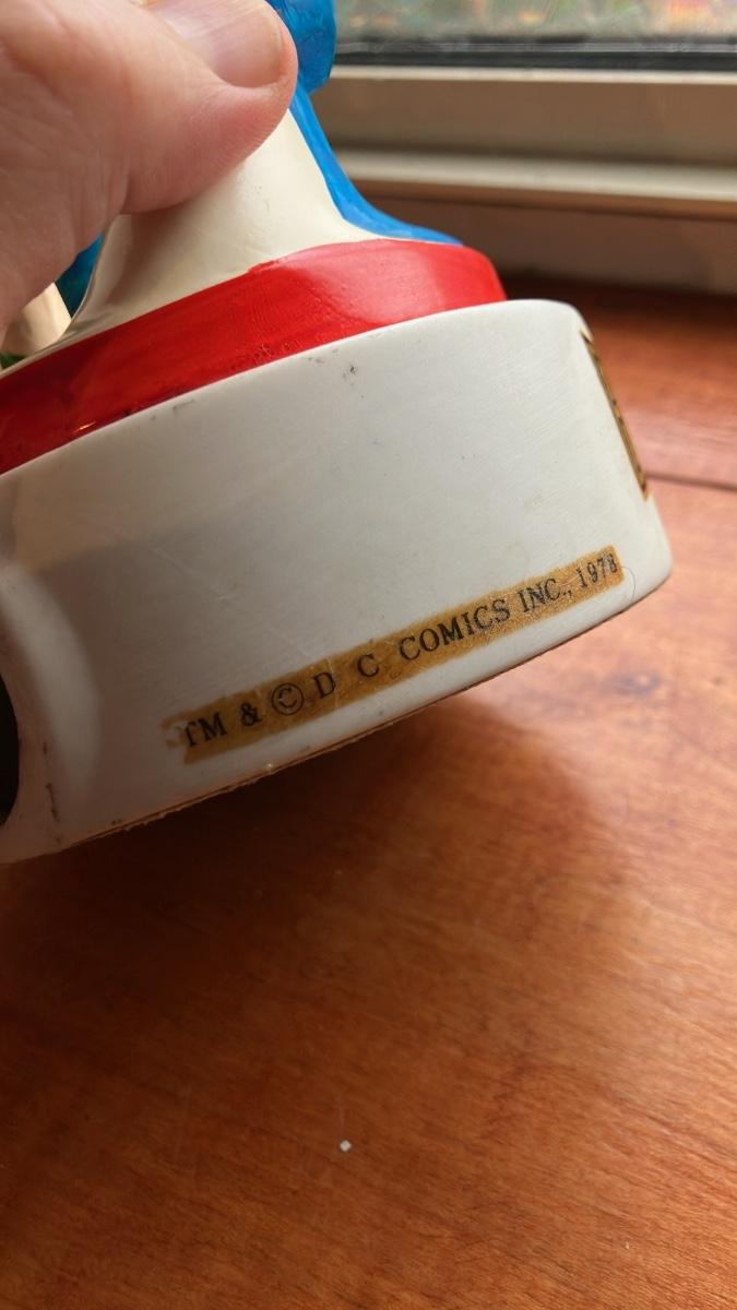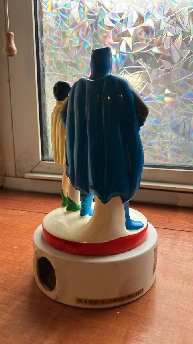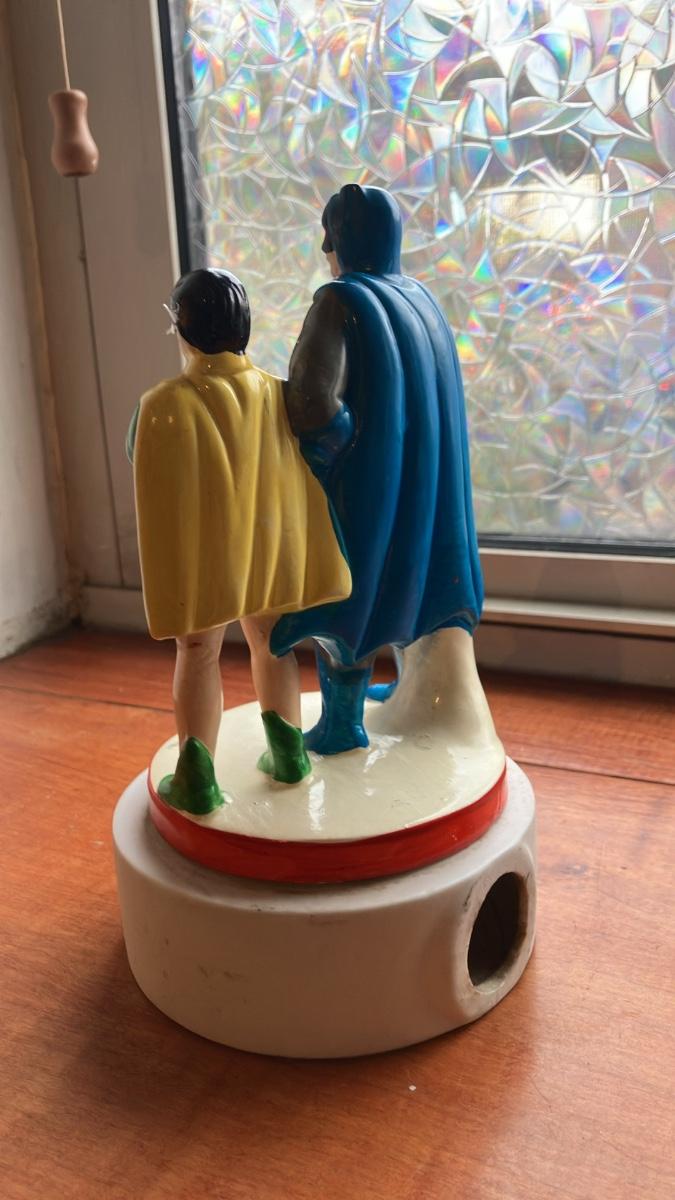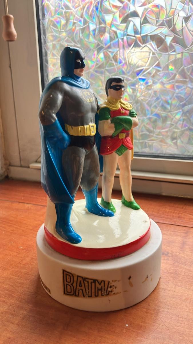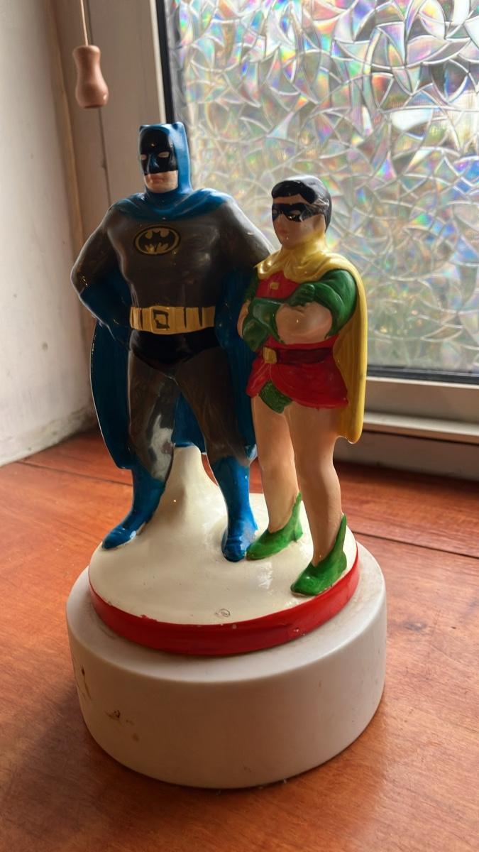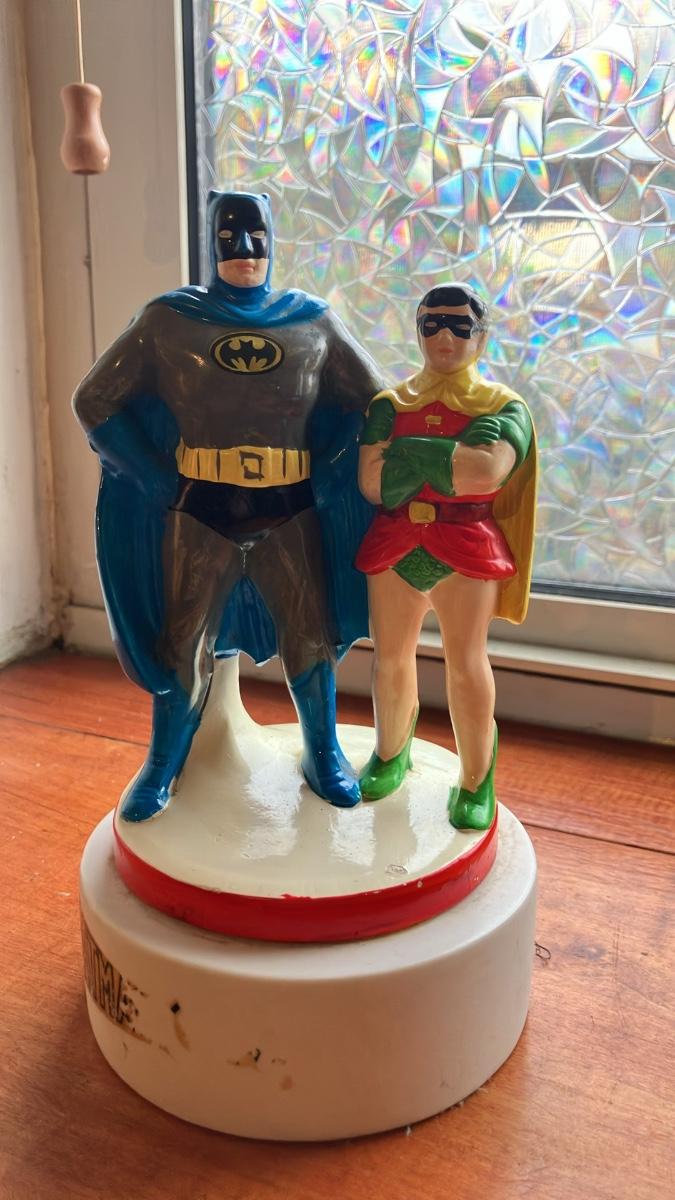 1978 DC Comics licensed ceramic rotating music box featuring Batman and Robin. Stands about 7.5 inches tall with vibrant classic colors and glossy finish. Marked "TM & © DC Comics Inc. 1978" on the side/base.