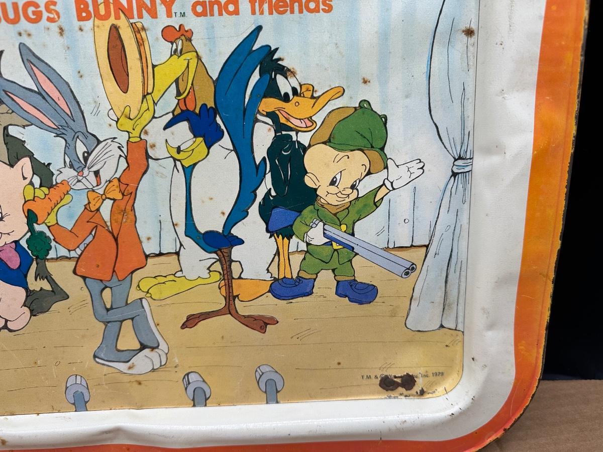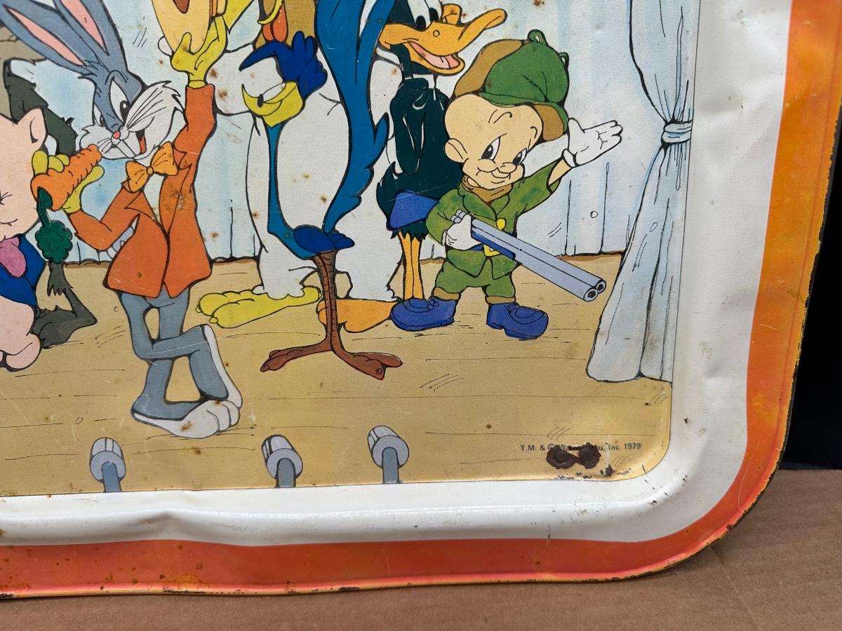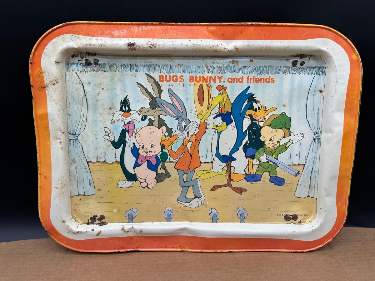 Original 1979 Warner Bros. “Bugs Bunny and Friends” metal serving tray featuring Bugs Bunny, Porky Pig, Sylvester, Foghorn Leghorn, Road Runner, and Elmer Fudd.