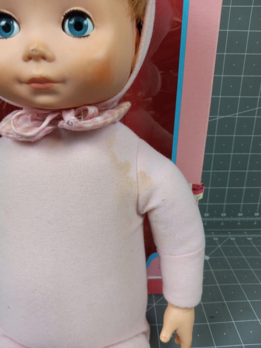 Item is preowned but in good condition. There is some wear and aging to doll, marks and stains were photographed.