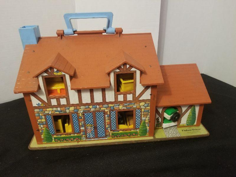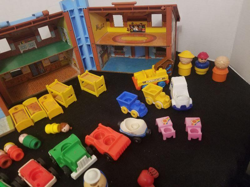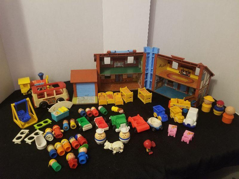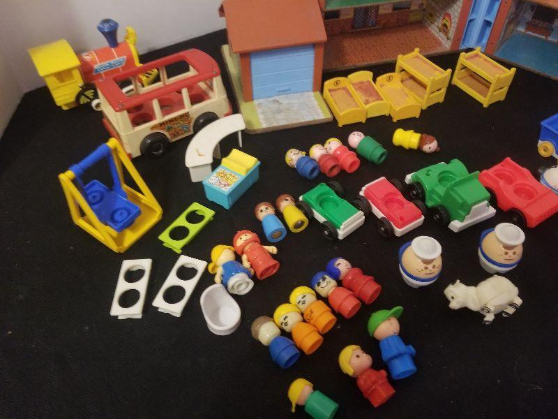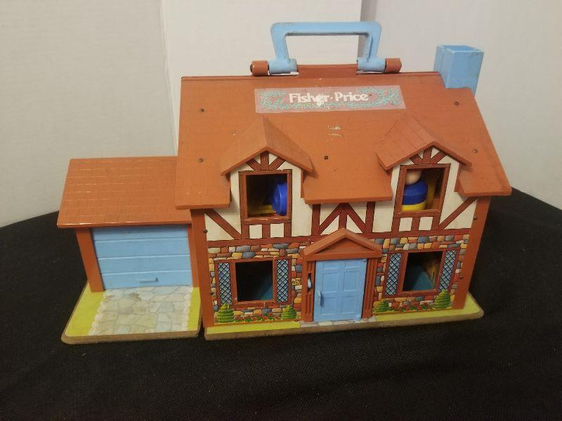 This is a mixed lot of Fisher Price & Other brand vintage people and accessories. Most need cleaning and may be missing parts, such as the padding on the beds. House is pretty good, if the garage had a side door its missing. Decals are not bad house needs a good cleaning as do the other toys.