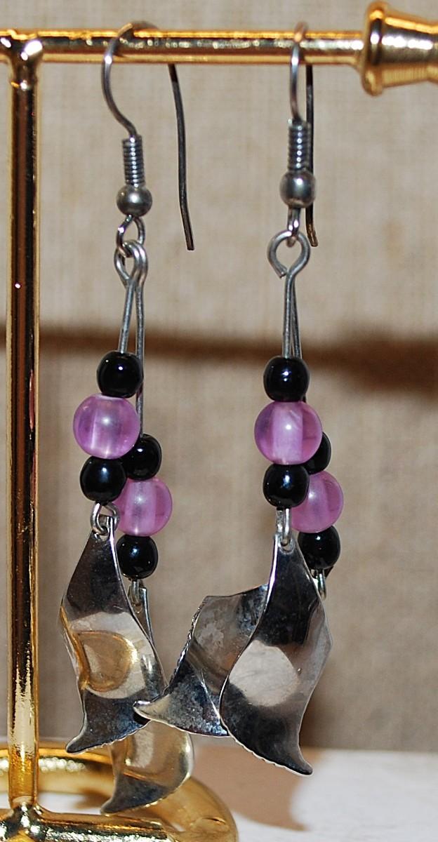 VINTAGE 1980's BLACK & PURPLE Dangle Earrings (2¼") with Curved Silver Tone "Leaves" & Wire Hook Clasp