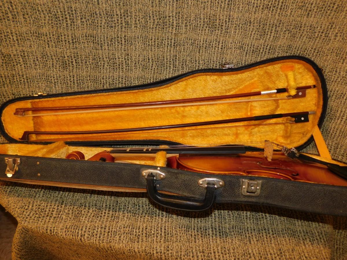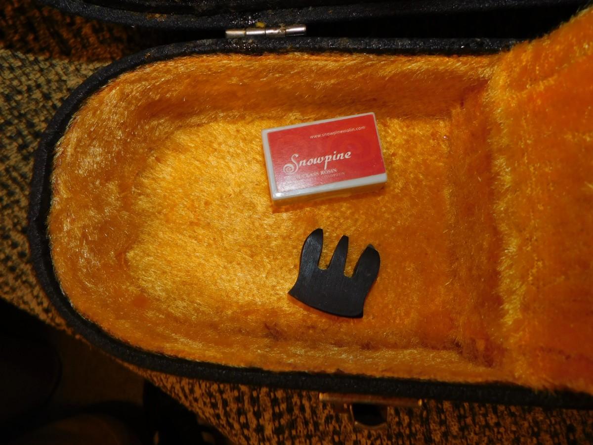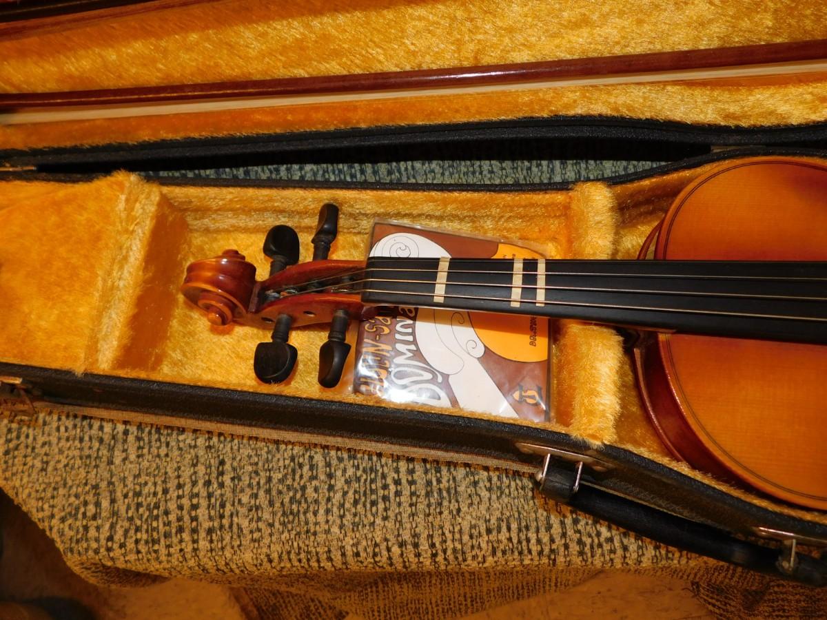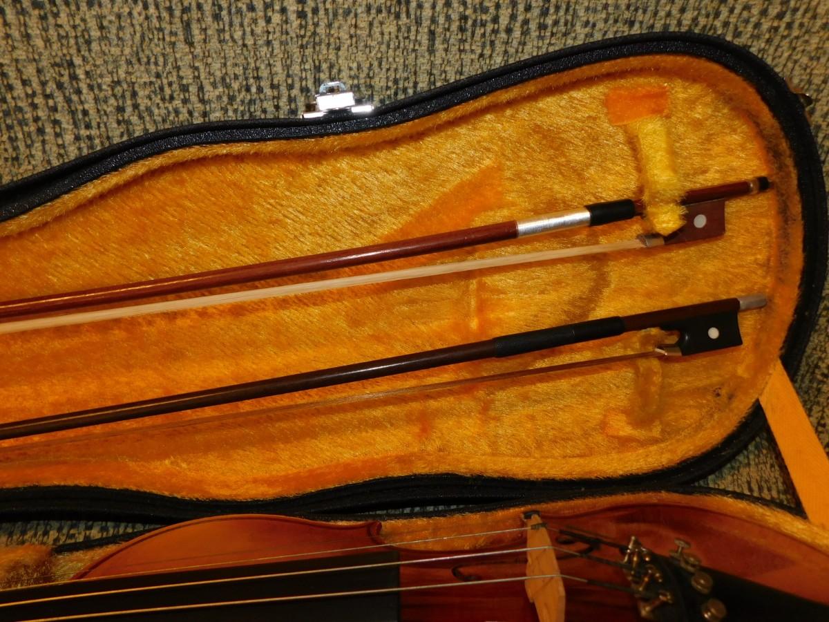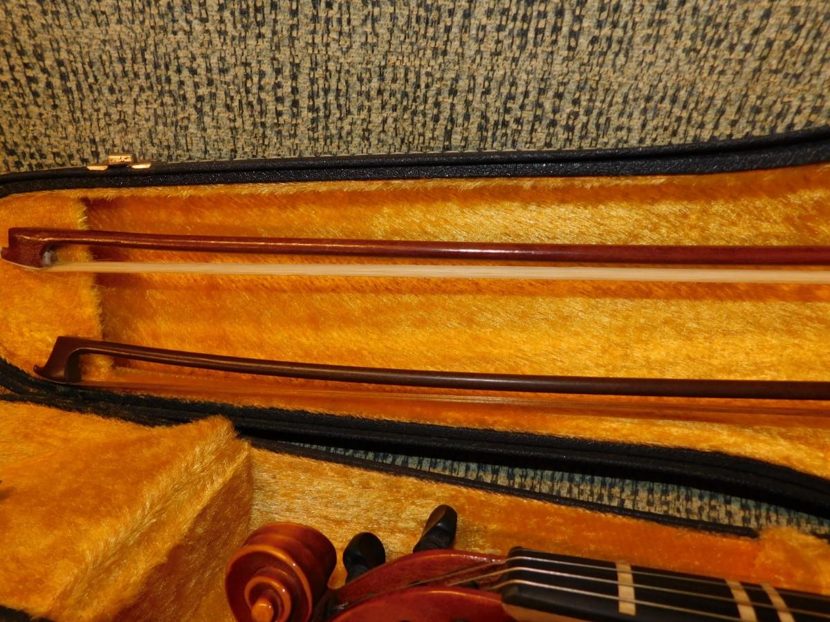 Comes with case, which has signs of age and wear, nice interior. Violin is in excellent condition. Comes with two bows, extra strings, rosin and mute.