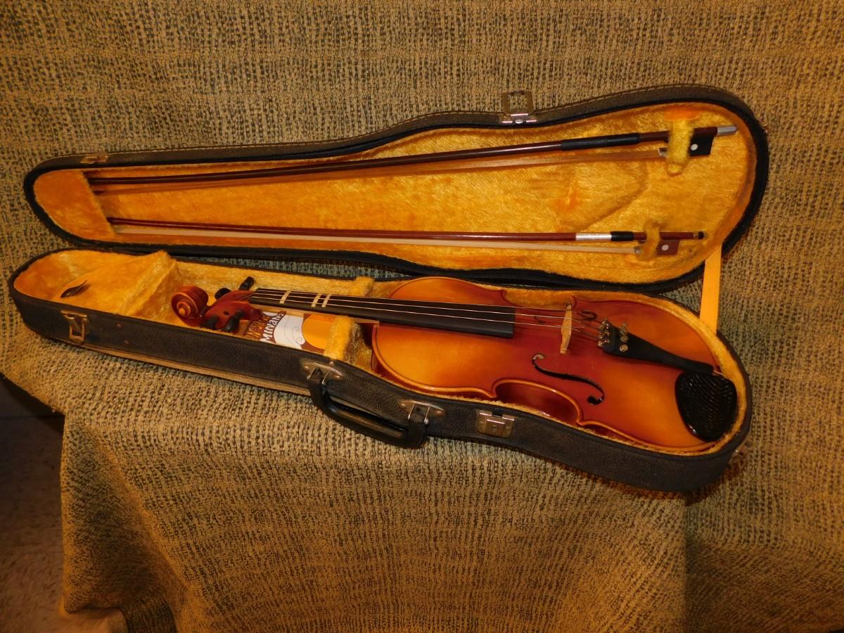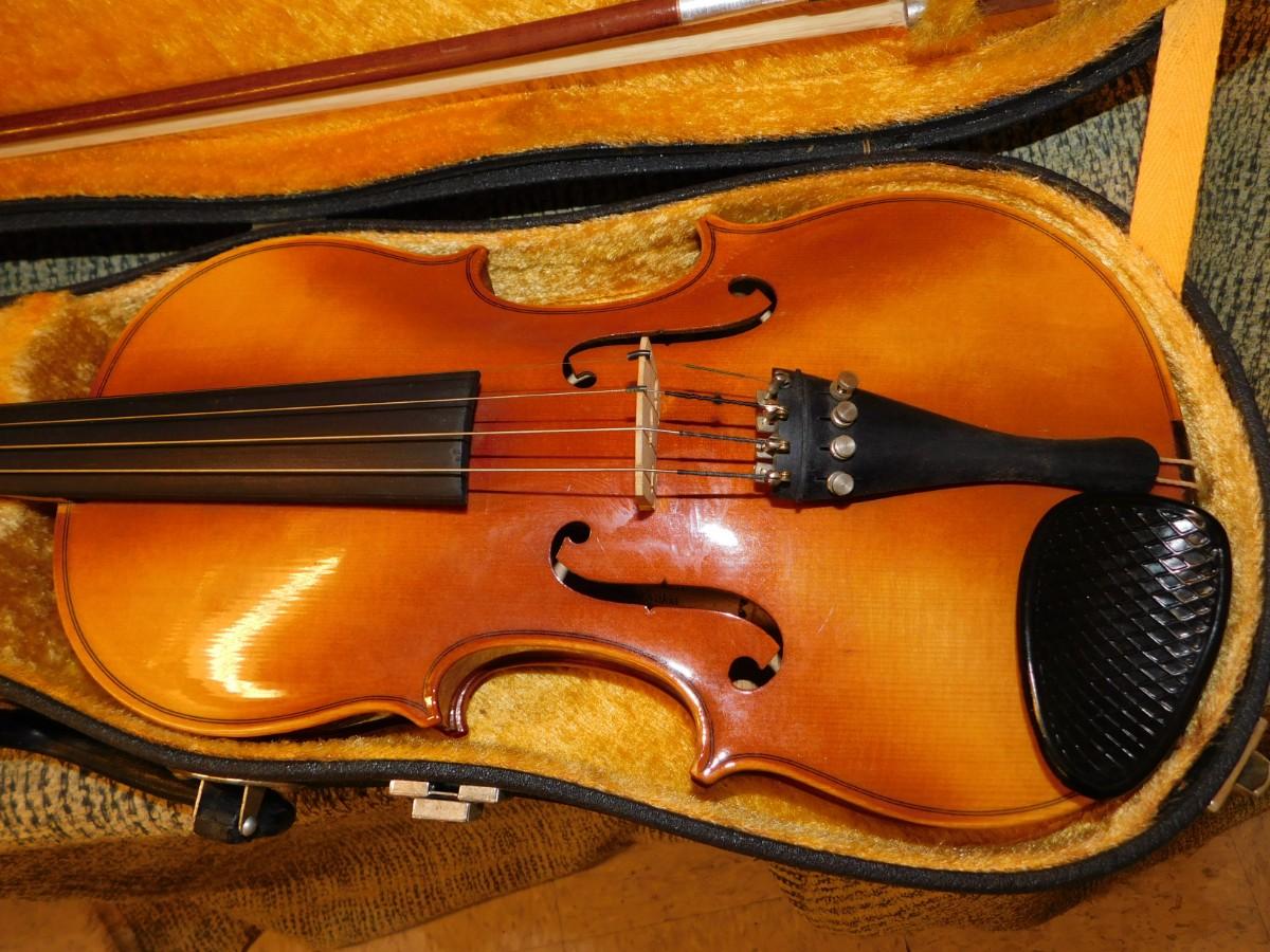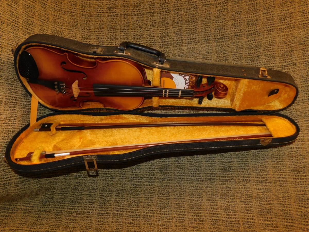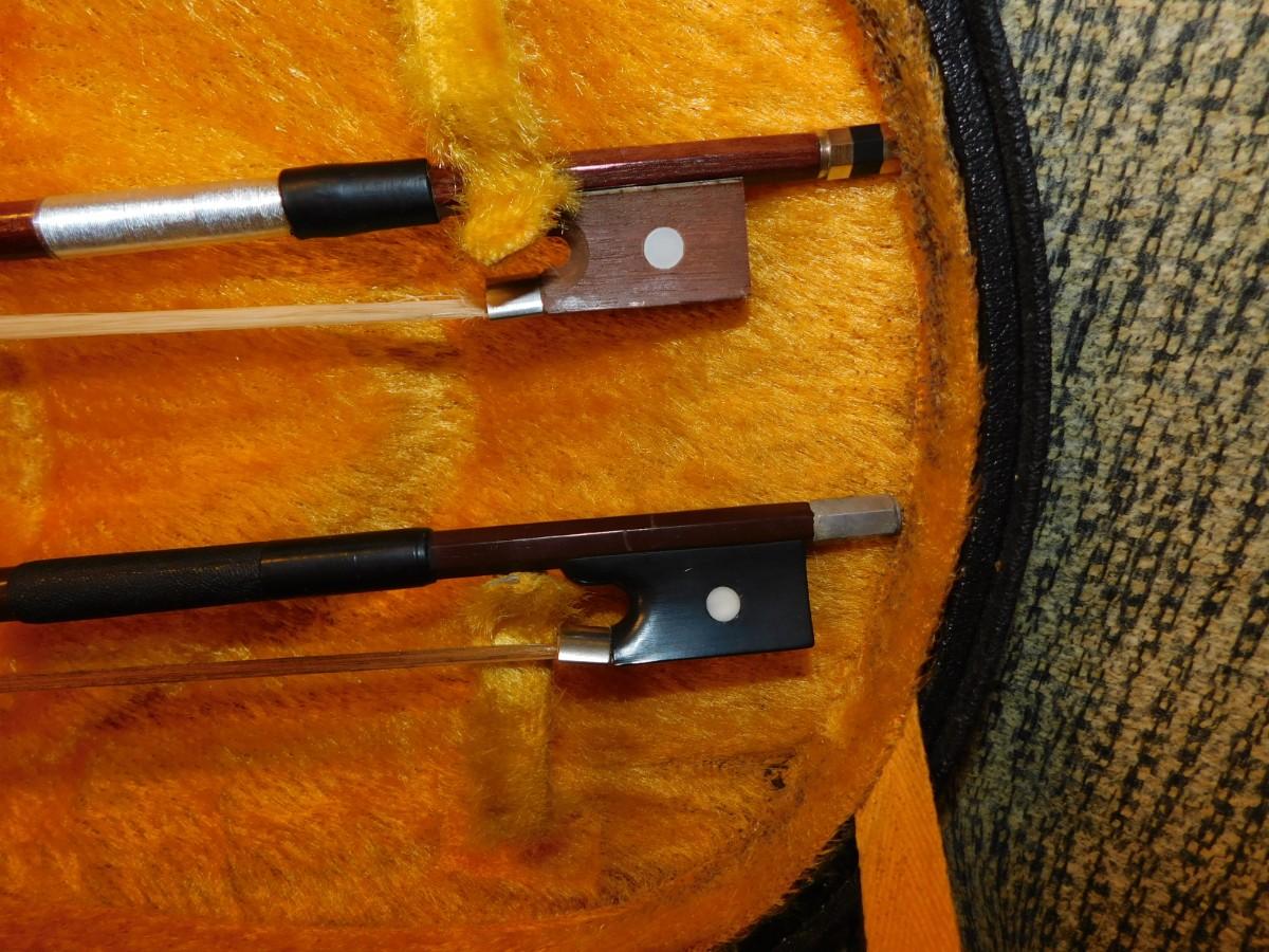 Comes with case, which has signs of age and wear, nice interior. Violin is in excellent condition. Comes with two bows, extra strings, rosin and mute.
