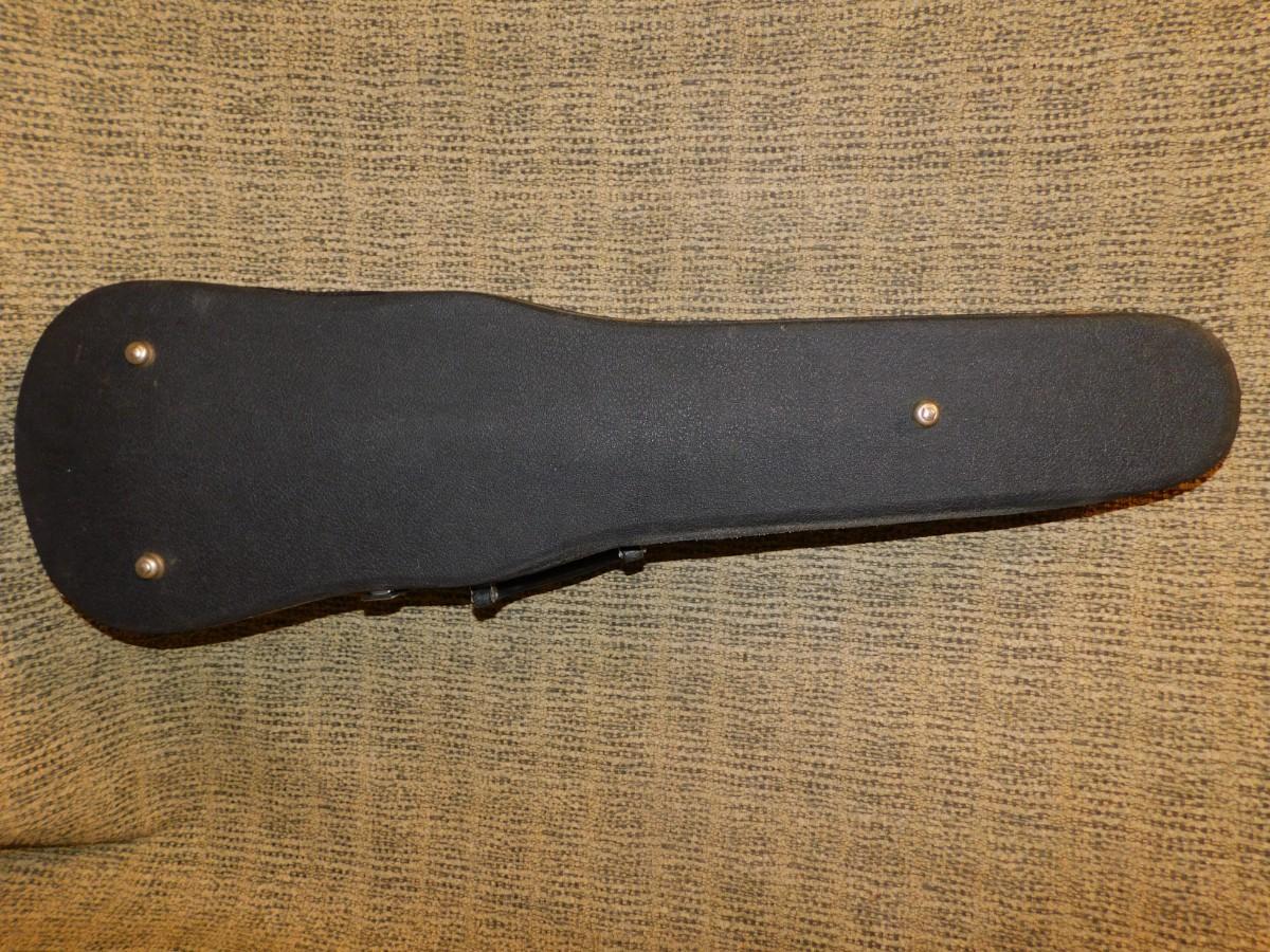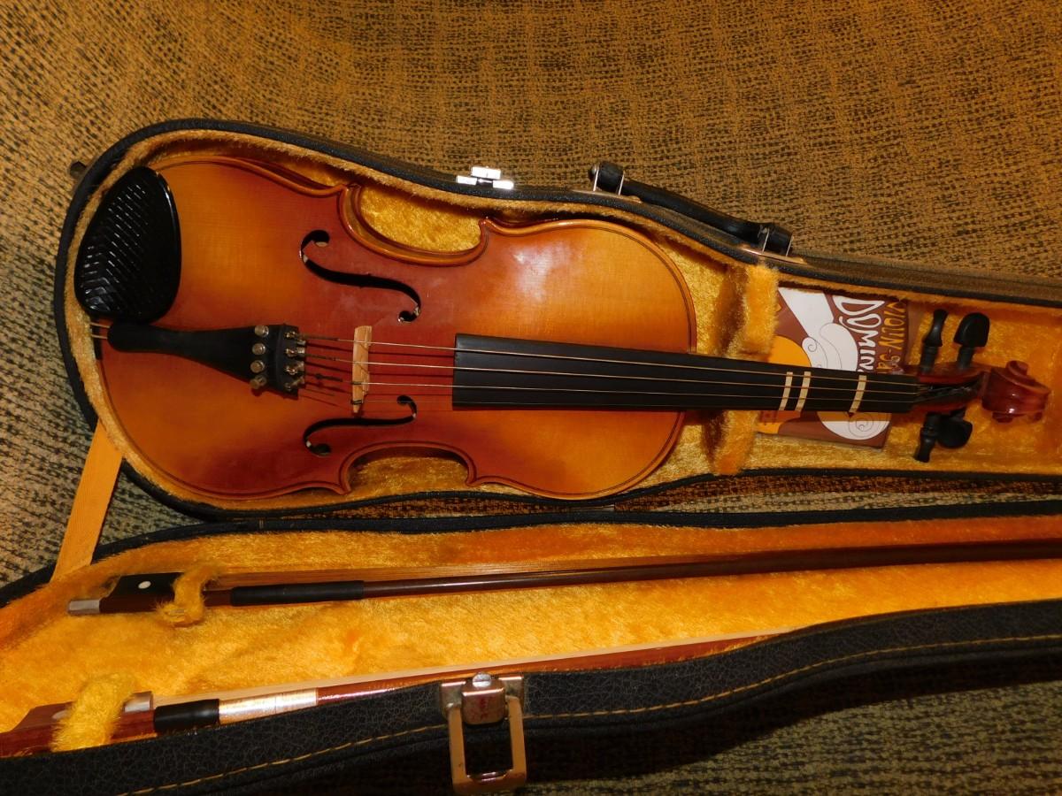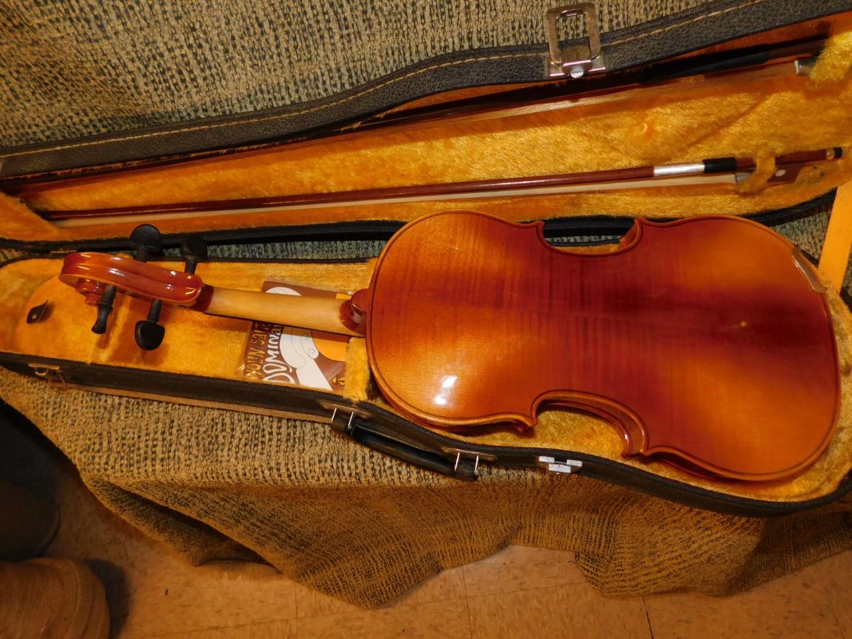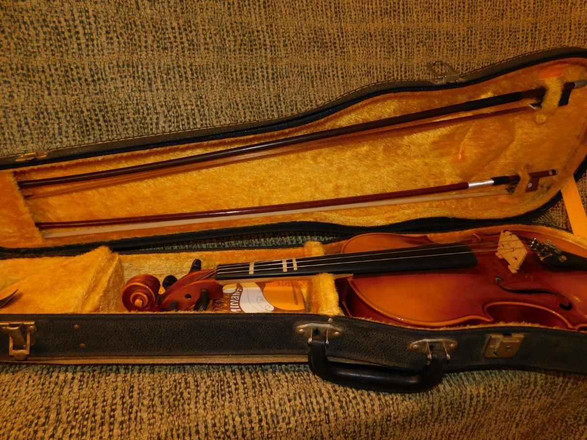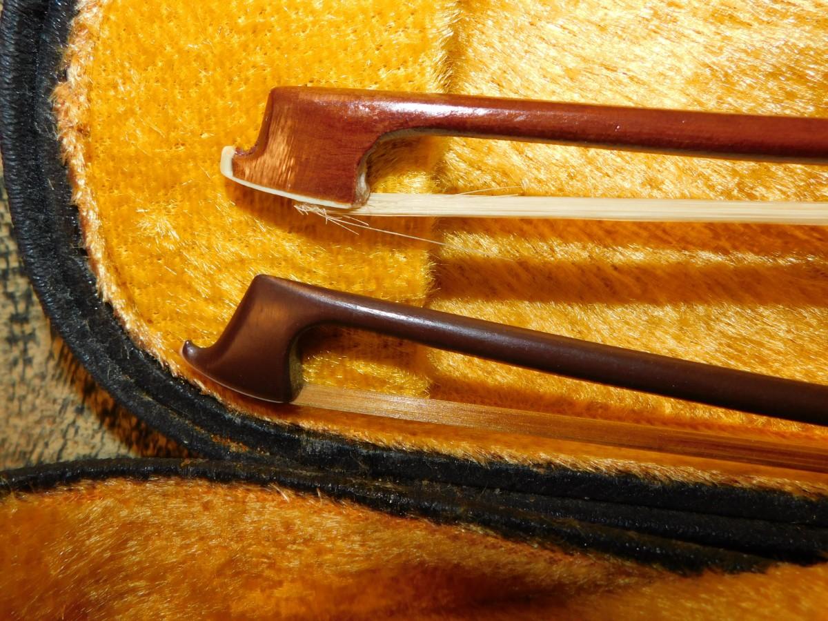 Comes with case, which has signs of age and wear, nice interior. Violin is in excellent condition. Comes with two bows, extra strings, rosin and mute.