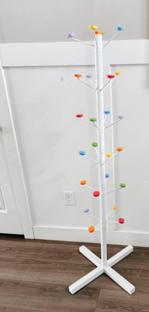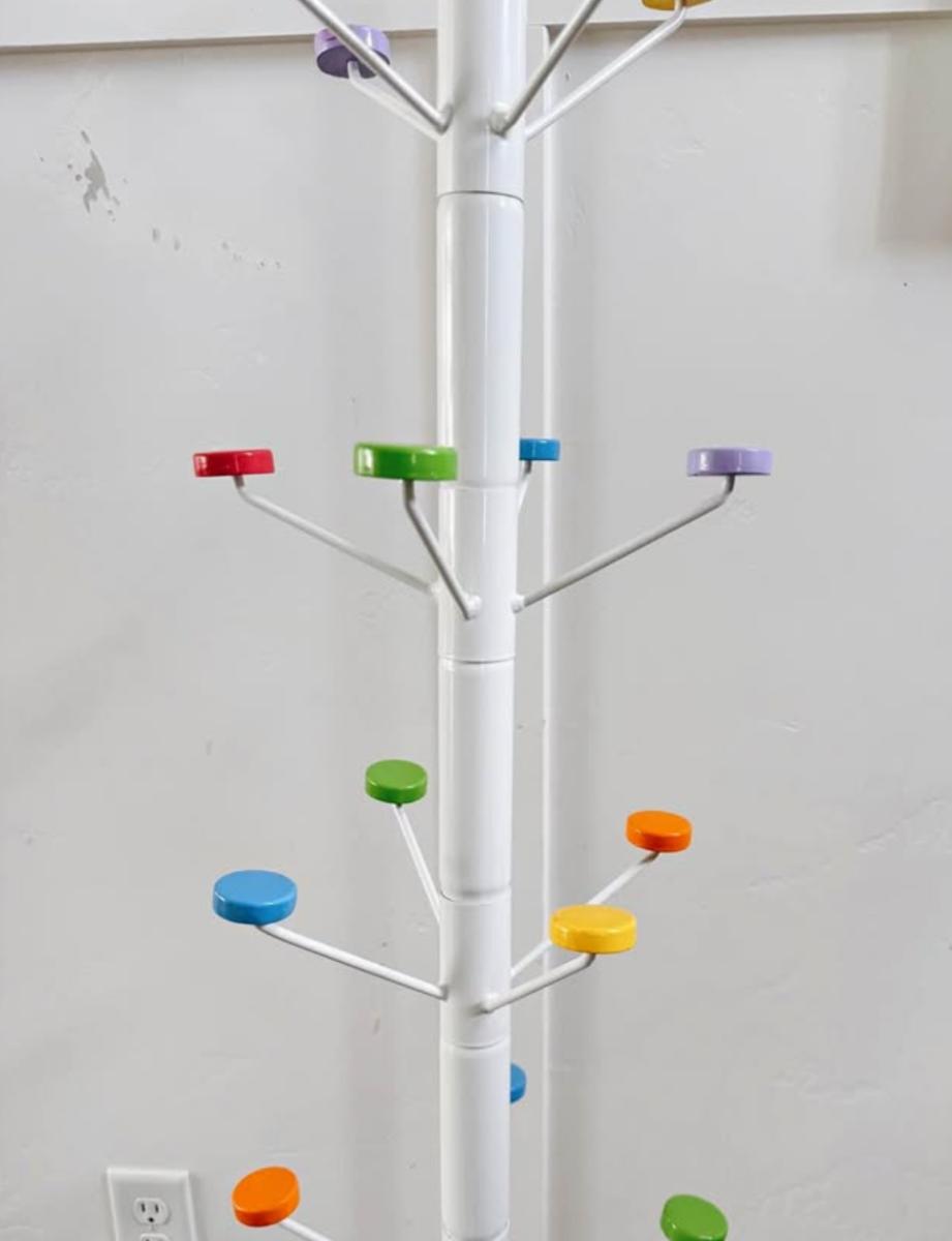 Vintage 1980’s Postmodern White Metal Coat Rack w/Multi-Colored Disc Hooks