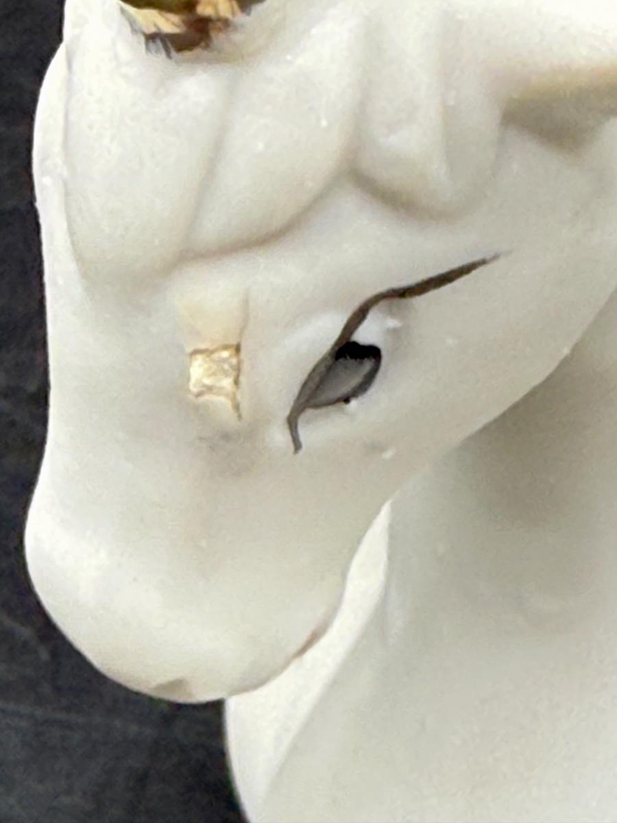 Ceramic with gold horns and painted eyes. Prone figurine has a small imperfection near the left eye (see photo).