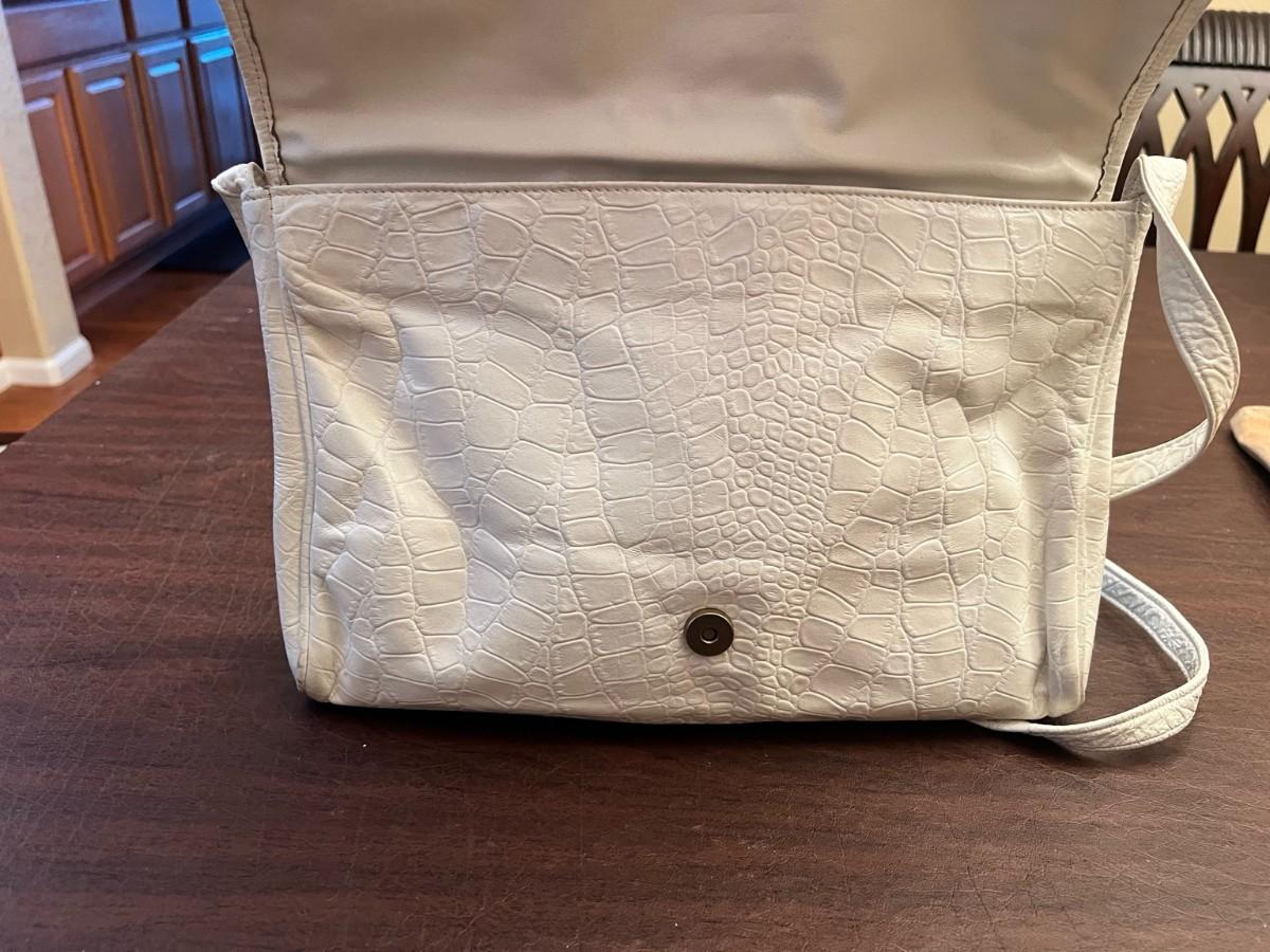 Material: Faux crocodile embossed vinyl with multicolor stitched ribbon inlays