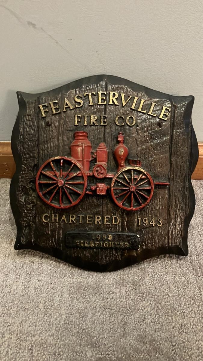 This nostalgic vintage-style wall plaque celebrates the Feasterville Fire Company in Bucks County, Pennsylvania—chartered in 1943—and includes a special tribute to a 1982 Firefighter (likely an award, recognition, or dedication piece). Expertly handcrafted from sturdy cast resin and painted in a deep black with a highly realistic wood-grain finish to resemble aged, textured wood, it showcases a prominent raised-relief antique steam fire pumper engine in vivid red and gold, along with crisp raised lettering for the company name, charter year, and commemorative details.