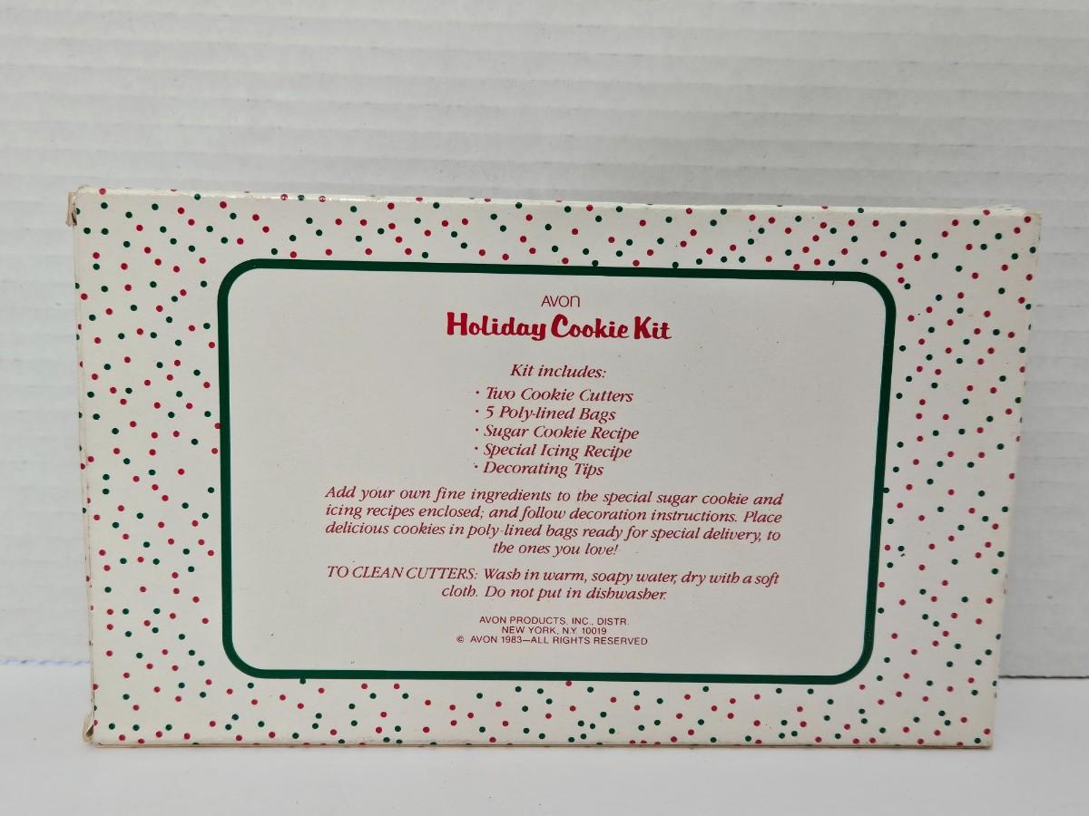 This is a brand-new, vintage AVON Holiday Cookie Kit from 1983. This complete set allows you to "Add your own fine ingredients to the special sugar cookie and icing recipes enclosed" to create festive holiday treats. The kit includes two cookie cutters (a teddy bear and a train engine shape), five poly-lined gift bags, a sugar cookie recipe, a special icing recipe, and decorating tips. It is a delightful piece of holiday nostalgia, perfect for use with family or for collectors of vintage Avon items.