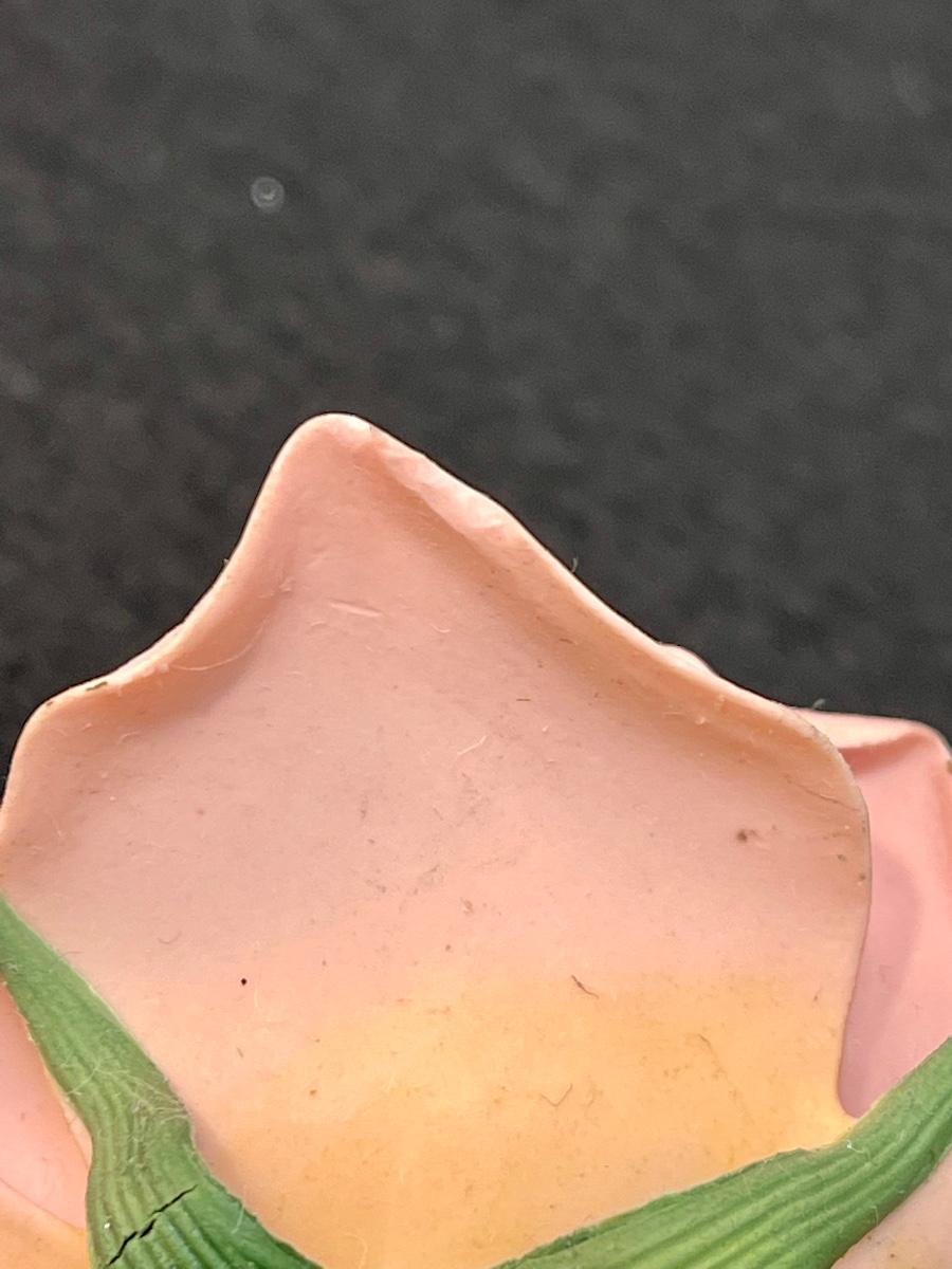 In very good condition, but there is a tiny rough spot on back edge of one of the petals - see photos