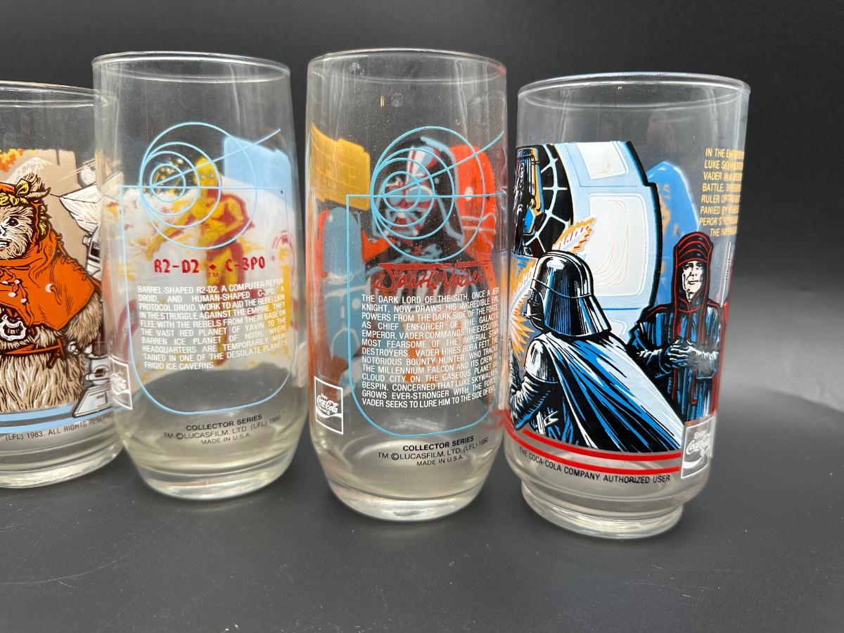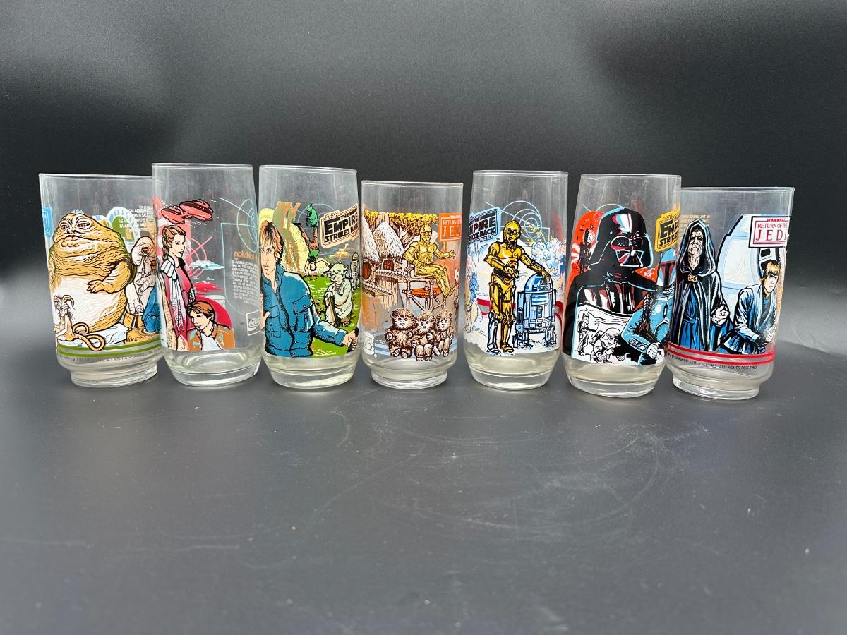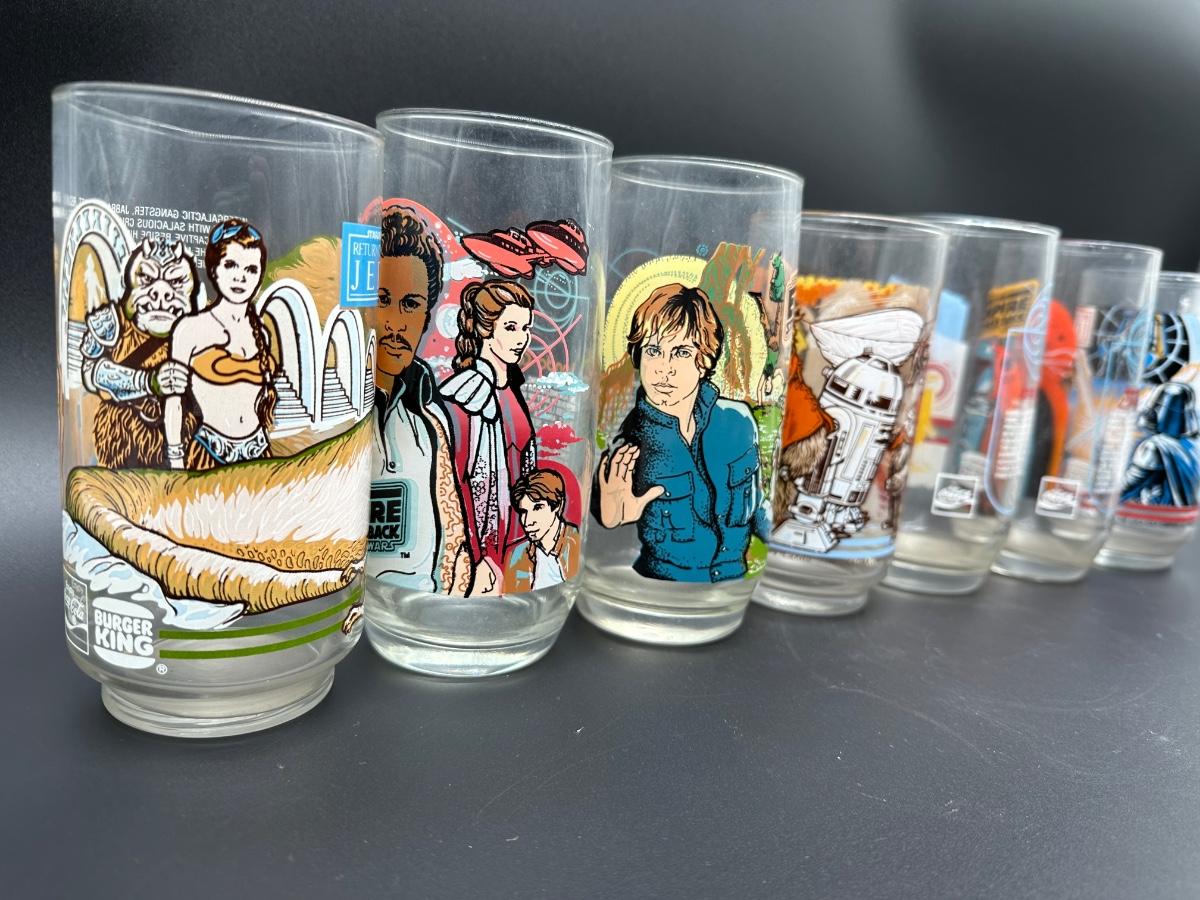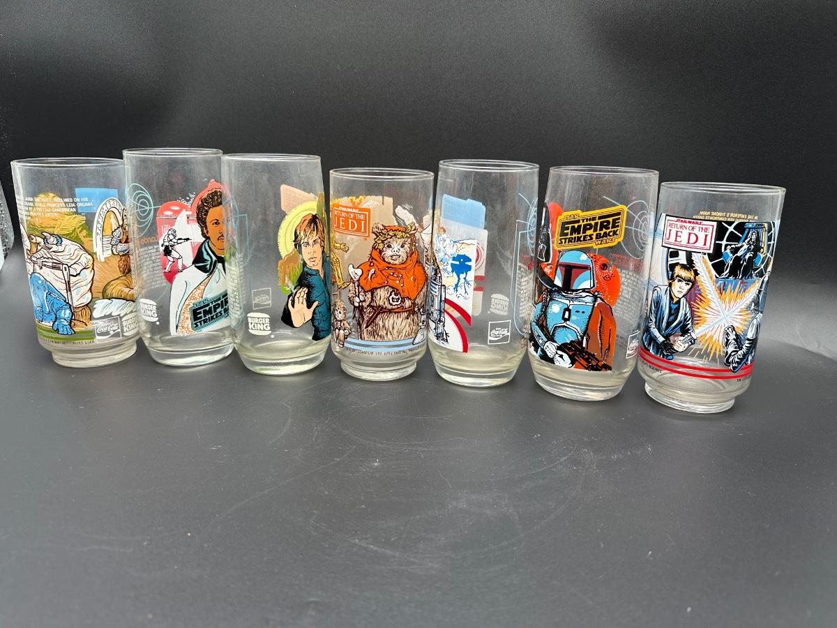 Complete set of vintage Star Wars collector glasses issued by Burger King / Coca-Cola in 1983, featuring artwork from Return of the Jedi and The Empire Strikes Back.