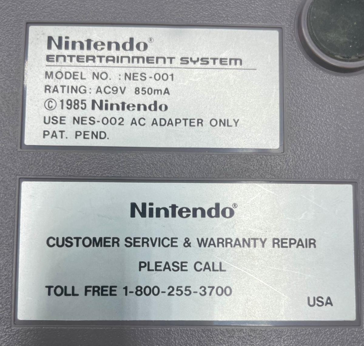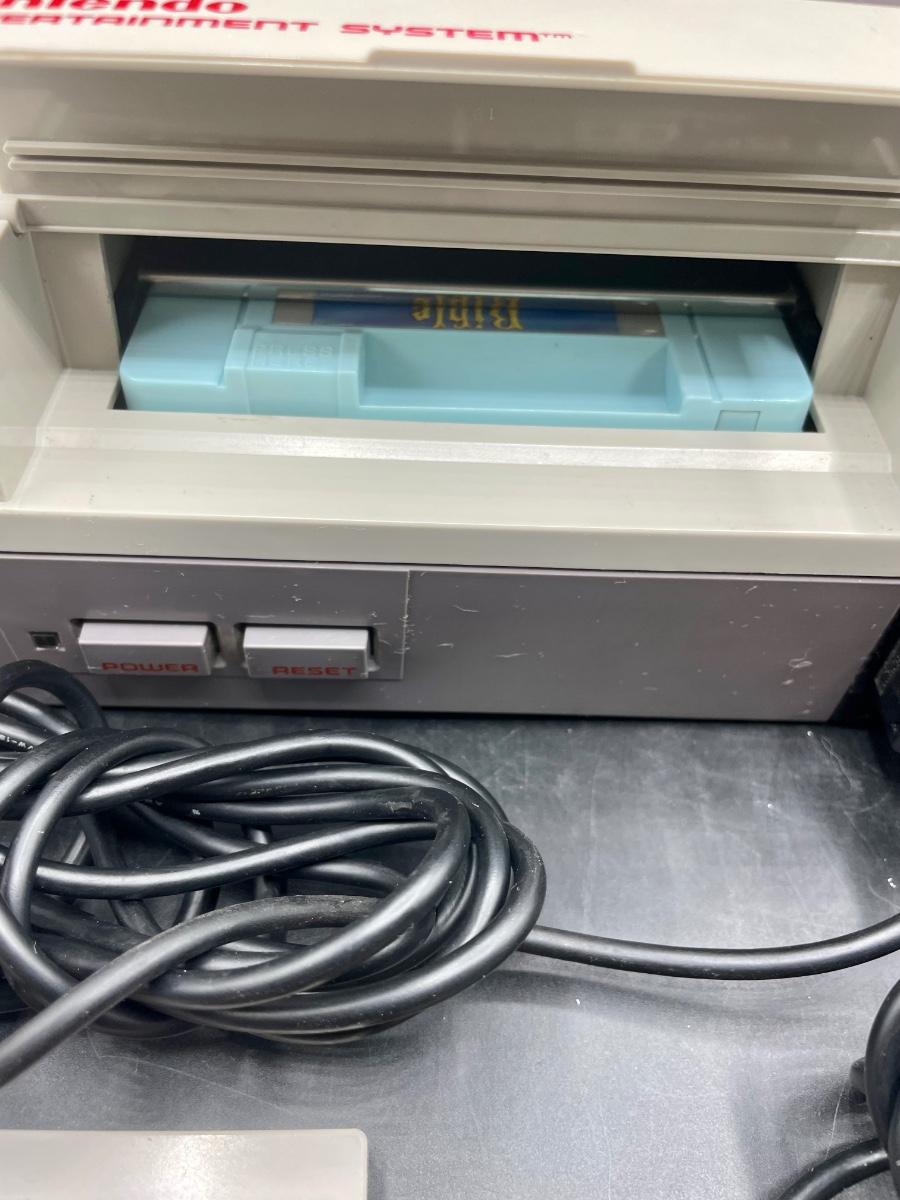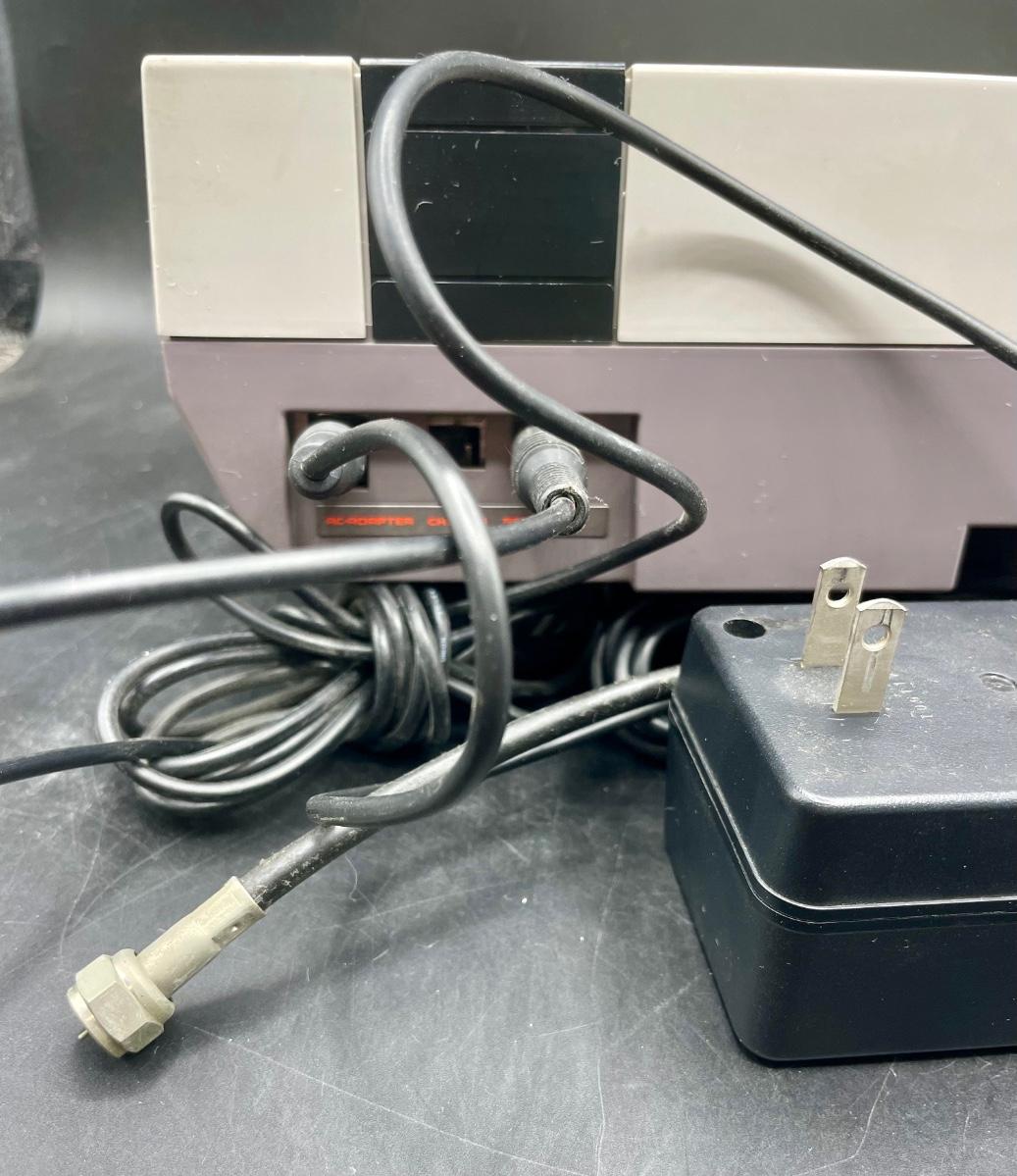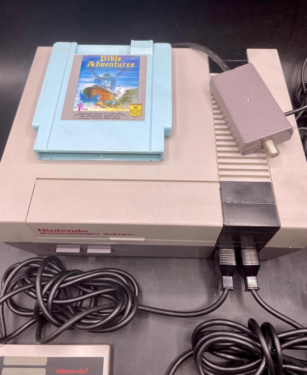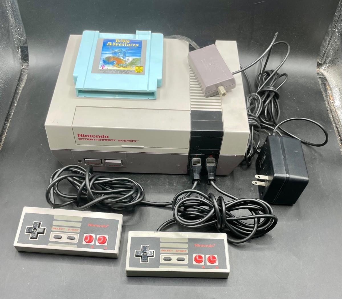 Model NES-001. Comes complete with 2 controllers, NES-002 AC power supply, NES-003 RF Switch, and 1 game (Bible Adventures). Powers up as expected, game loads and unloads properly, all cables are undamaged and connect cleanly and properly. Was not able to connect to a TV, so other functions have not been tested.