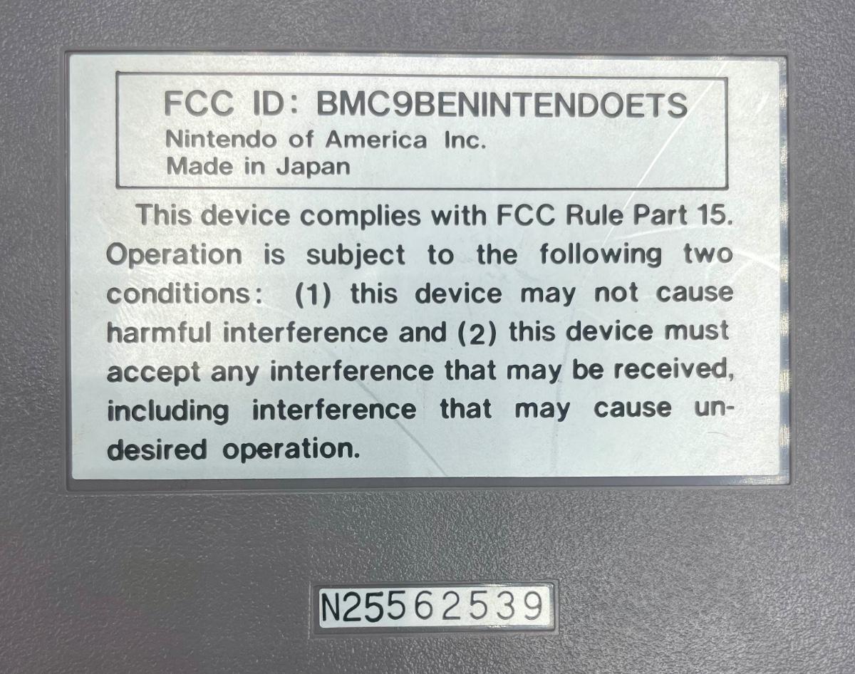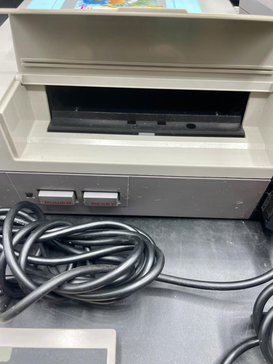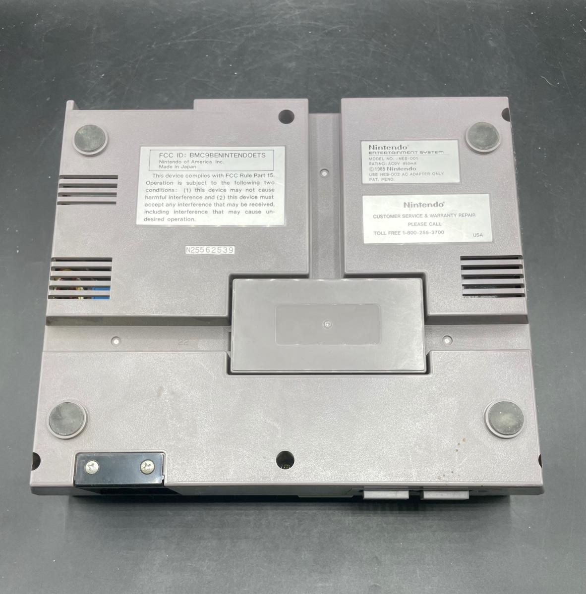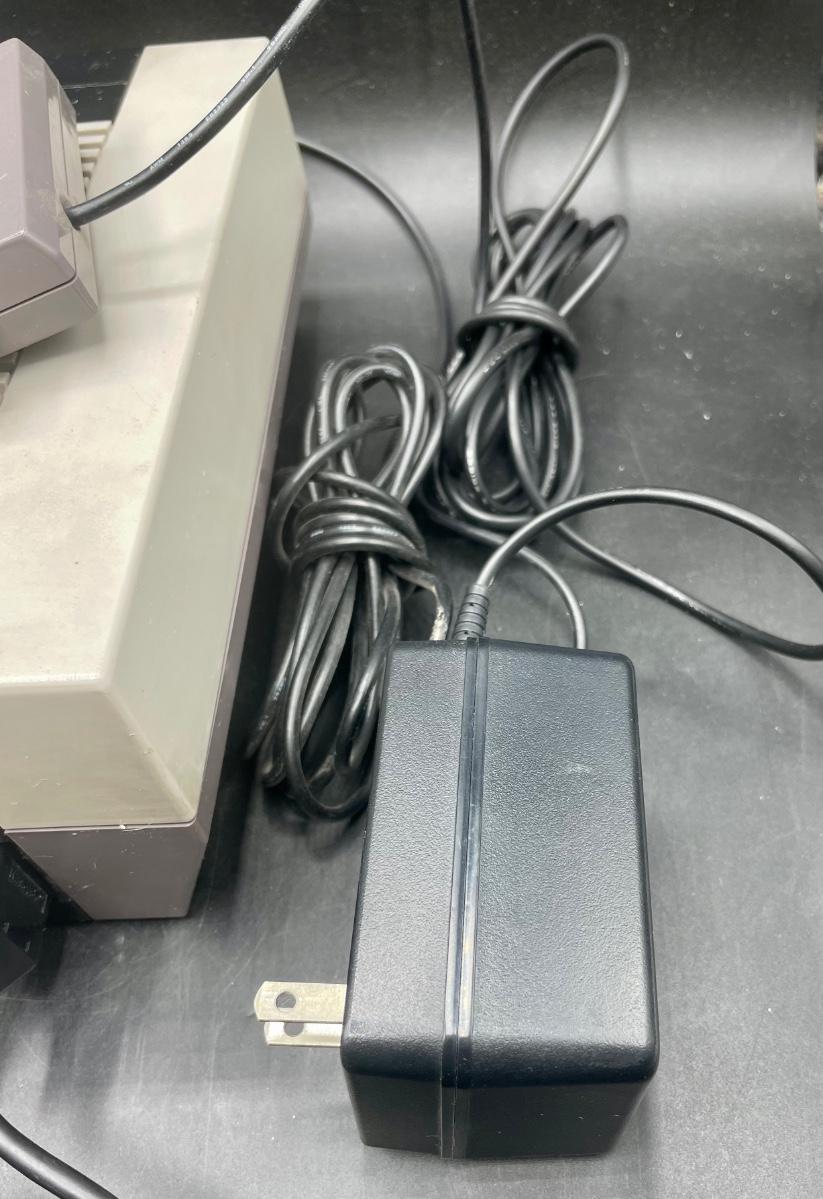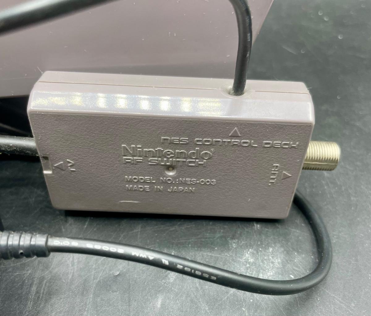 Model NES-001. Comes complete with 2 controllers, NES-002 AC power supply, NES-003 RF Switch, and 1 game (Bible Adventures). Powers up as expected, game loads and unloads properly, all cables are undamaged and connect cleanly and properly. Was not able to connect to a TV, so other functions have not been tested.