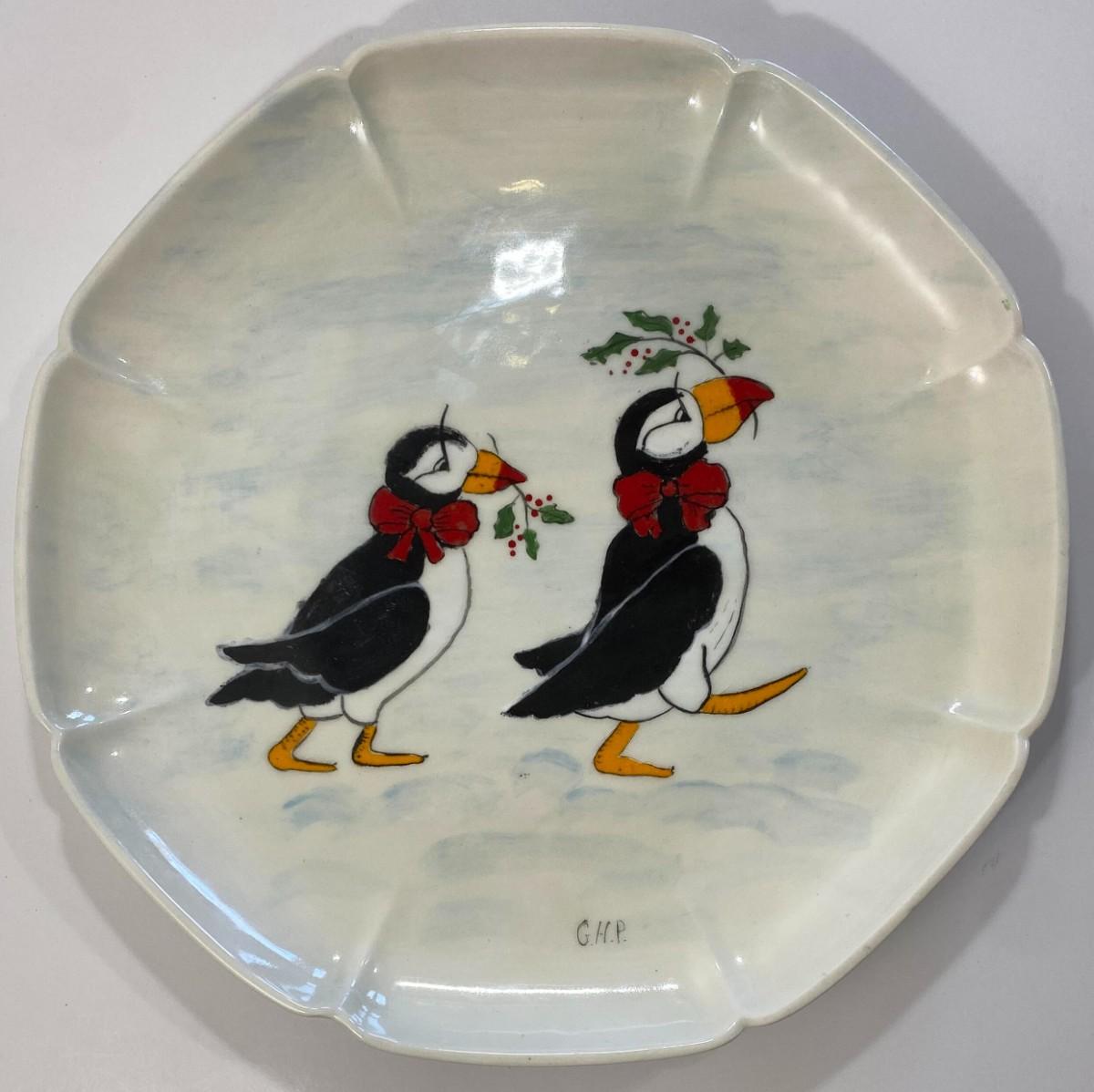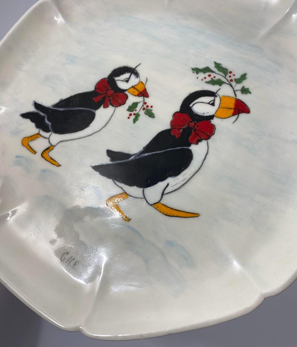 Vintage 1987 Handmade 11 1/8" Ceramic Christmas Tray Puffin Penguin Toucan