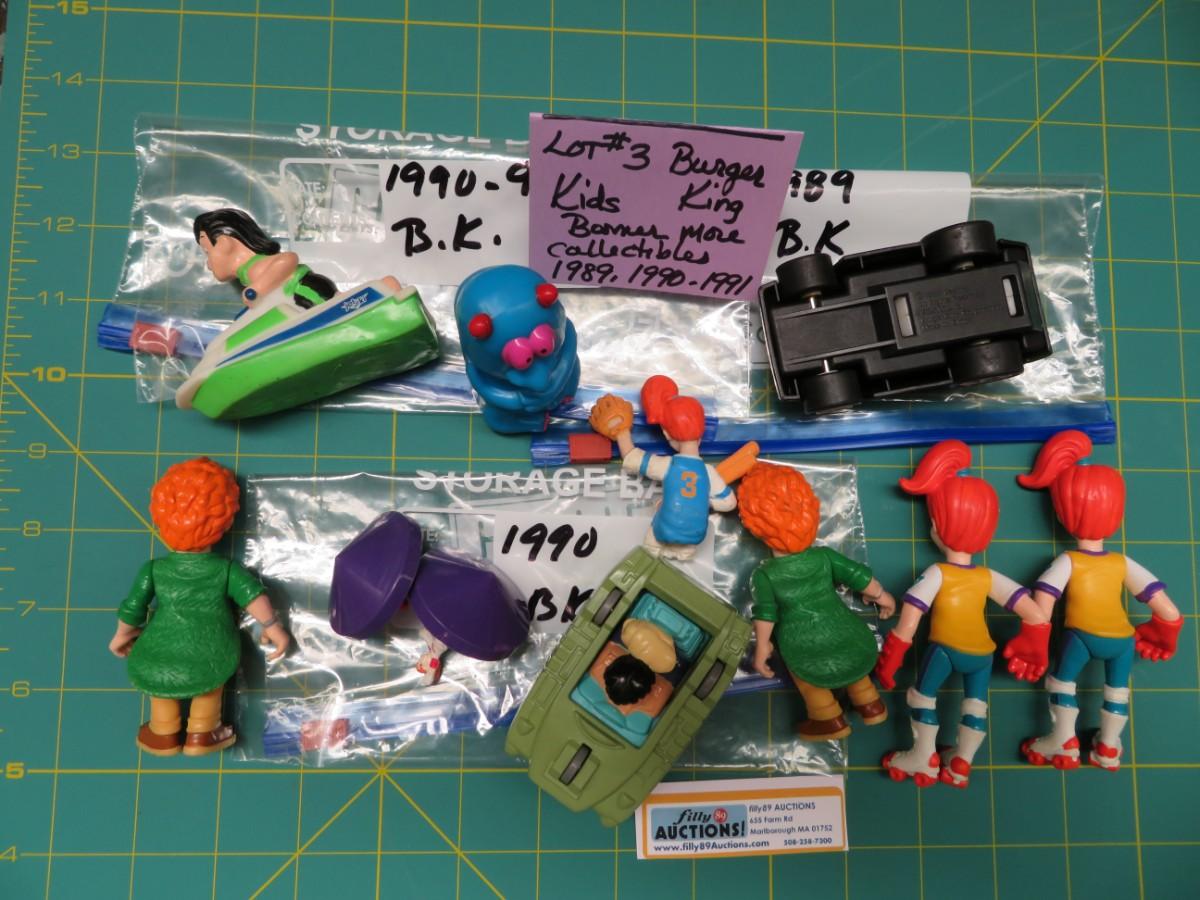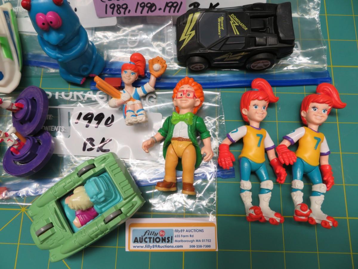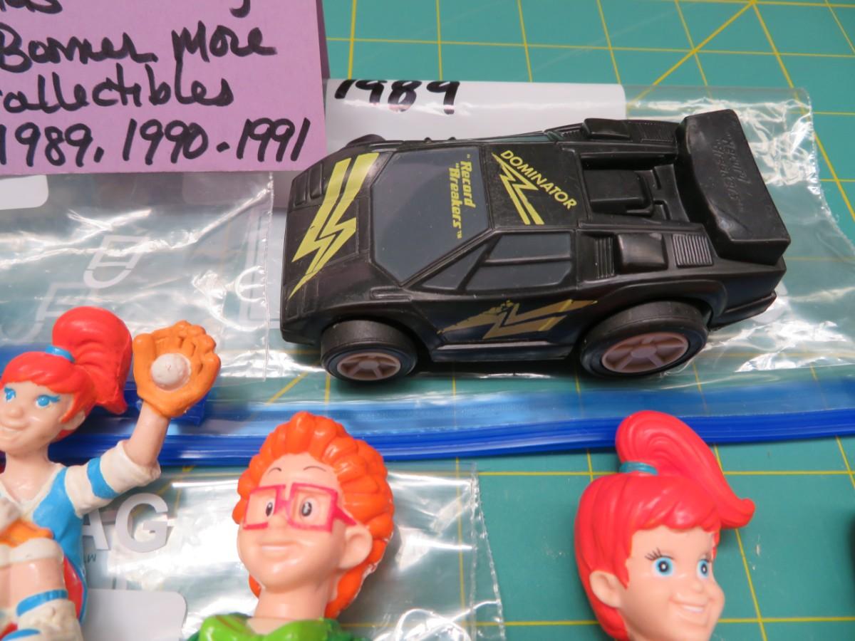 LOT of Vintage Burger King Toys includes 1989 Black Dominator Record Breakers Hasbro Race car, Boomer Club Action Figures, Jet ski. In 3 Bags marked with year.