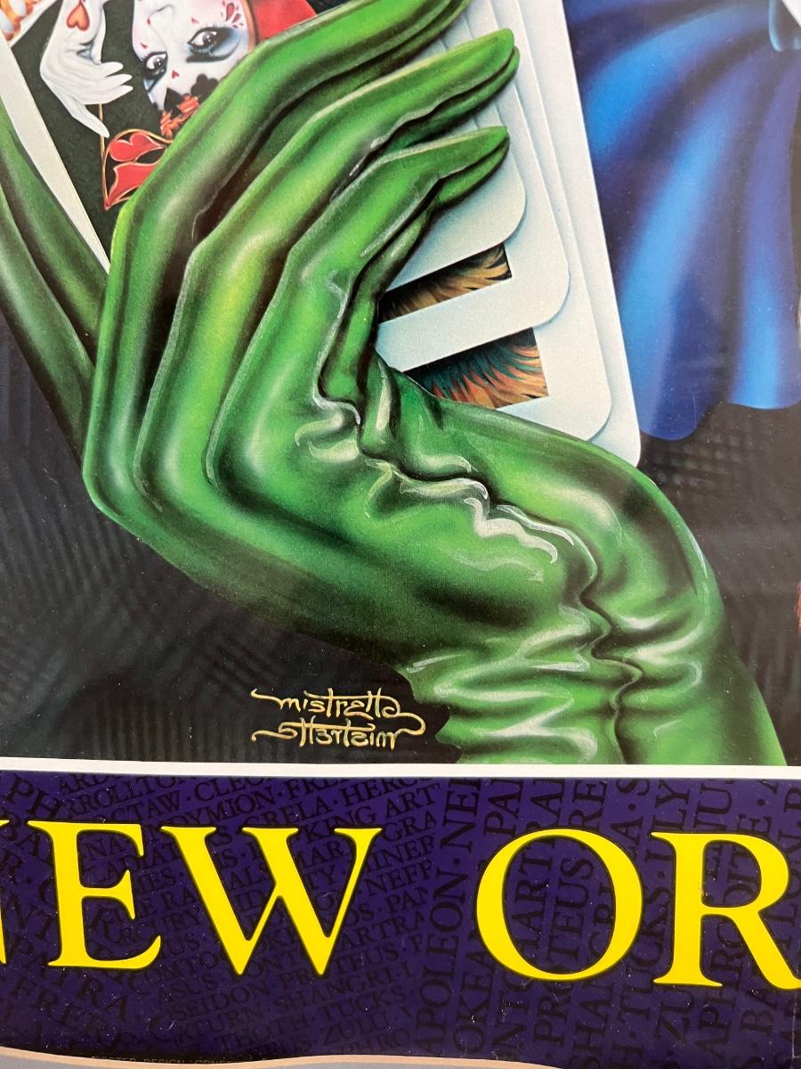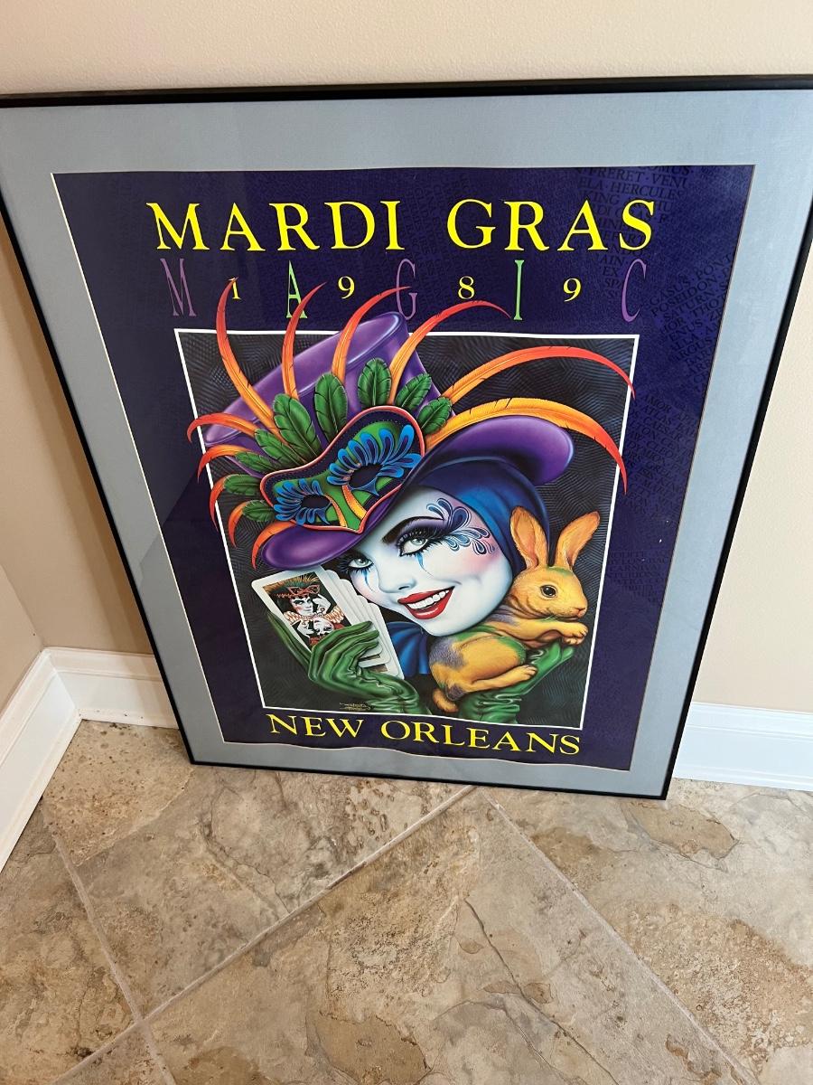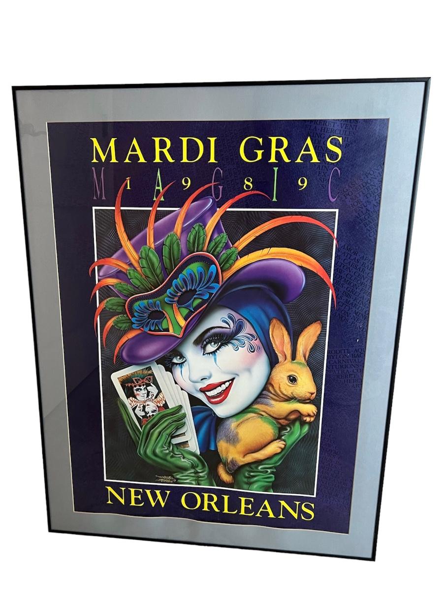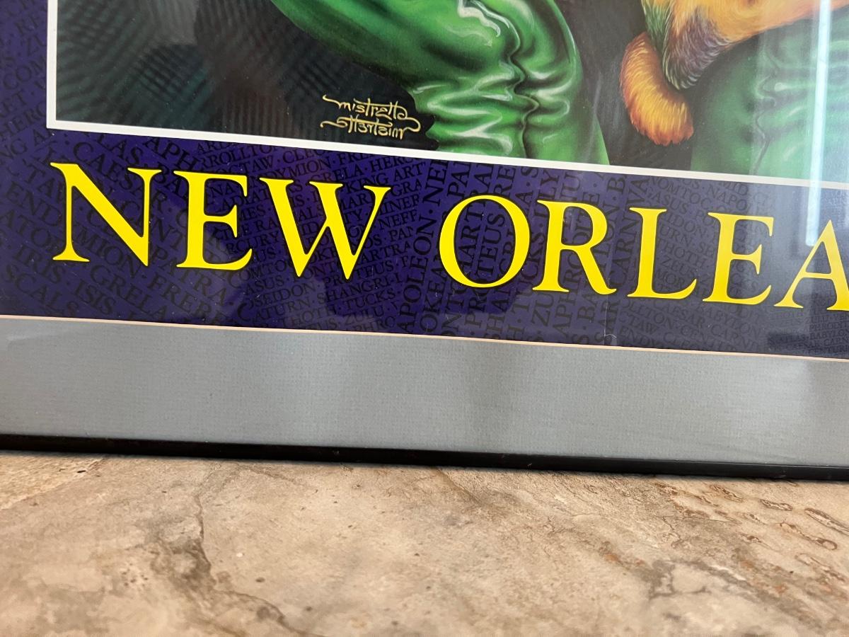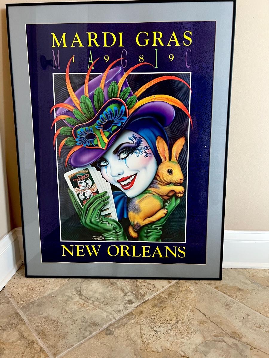 Vintage NEW ORLEANS 1989 Andrea Mistretta Mardi Gras "Magic” matted and framed. Measures 35 1/2 inches tall, 27 inches wide and 1 inch deep. See pictures for bubbling on the bottom matte.