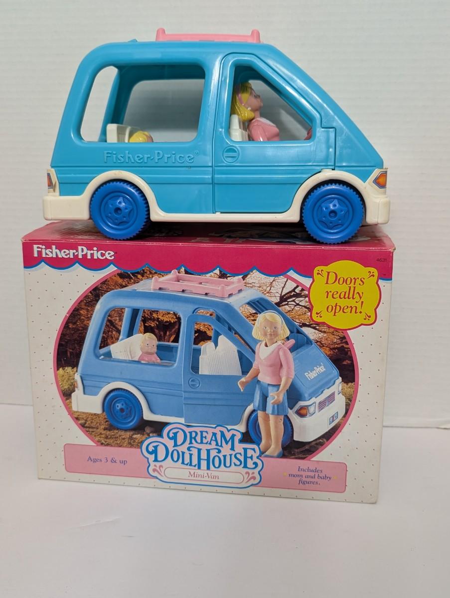 Tags: vintage Fisher Price, Dream Dollhouse, 1990s toy, minivan set, #4631, mom and baby figures, dollhouse accessory, collectible toy, Fisher Price car, retro playset, kids vintage toy