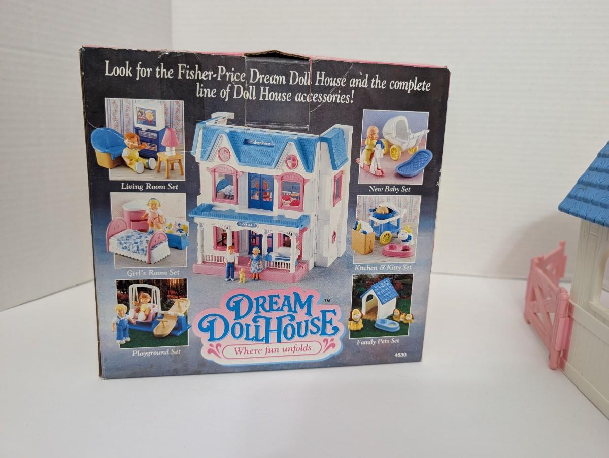 Vintage Fisher Price Dream Dollhouse Pony Stable Set #4630, part of the beloved 1990s Dream Dollhouse accessory line. Includes the yellow pony with pink saddle and the white-and-pink stable with blue roof and fold-out fence. The little girl figure is missing. A charming addition to complete your Fisher Price Dream Dollhouse collection or display.