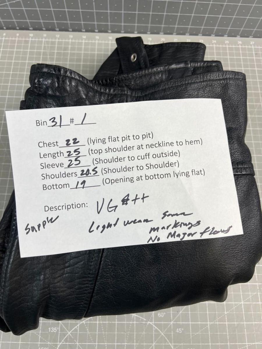 Light wear, some markings, no major flaws. Measurements: Chest 22", Length 25", Sleeve 25", Shoulders 20.5", Bottom 19".