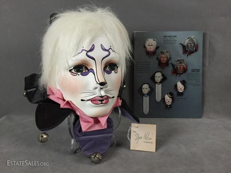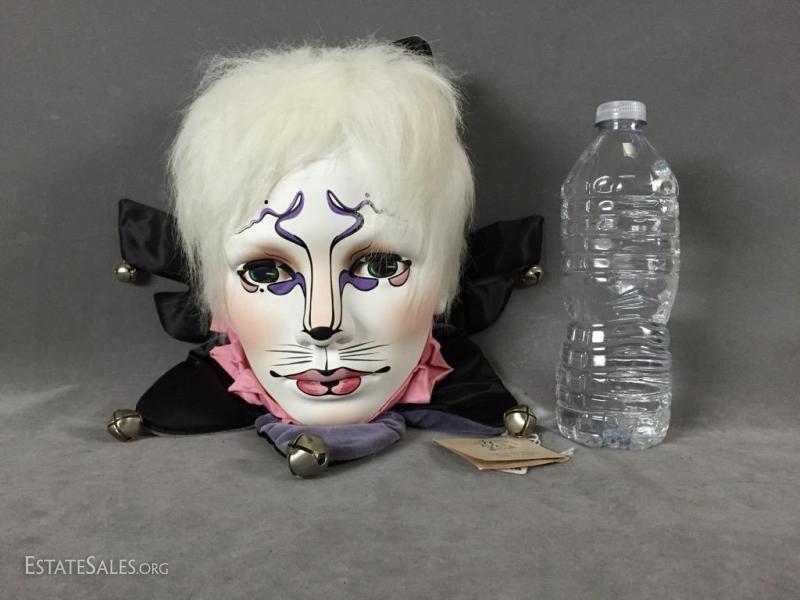 Vintage 1993 Dylan Nelson female cat jester, handcrafted in the USA with original tags and documents, 14 inches tall