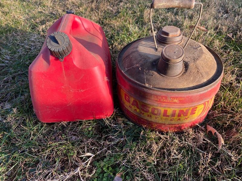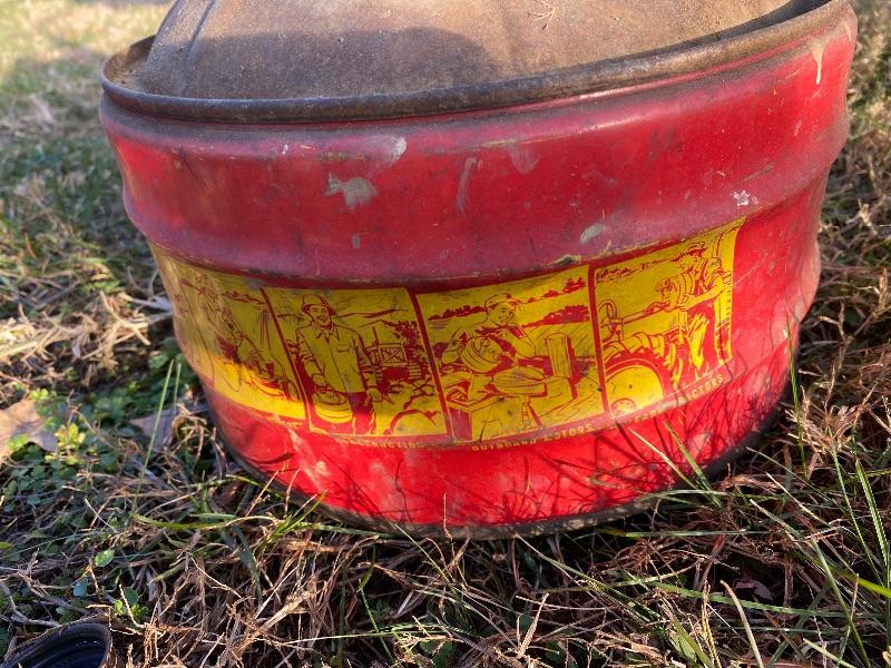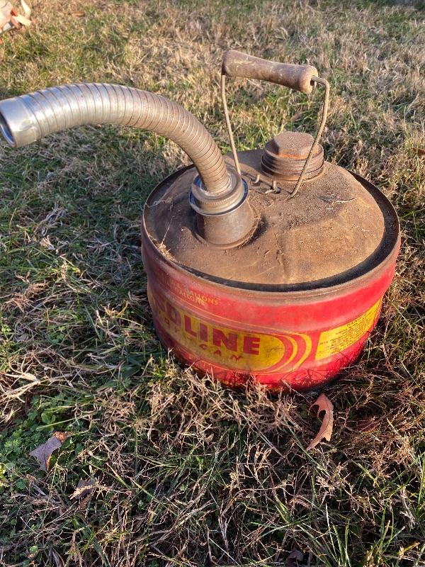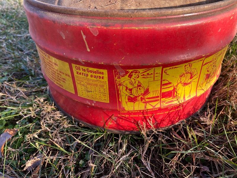 Vintage 2 1/2 g. Steel Gas Can Spout Wood Handle Great Graphics