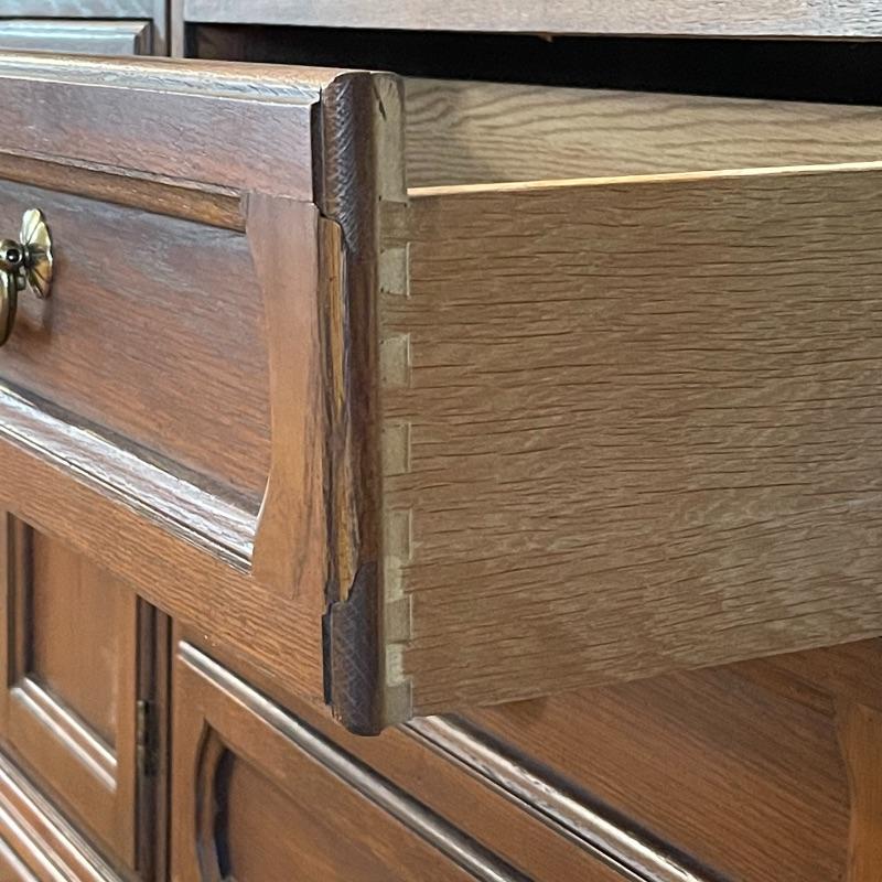 3 dovetail drawers. Enclosed lower storage with shelf. 1 adjustable shelf above.