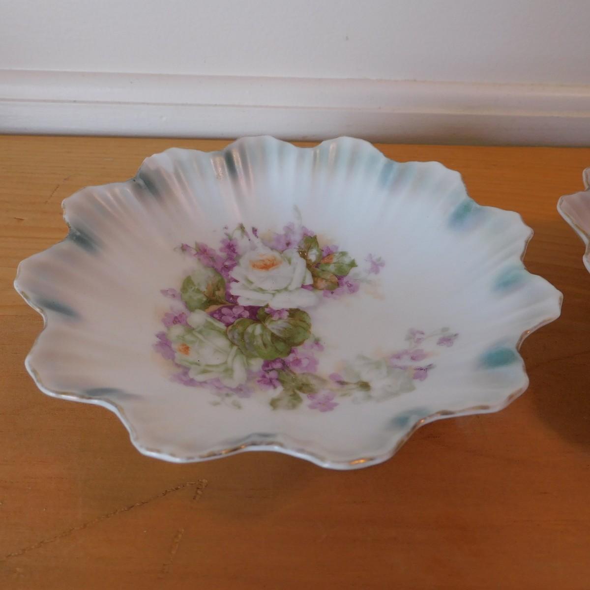 These plates are marked with Germany. They would make a nice candle holder or coin dish. Maybe you are missing a piece to a collection. OR maybe you want to start a collection but only want a couple of pieces... Here you go ! One has a chip (see pictures) The plates are 5" x 1 1/4".