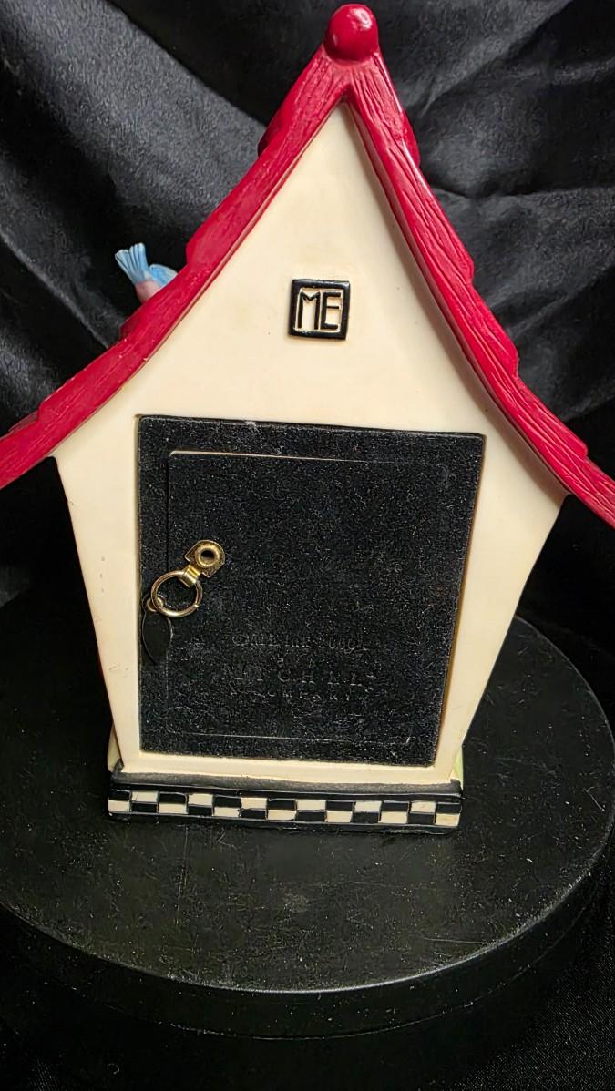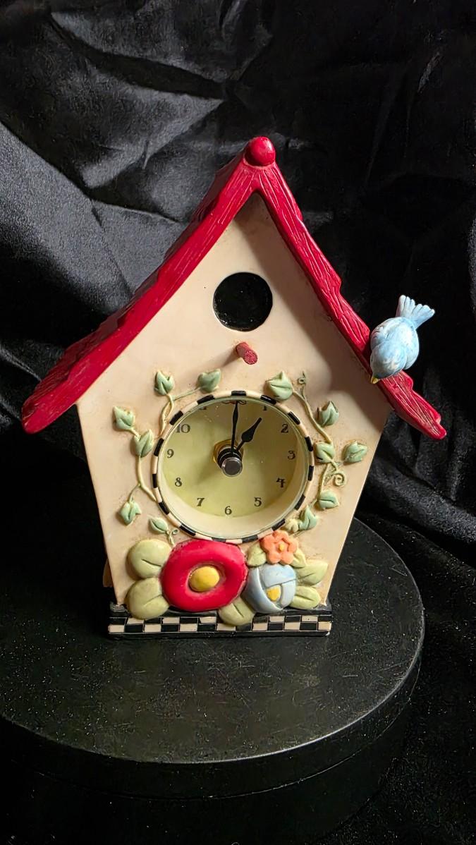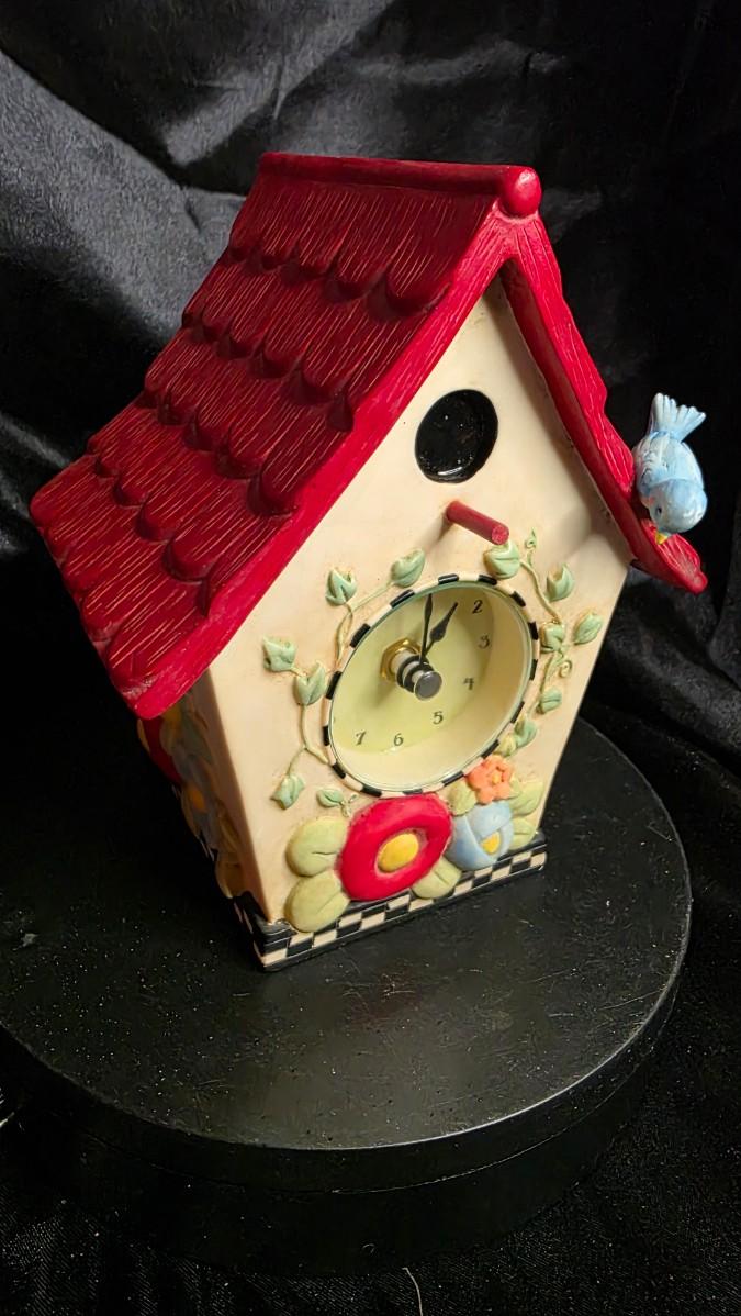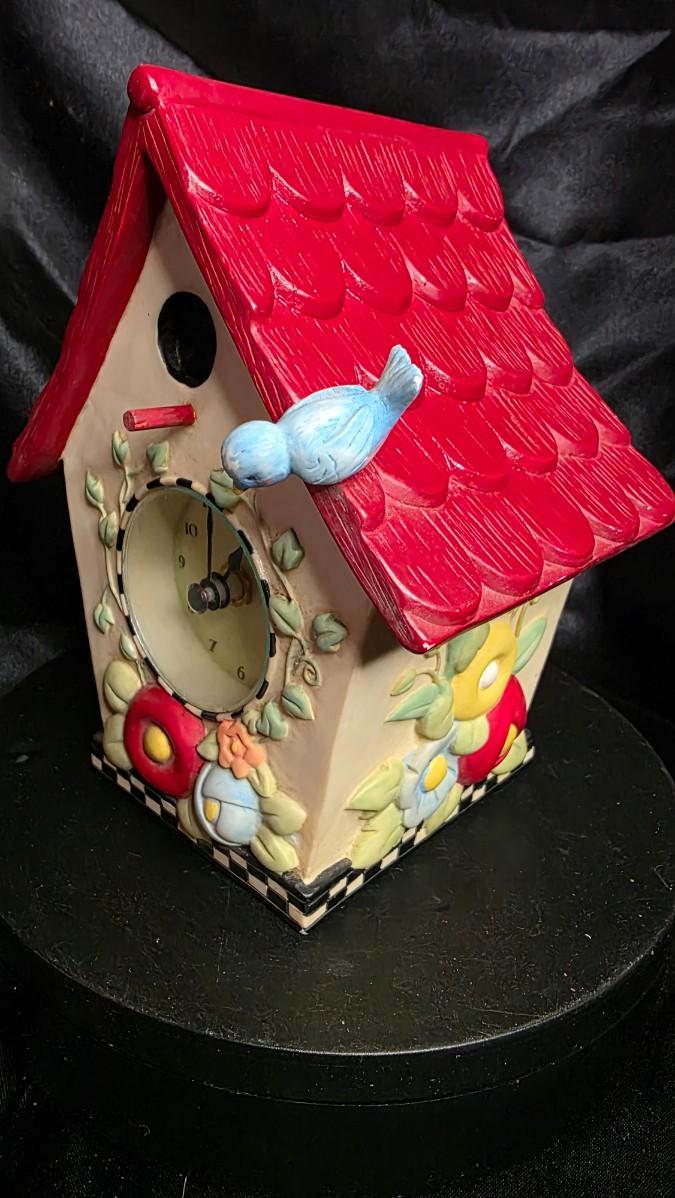 Vintage 2000 Michel & Company ME Ink Birdhouse Clock | Red Roof Floral Porcelain Design | Quartz Movement | Whimsical Cottage Decor Heirloom