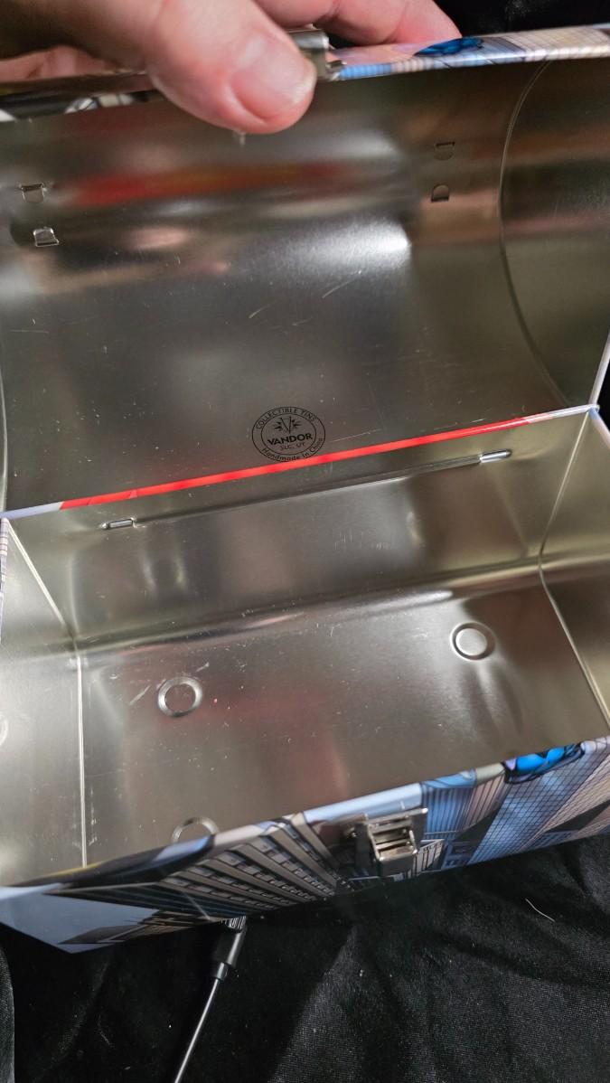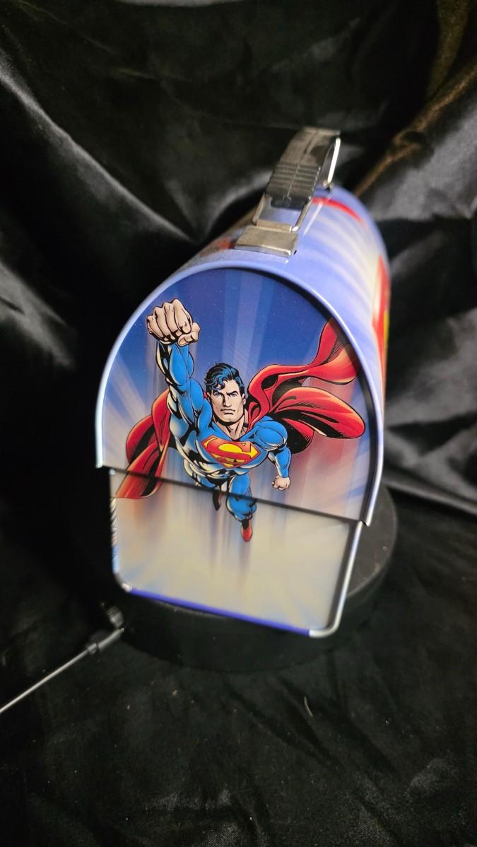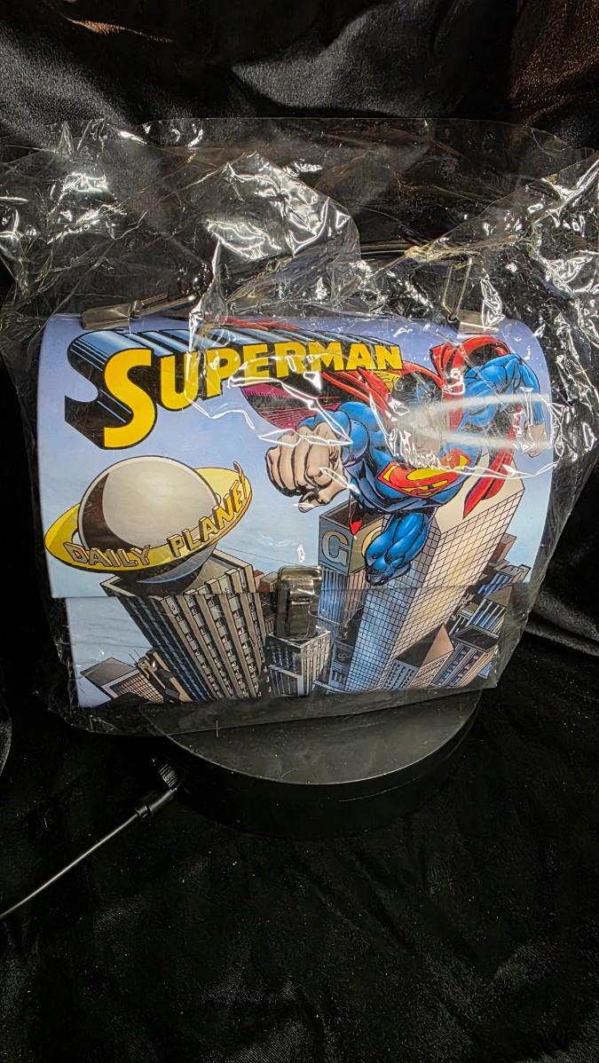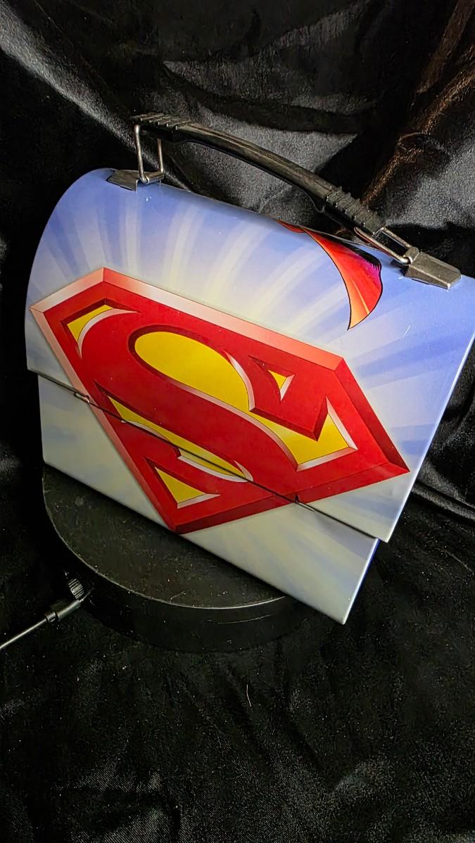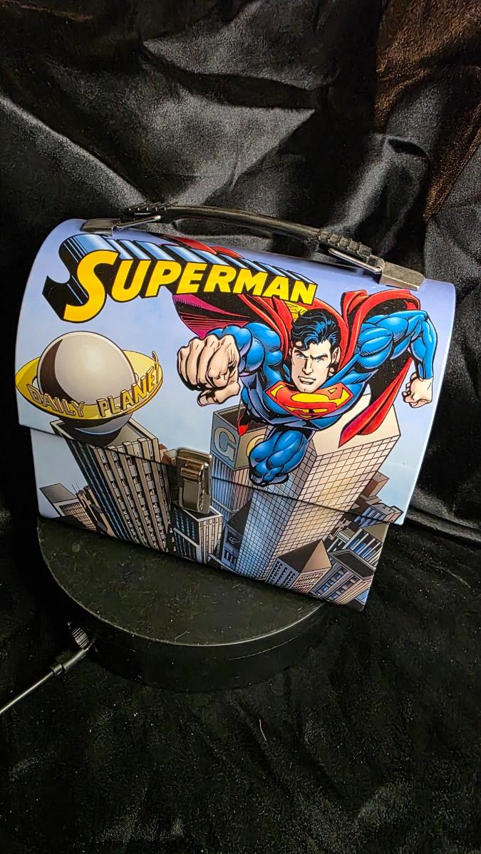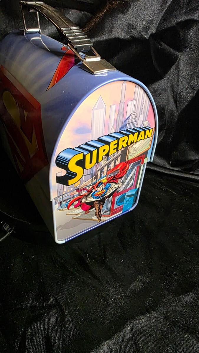 This isn't just tin; it's a portal to afternoons spent trading stickers and secrets, the metallic blue body gleaming with that unmistakable DC Comics vibrancy, the iconic "S" shield standing guard on the front like a badge of invincibility. The hinged lid snaps open with a satisfying click, revealing a spacious interior ready for sandwiches shaped like kryptonite or apples that could power a rocket to Smallville. A sturdy metal handle swings out for toting triumphs, and the embossed details—from the towering skyscrapers to the dynamic pose of Clark Kent's alter ego—make every glance a panel from the pages of Action Comics.