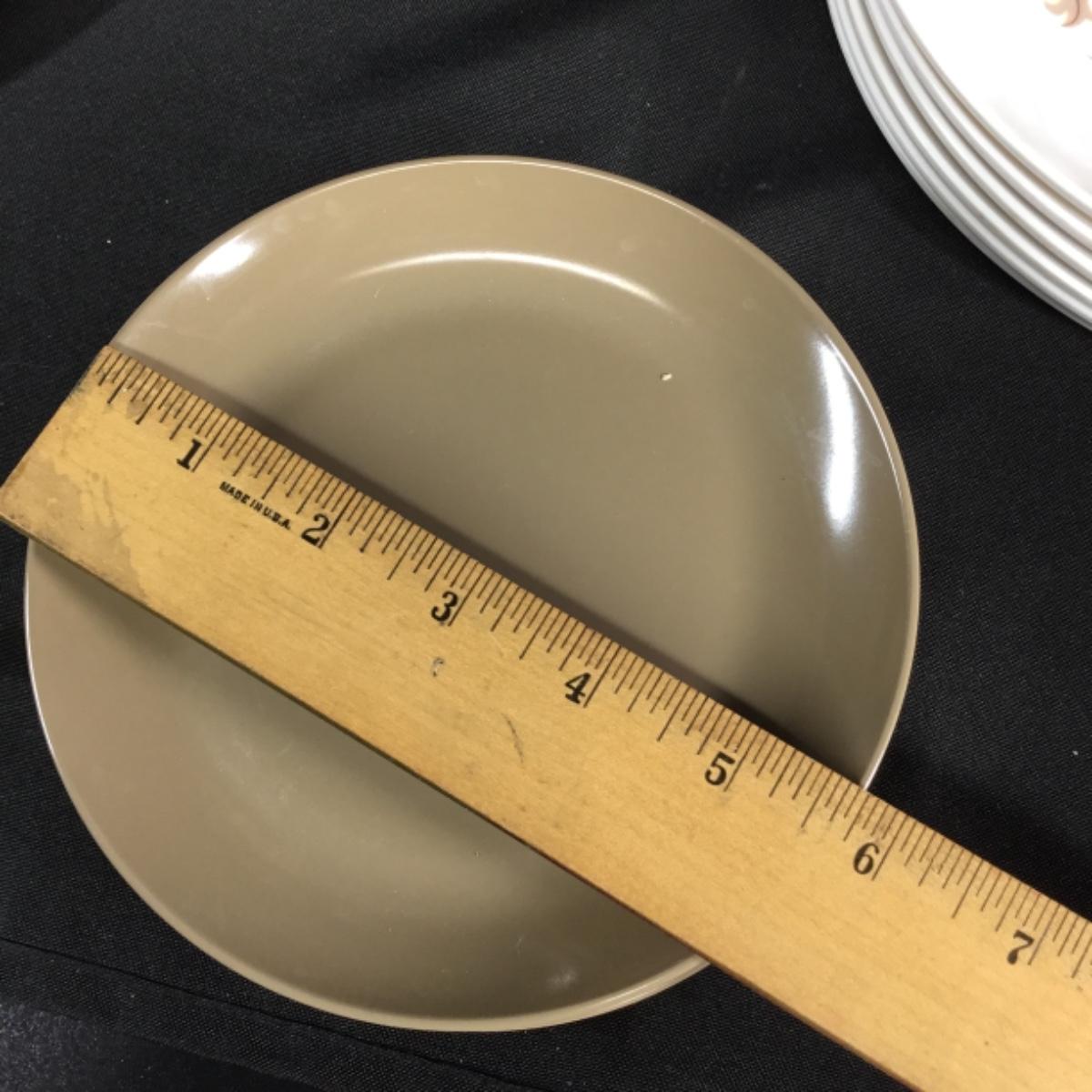 Up for auction is a vintage set of melmac plates and a cup made by Somerset. Included is one serving tray, six dinner plates, 12 dessert plates, and one mug. See pictures.