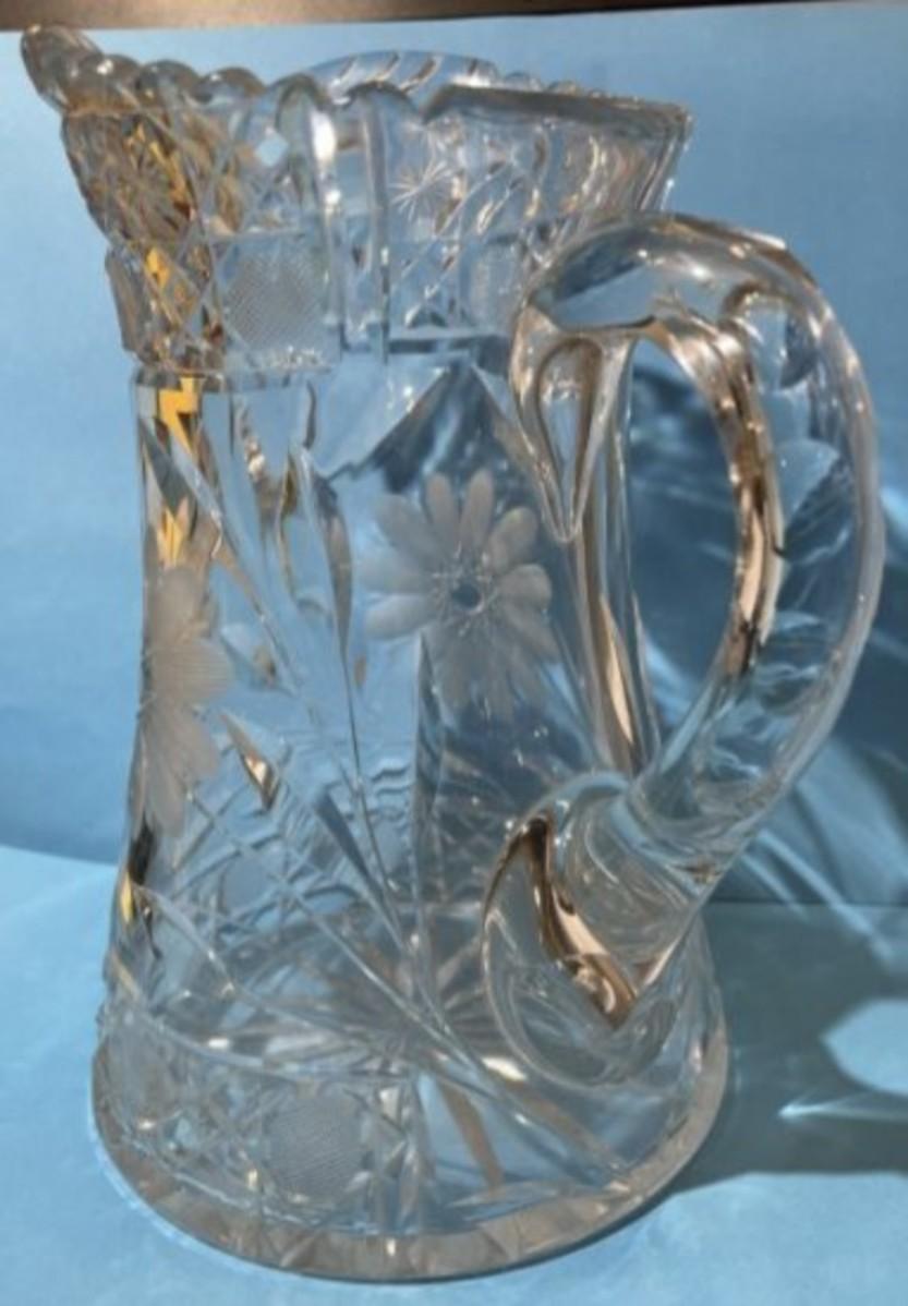Vintage 20th Century Etched Glass Crystal PITCHER Approx 7" Tall in Good Preowned Condition.