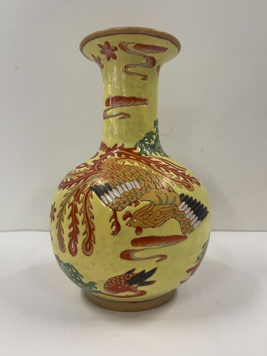 Vintage 20th Century Hand Painted Chinese Yellow Vase with Dragon Pattern. Very good condition, no chips, cracks or repairs. Approximately 9" tall. # 1143