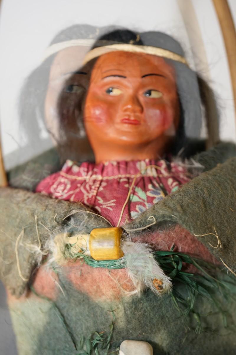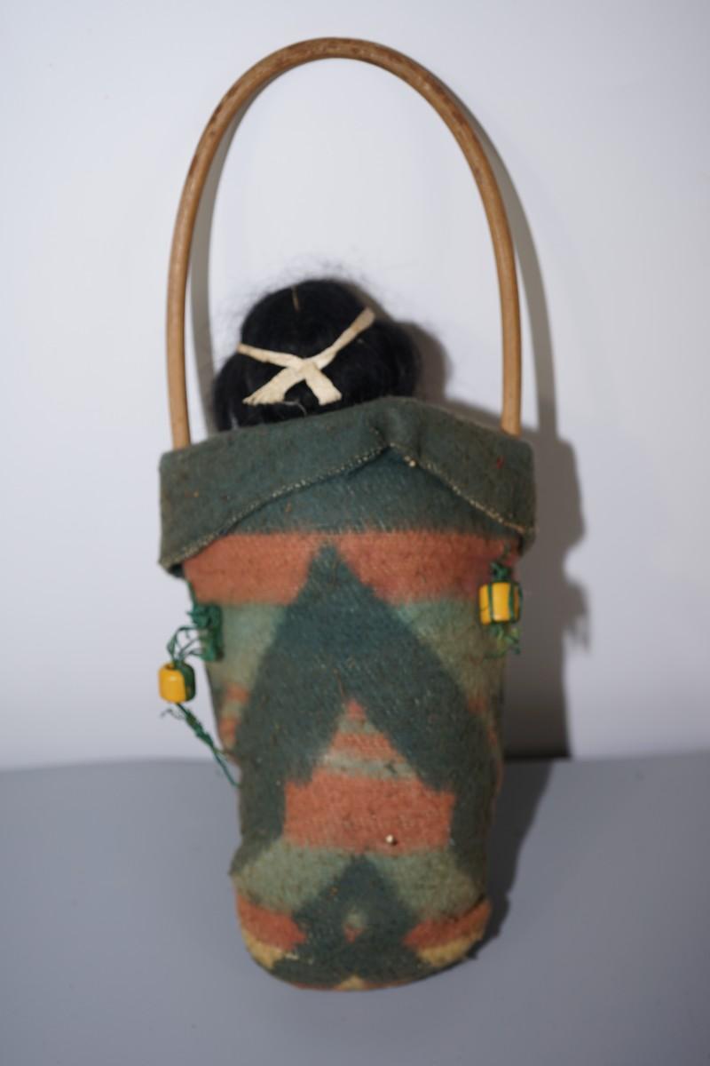 wrapped in piece of camp blanket is this celluoid face skookum doll.