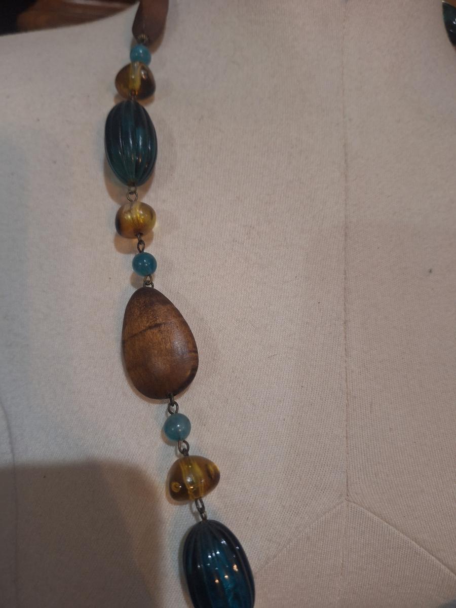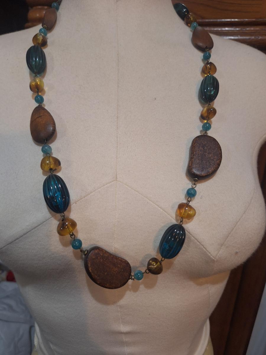 vintage 22” necklace with ceramic and glass beads in blue, black, gold, green, and brown