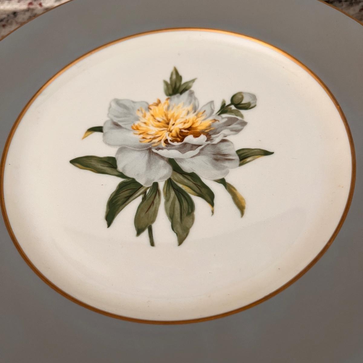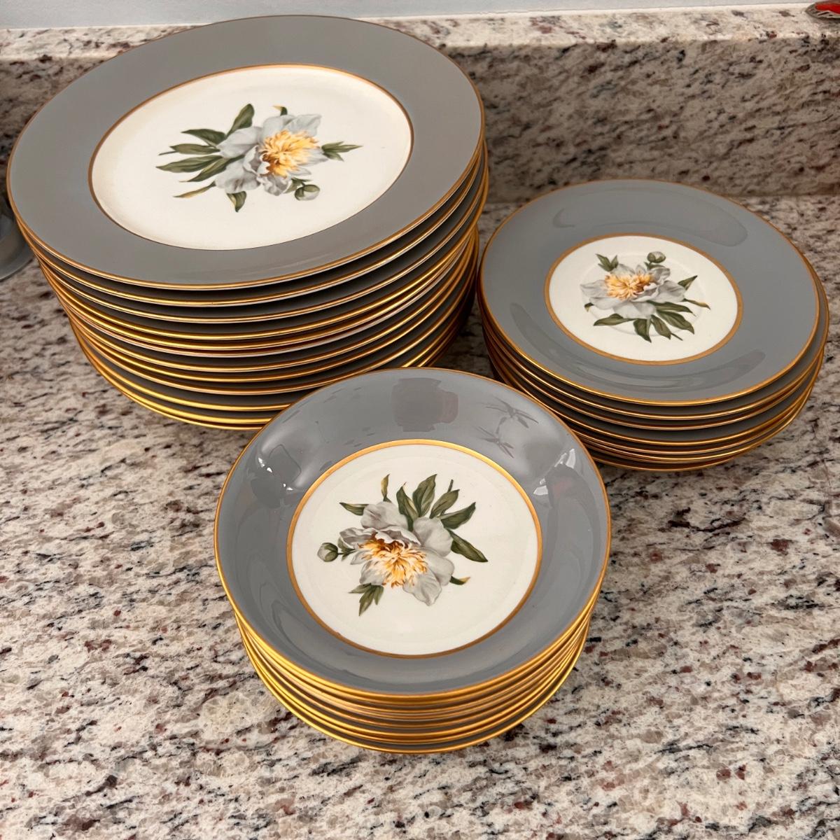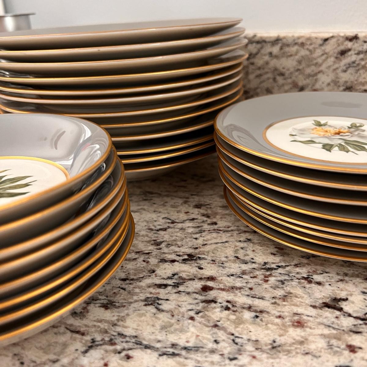 12 plates, 8 bowls, 8 tea cup plates. Excellent condition. Pattern is Golden Peony.