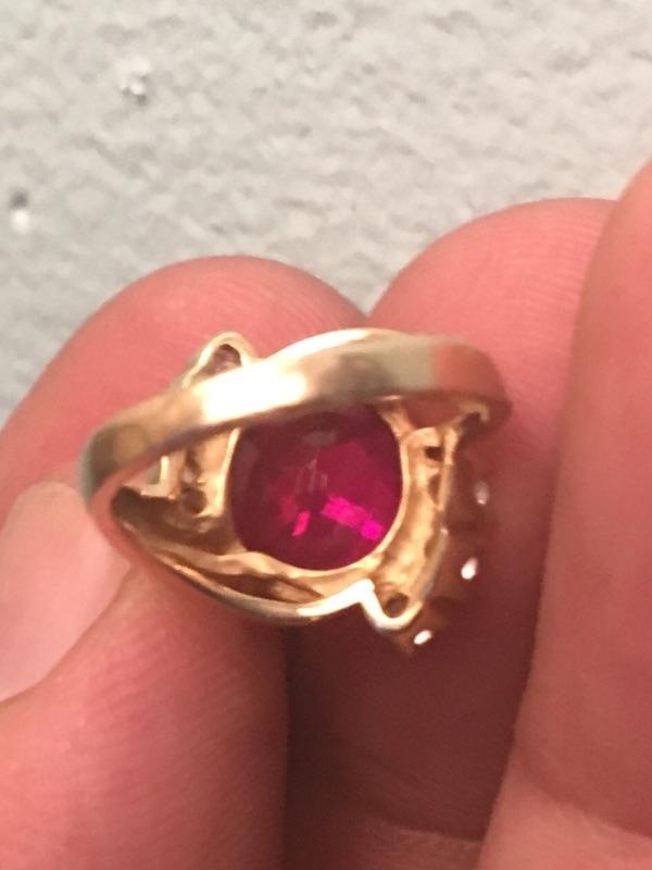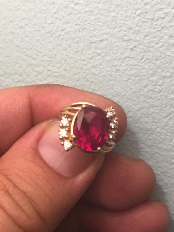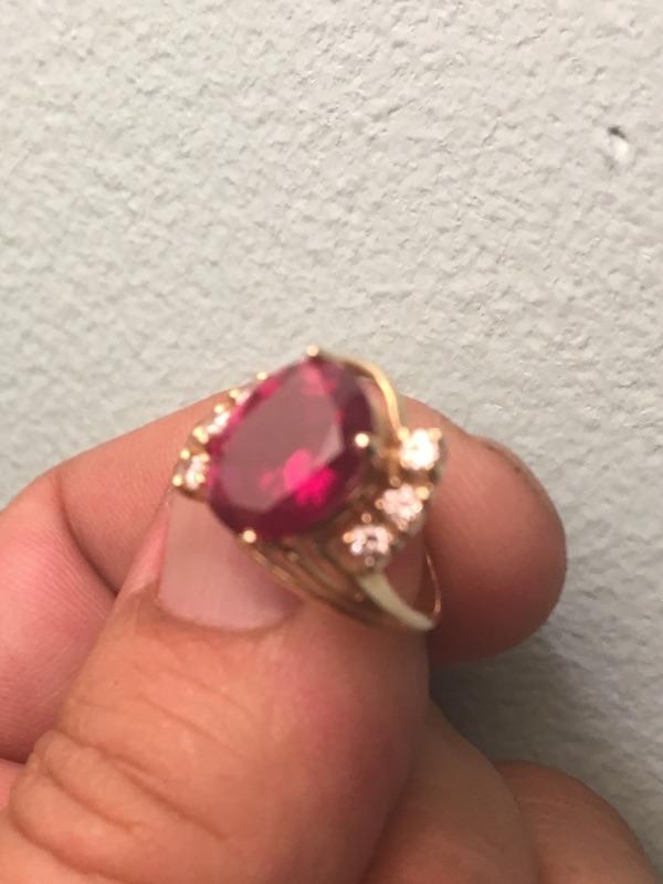 Oval ruby is approx 3 carats, set in 14k yellow gold. Weighs 3 grams. Size is 2.5.