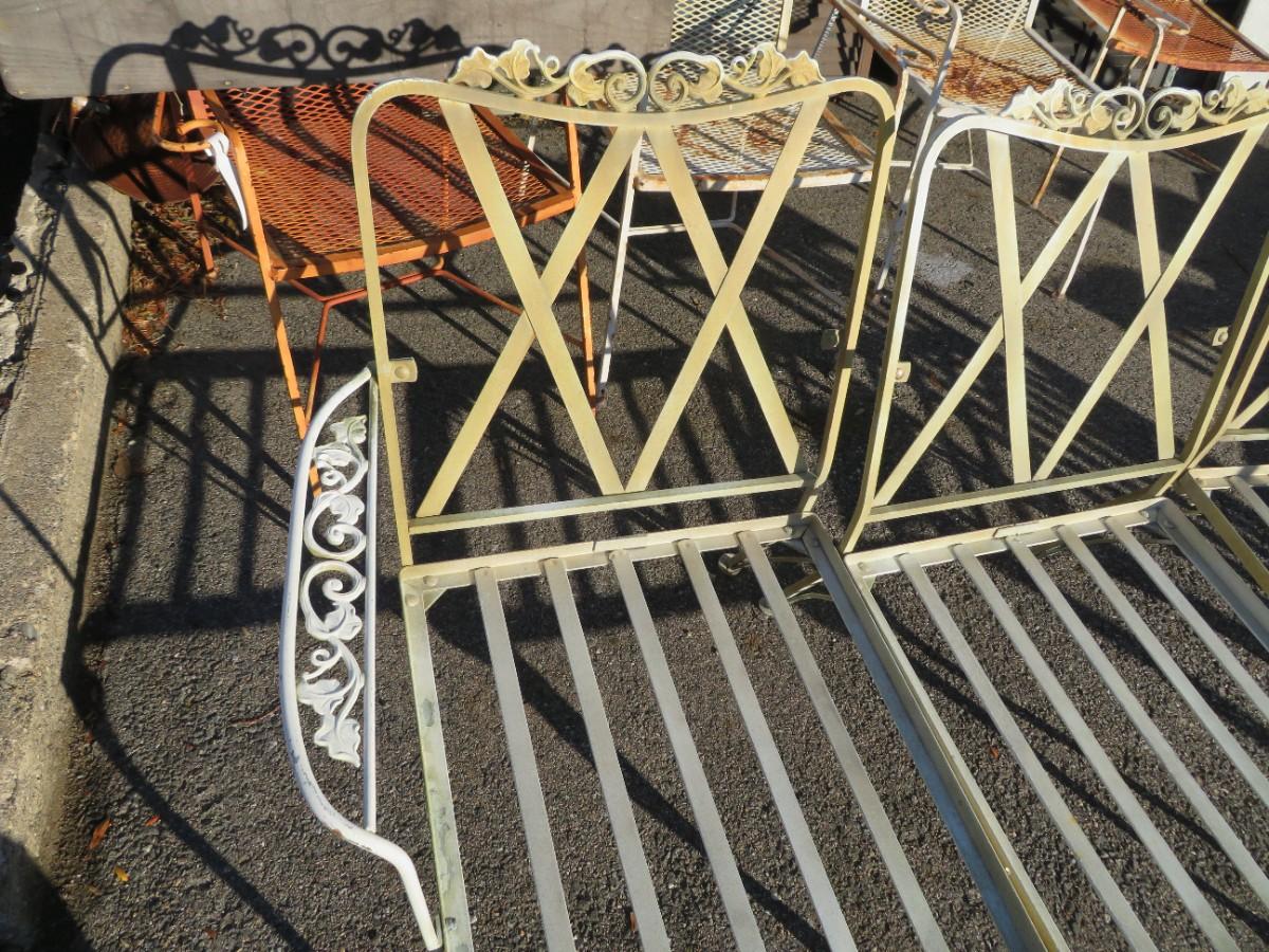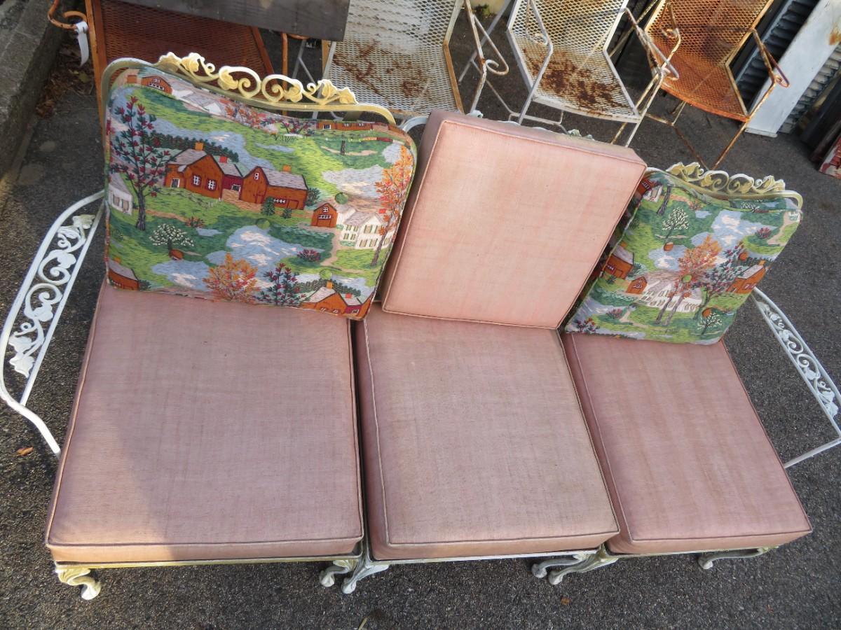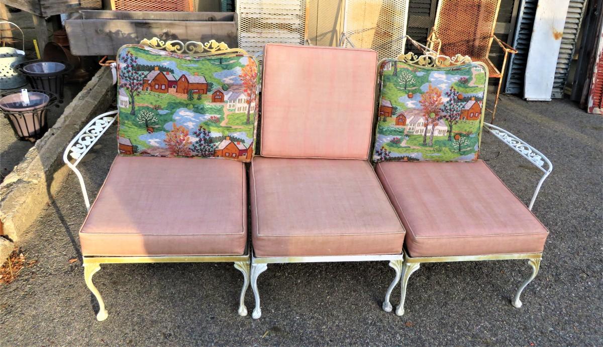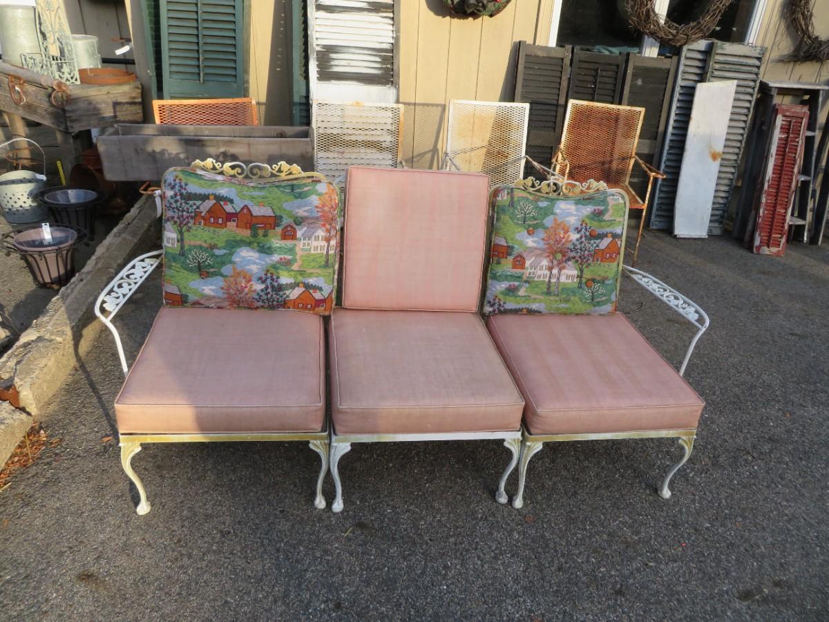 Rare White / Gold finish Outdoor Patio & Garden 3 piece Wrought Iron Sectional Couch Chairs with 4 Pink Cushions and 2 Grandma Moses fabric Cushions..