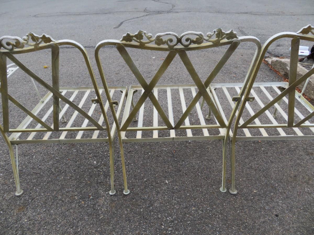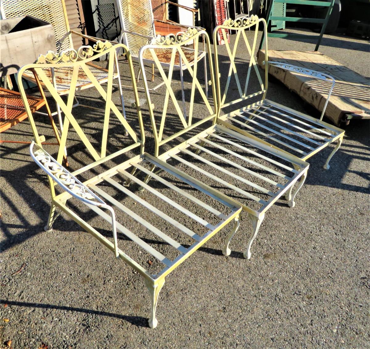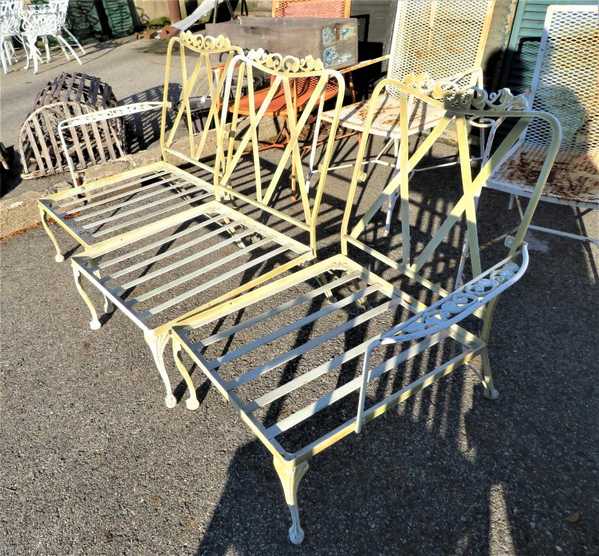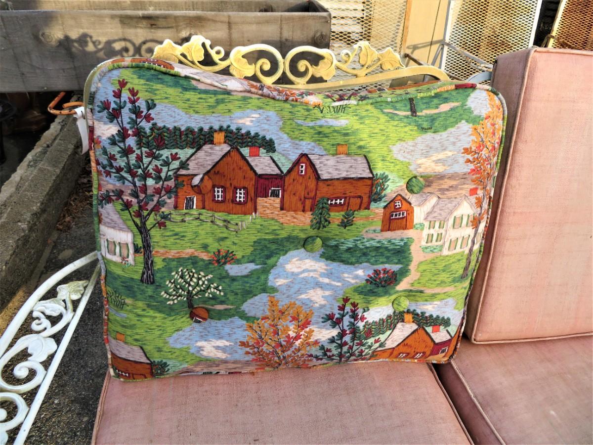 Rare White / Gold finish Outdoor Patio & Garden 3 piece Wrought Iron Sectional Couch Chairs with 4 Pink Cushions and 2 Grandma Moses fabric Cushions..