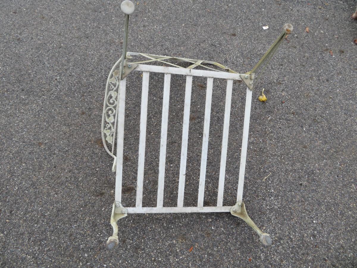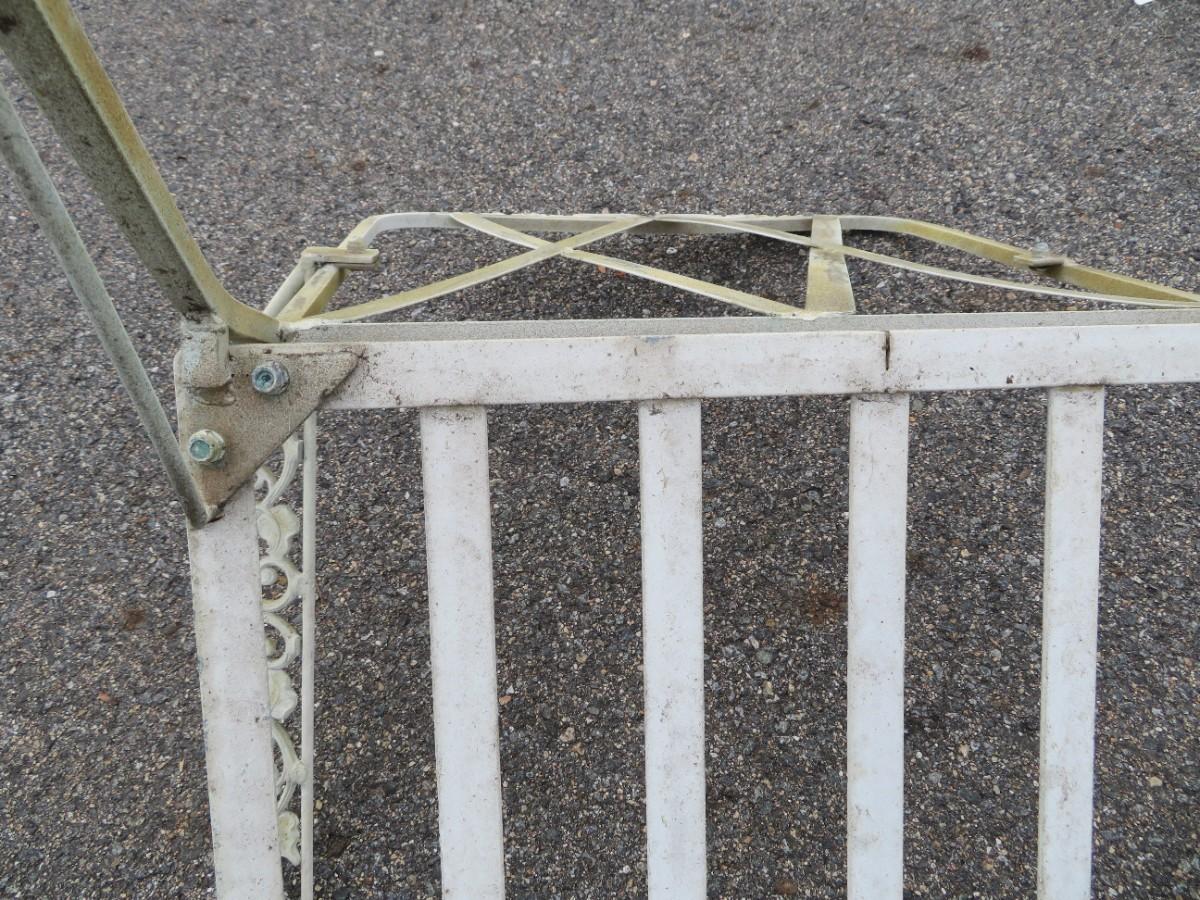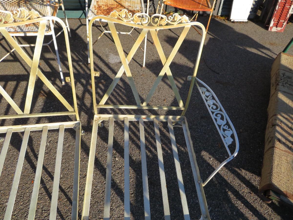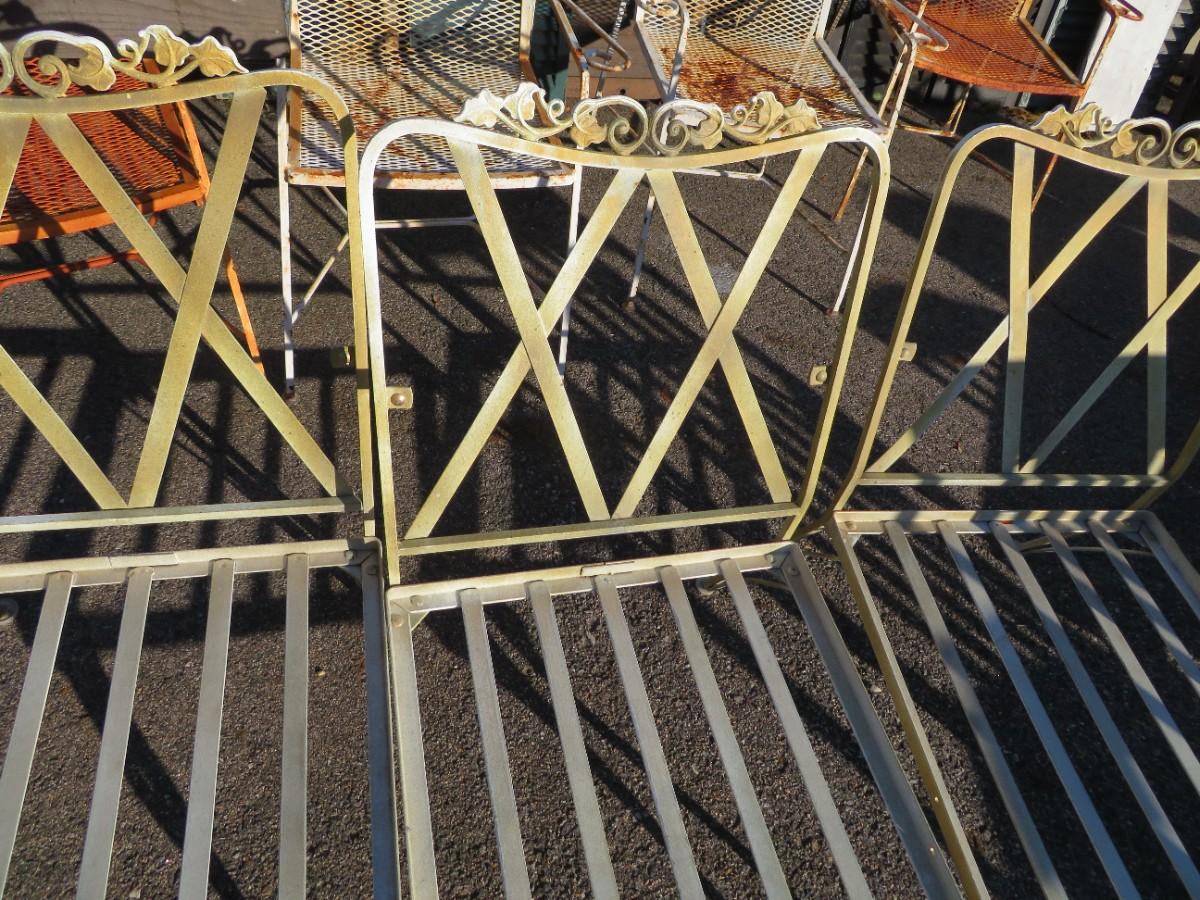 Rare White / Gold finish Outdoor Patio & Garden 3 piece Wrought Iron Sectional Couch Chairs with 4 Pink Cushions and 2 Grandma Moses fabric Cushions..