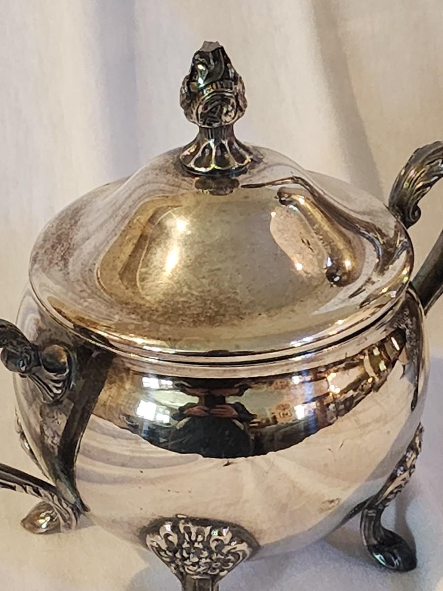 No manufacturer markings. Light to moderate tarnish, easily polished. Tip of sugar bowl is chipped, as shown in photos