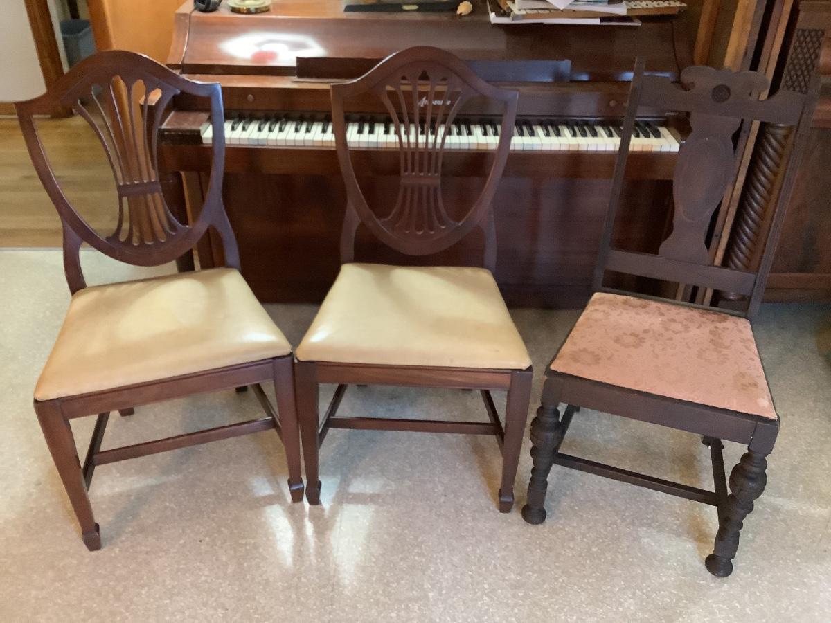 Vintage 3 solid wooden chairs, 1 fiddler back, 2 shield back