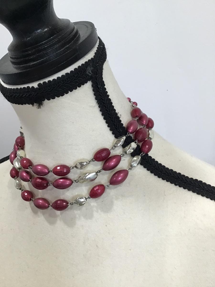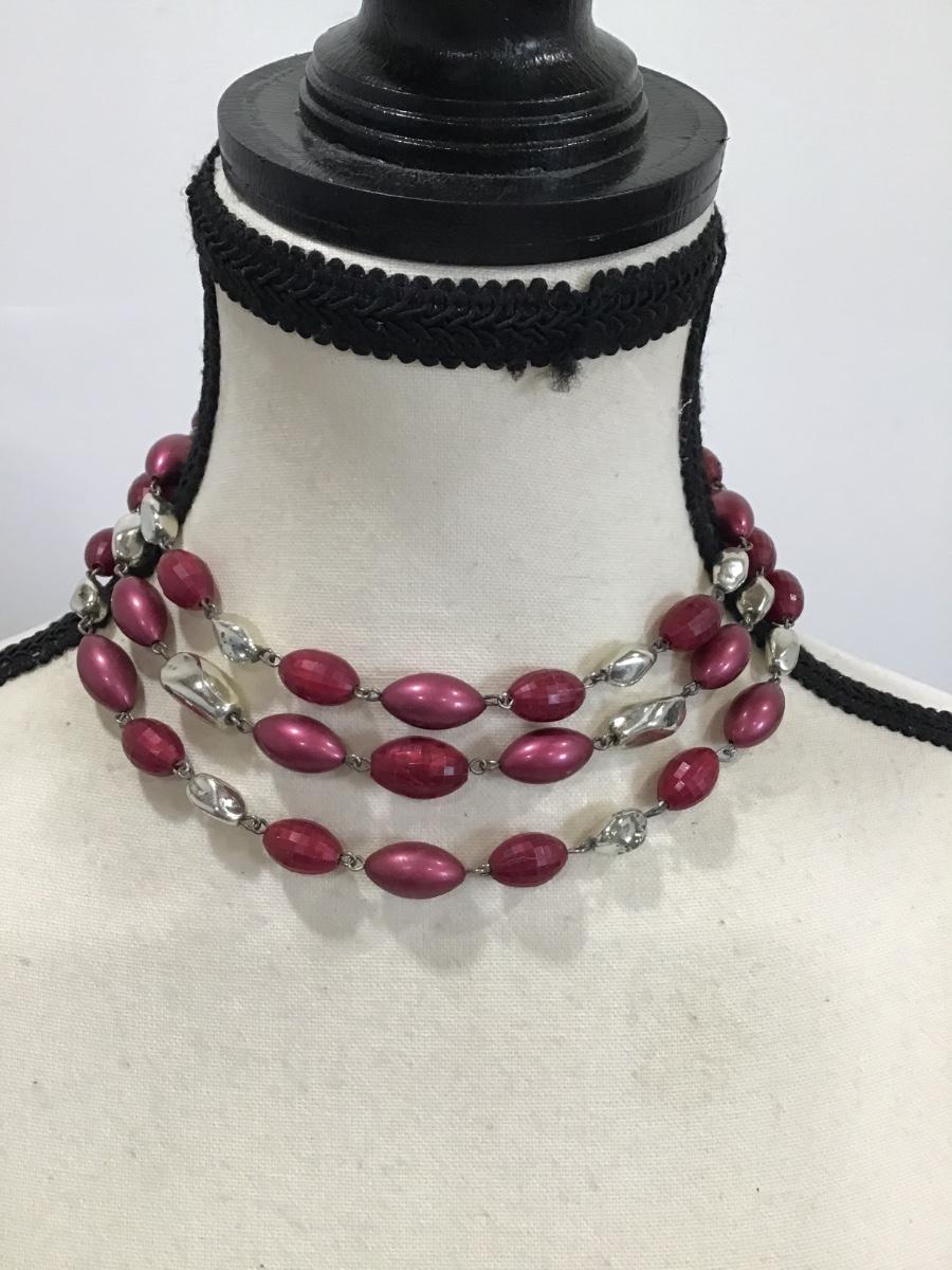 Vintage 3 Strand Necklace Cranberry and Silver Tones