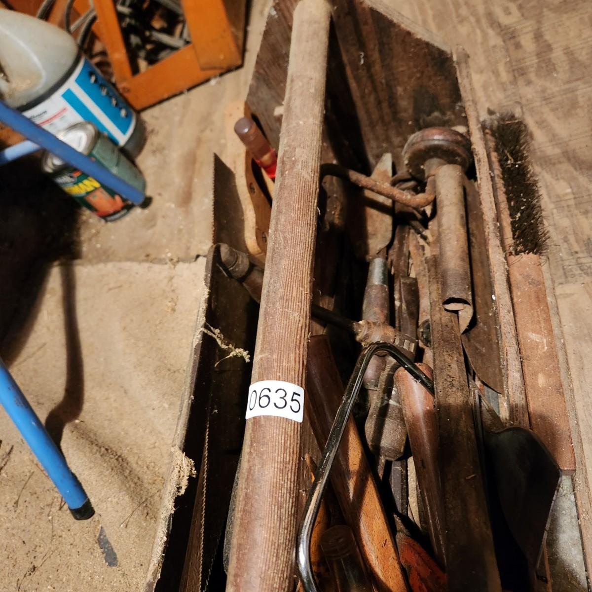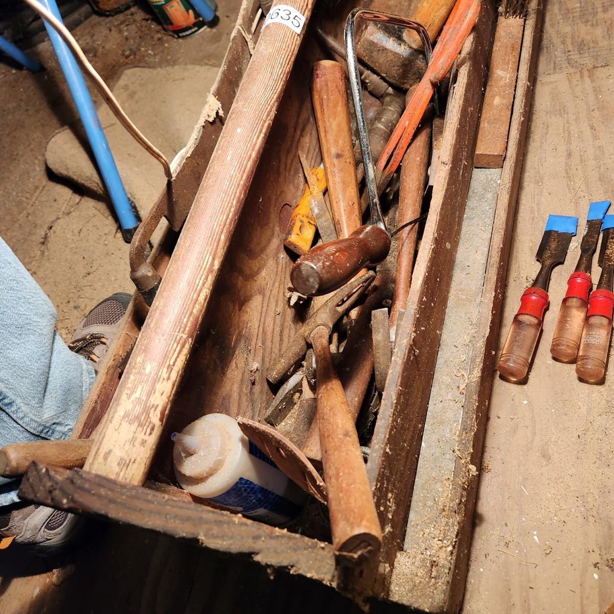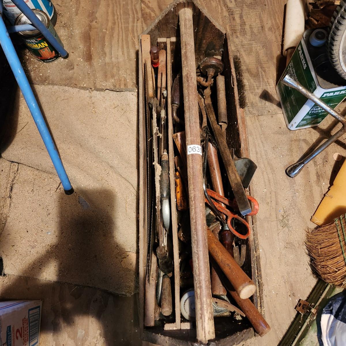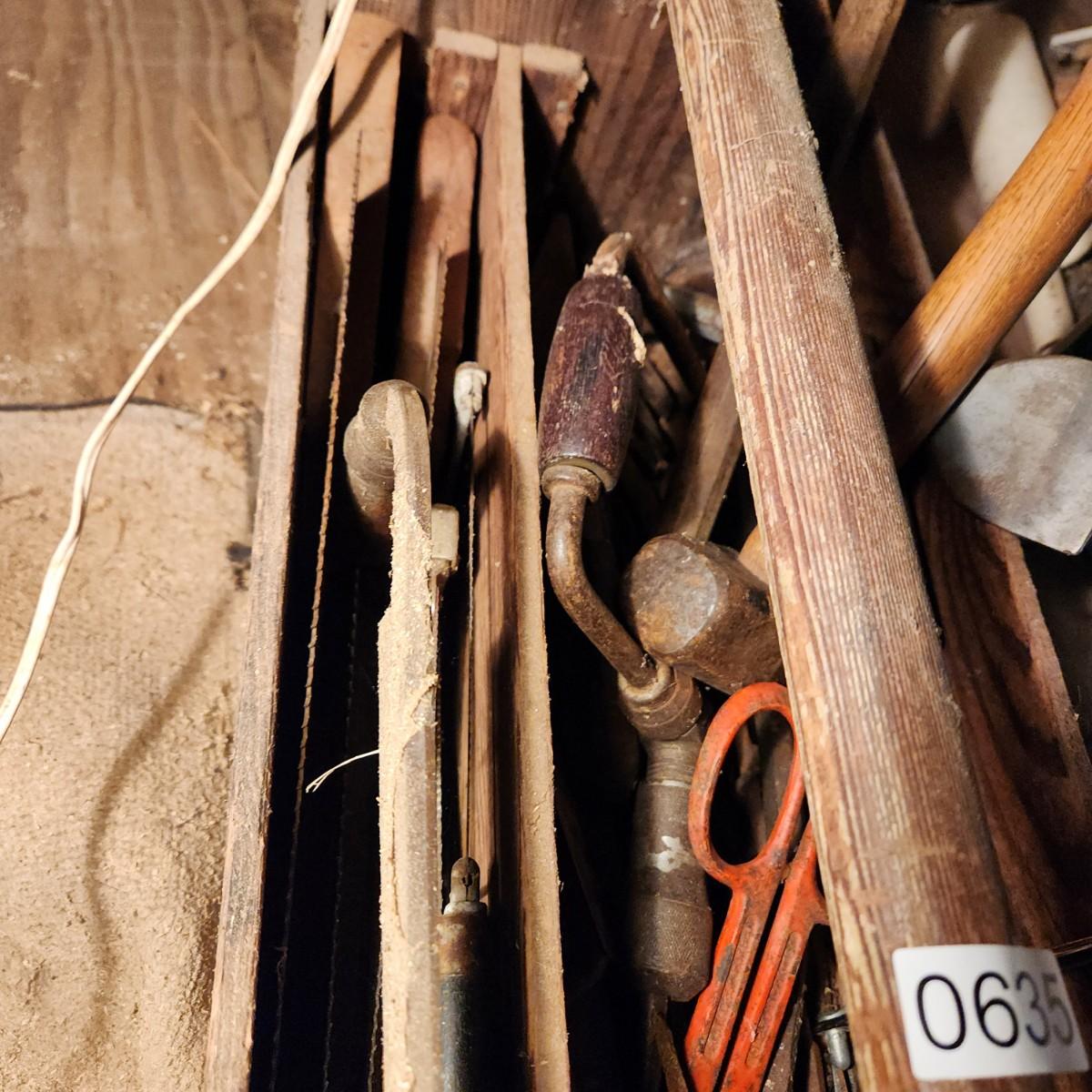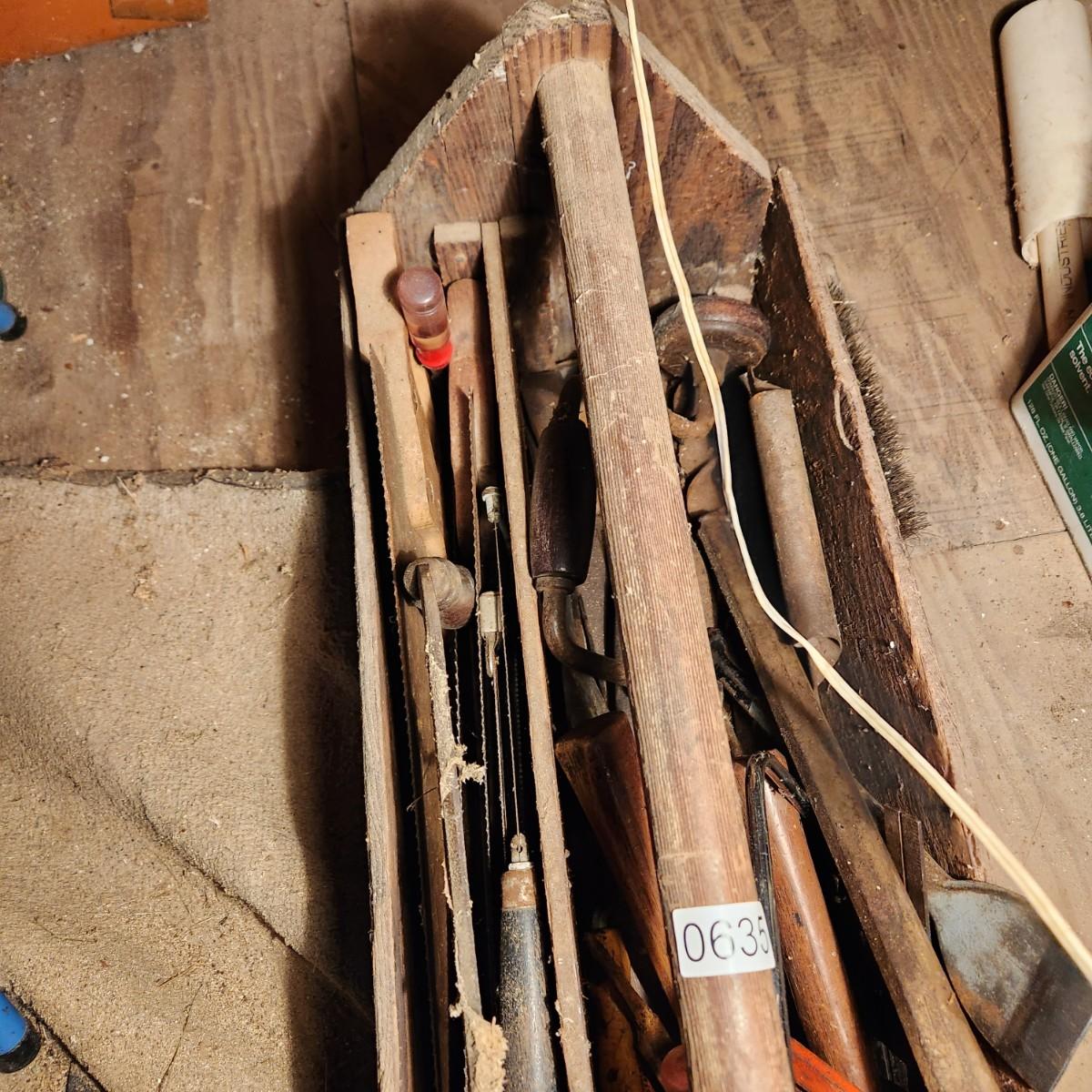 Vintage 30" Wooden Tool box loaded with saws, Hammers, Pulls, and more Lot 635