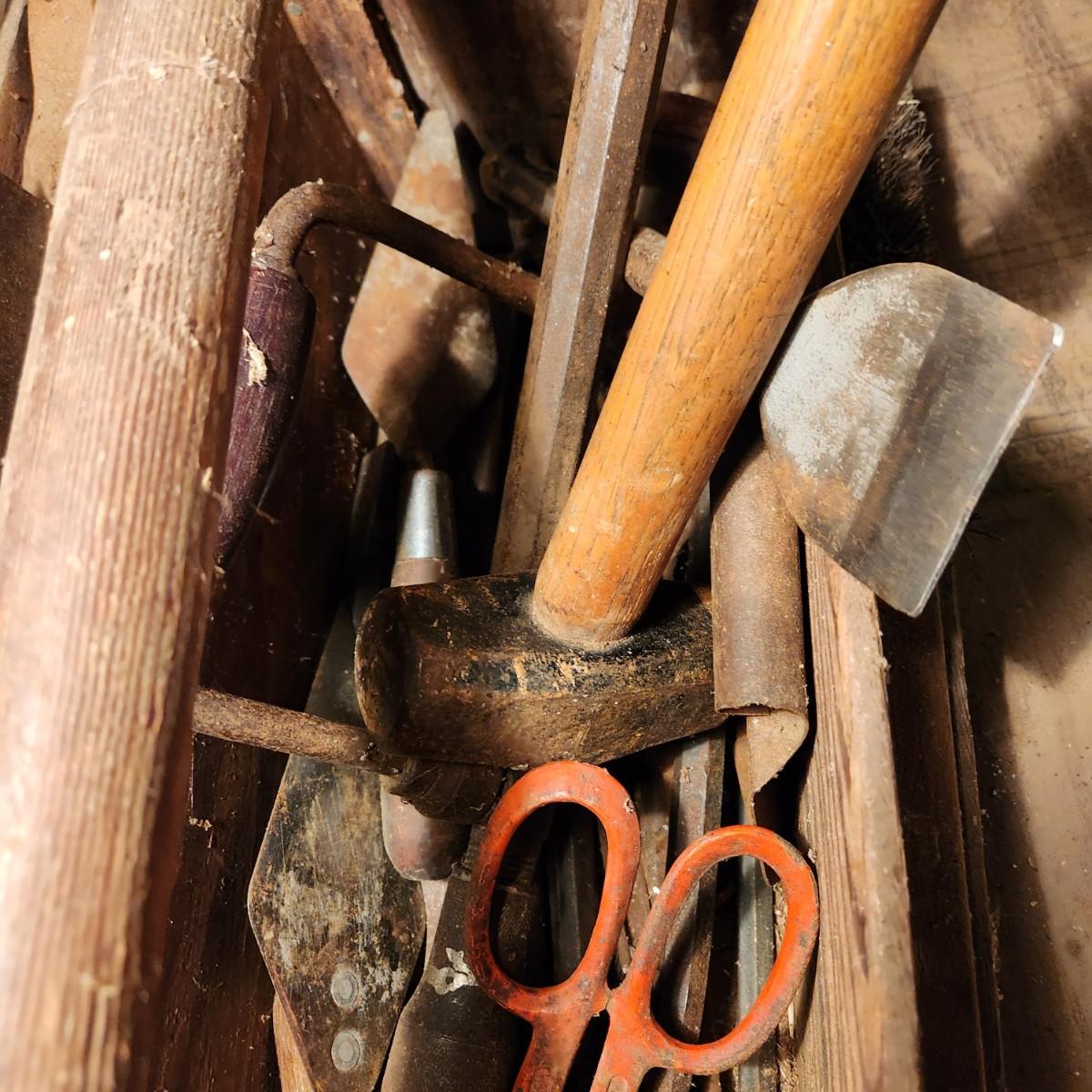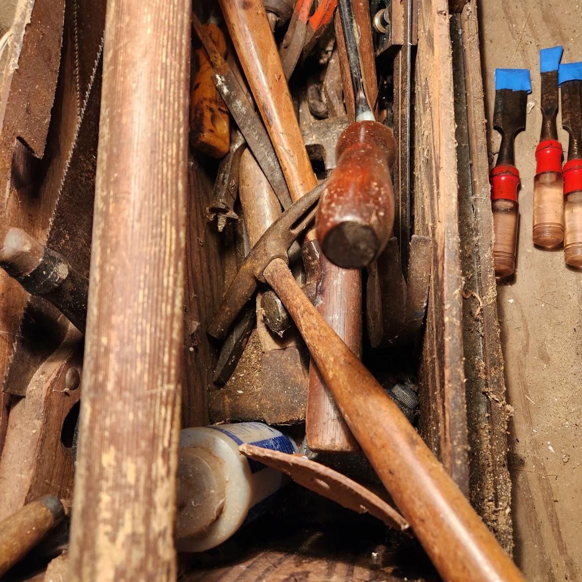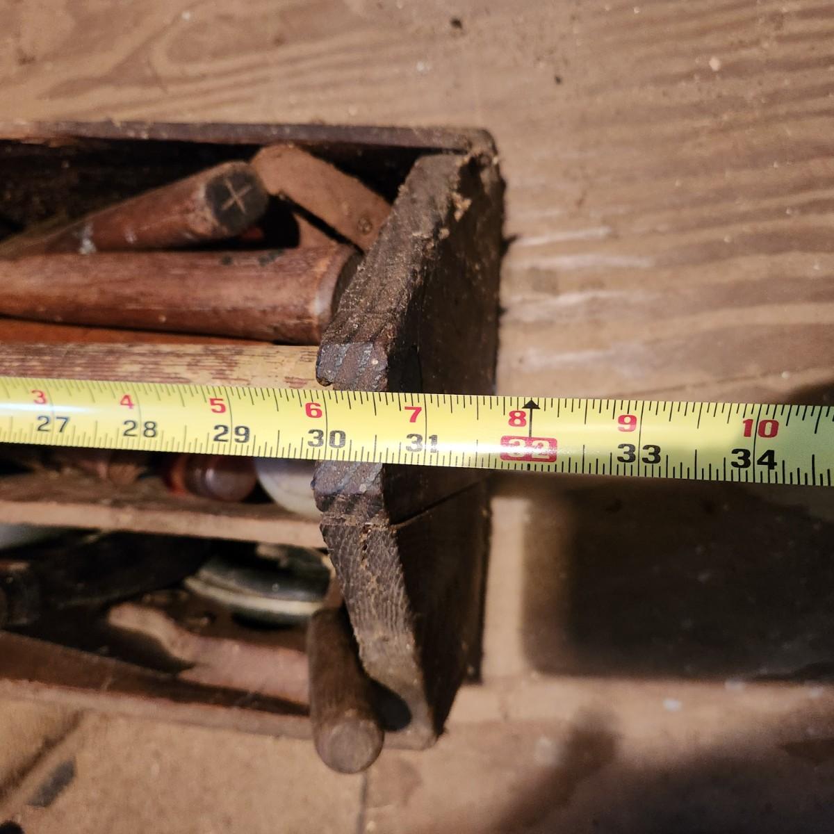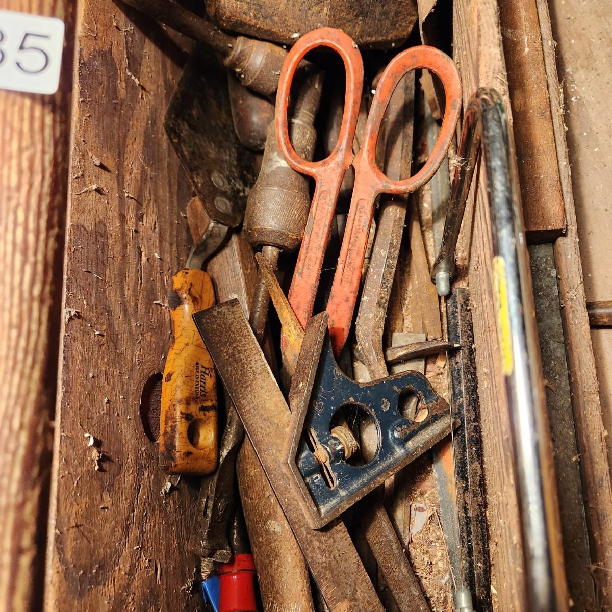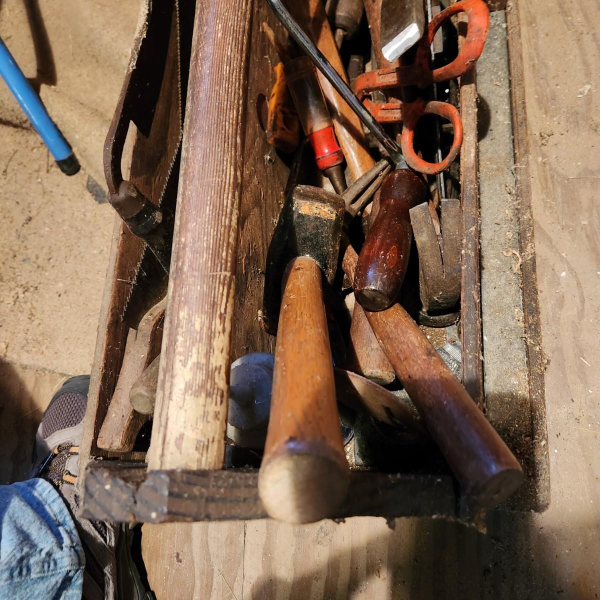 Vintage 30" Wooden Tool box loaded with saws, Hammers, Pulls, and more Lot 635