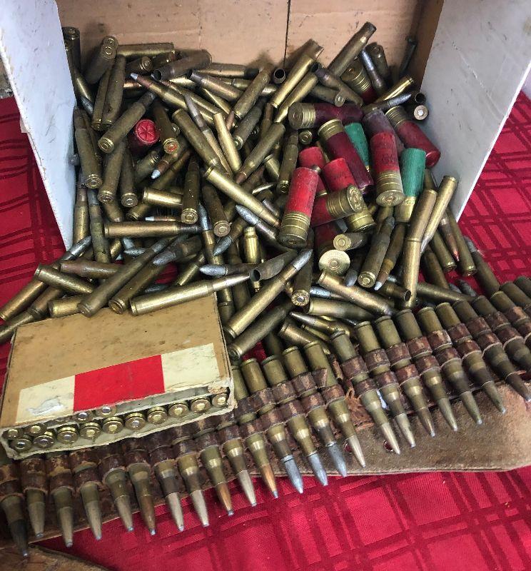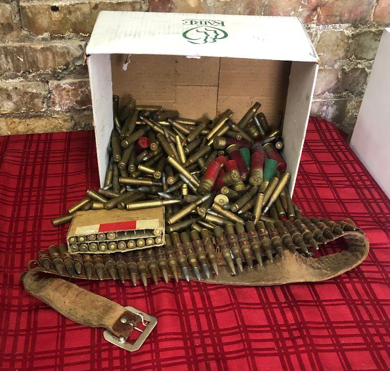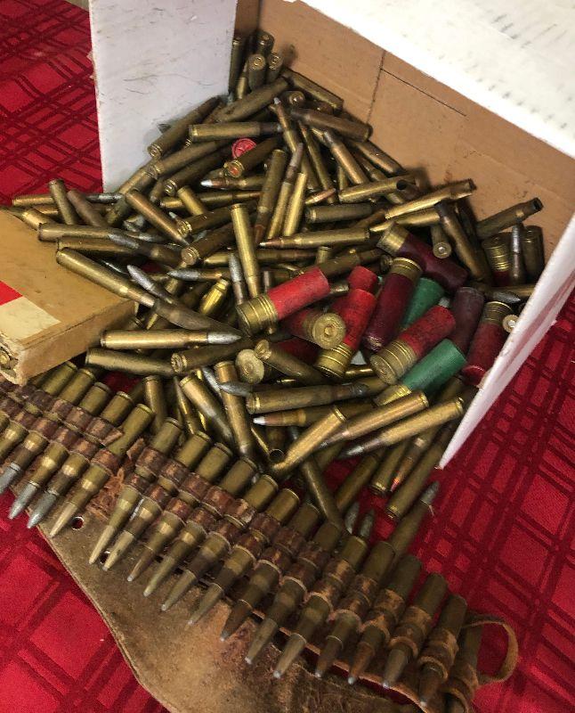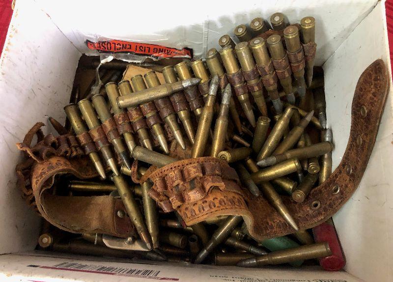 With an old leather bandolier here is a box of vintage 30-06 rifle ammo and some shotgun shells too...as shown...