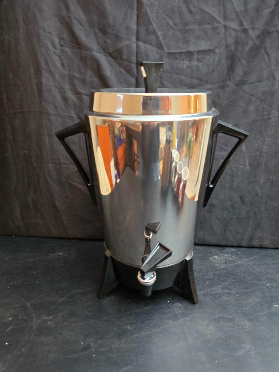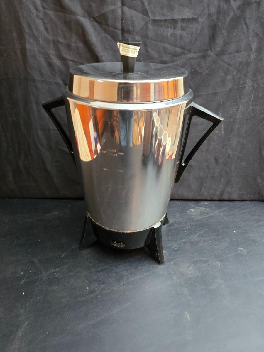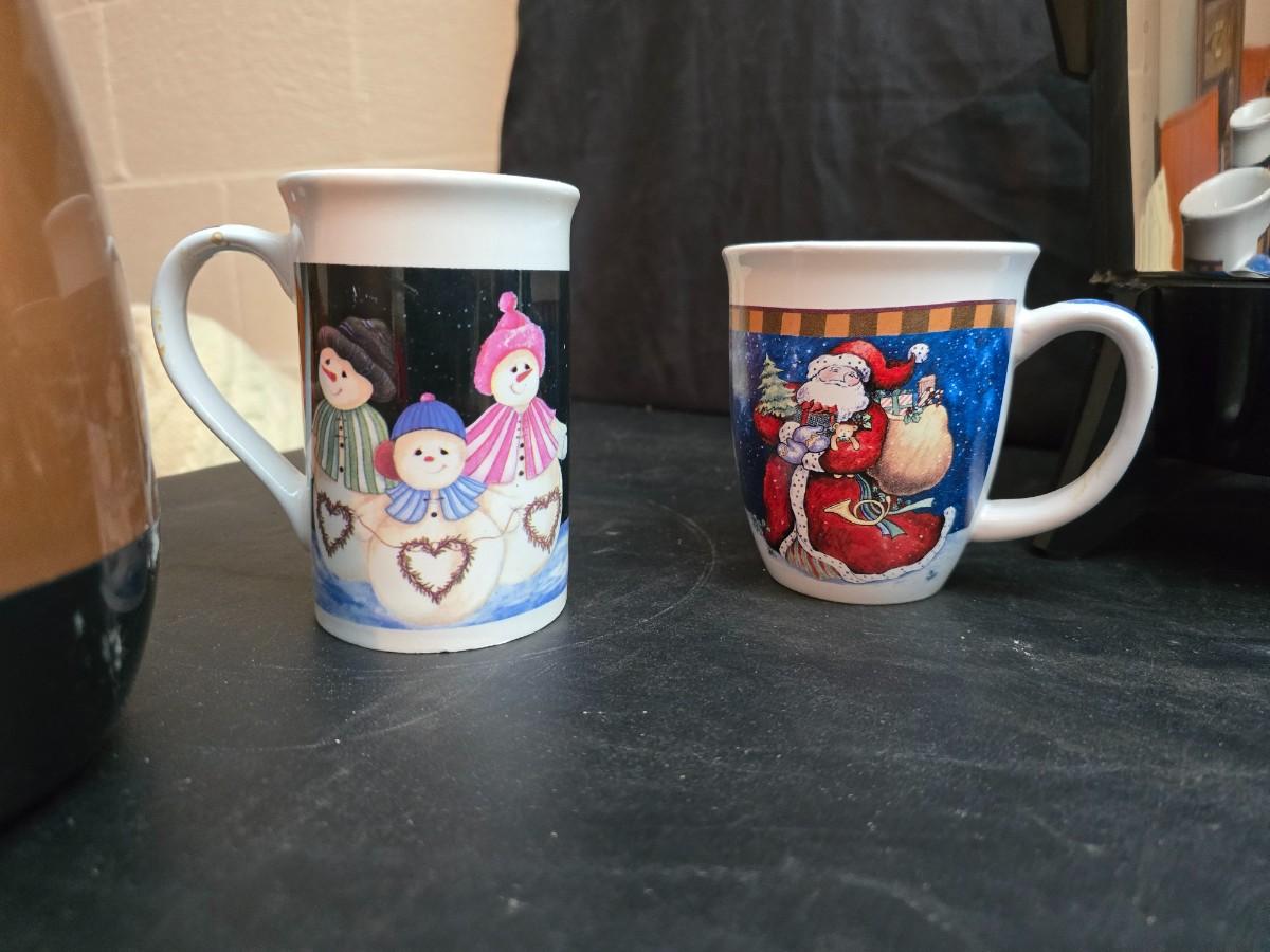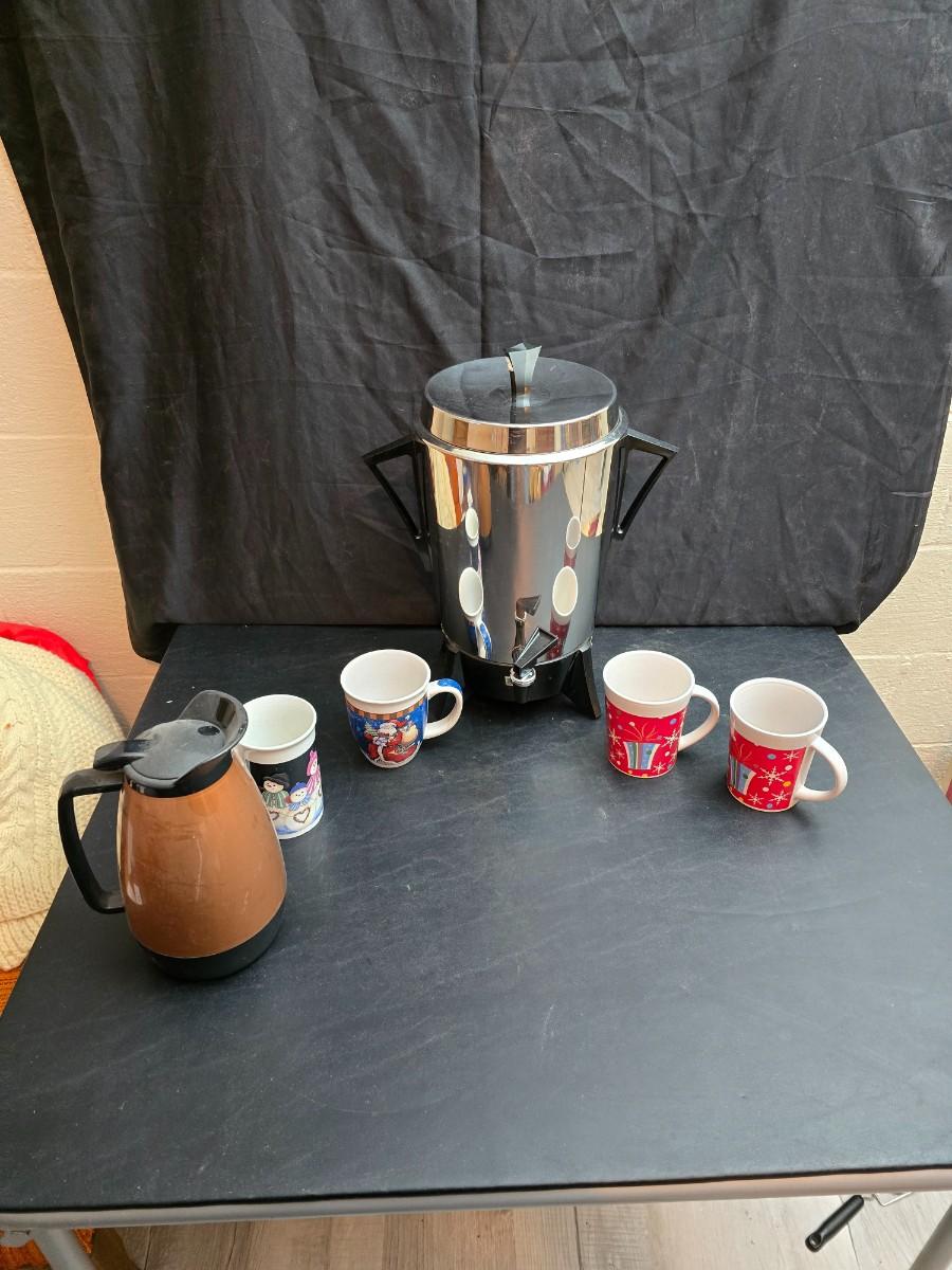 Vintage 30-cup party size Sunbeam coffee percolator, Model AP-Y & a Vtg Classic Carafe Insulated 36 oz with a collection of Christmas mugs