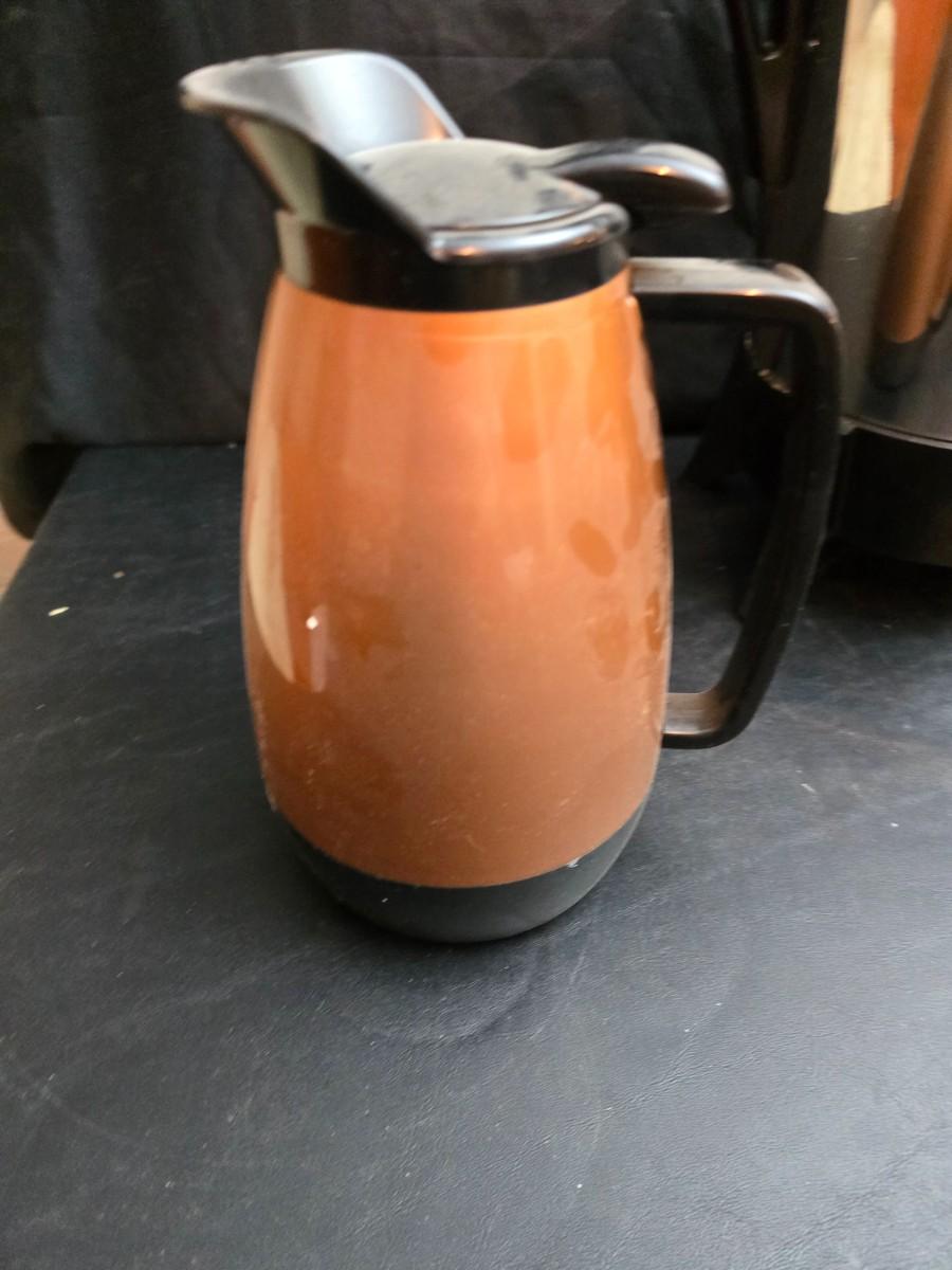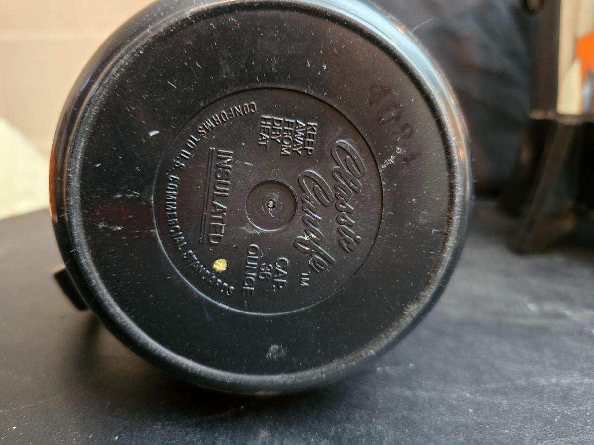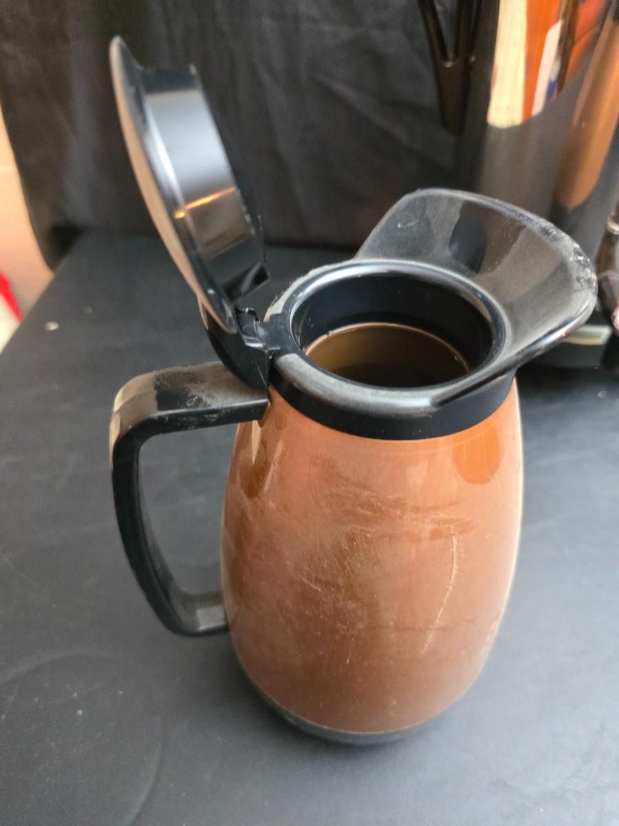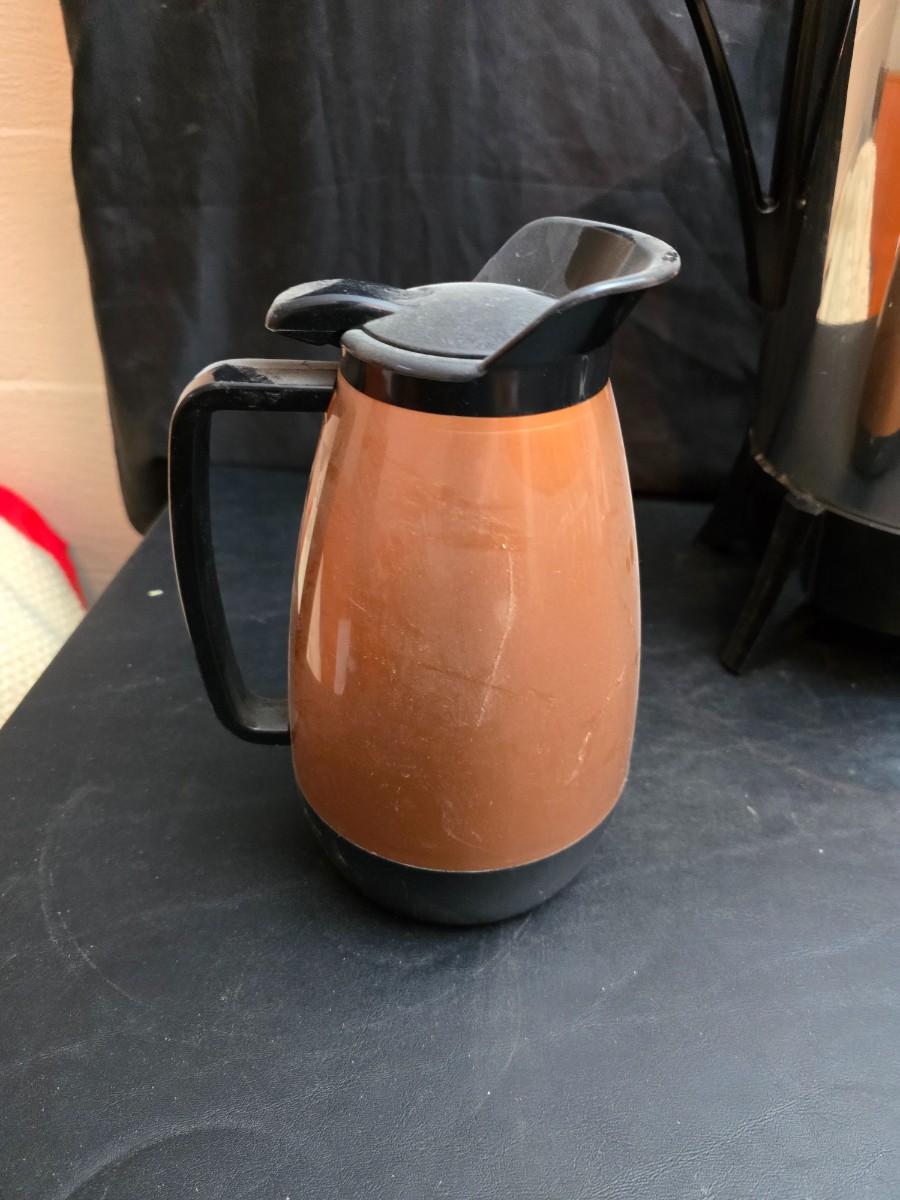 Vintage 30-cup party size Sunbeam coffee percolator, Model AP-Y & a Vtg Classic Carafe Insulated 36 oz with a collection of Christmas mugs