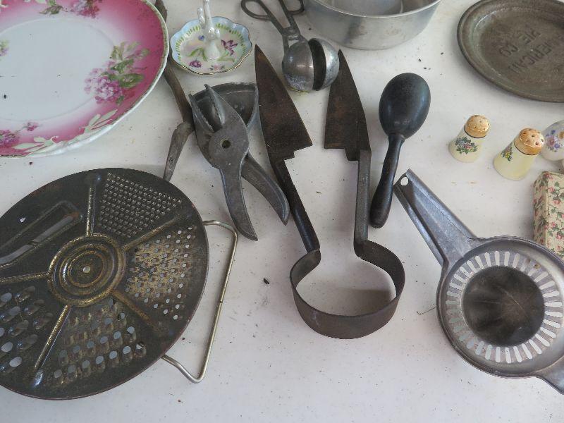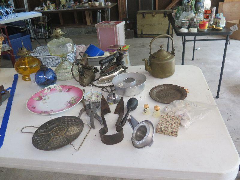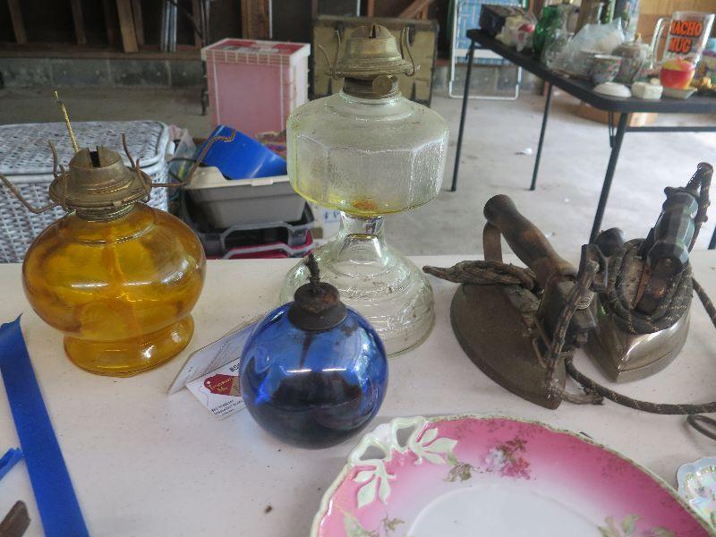 Glass hurricane lamps, vintage irons, tea kettle, and more. Bring box for removing items.